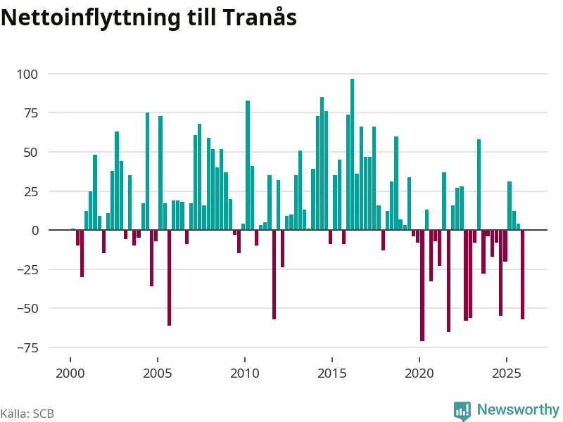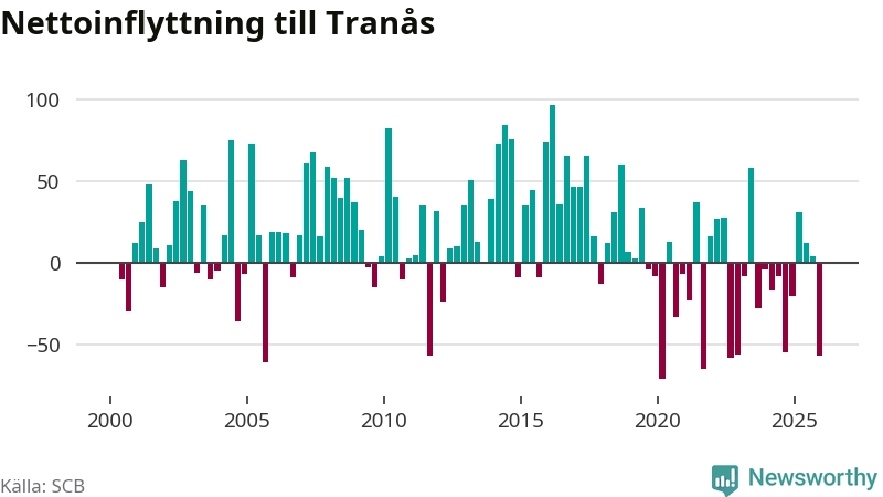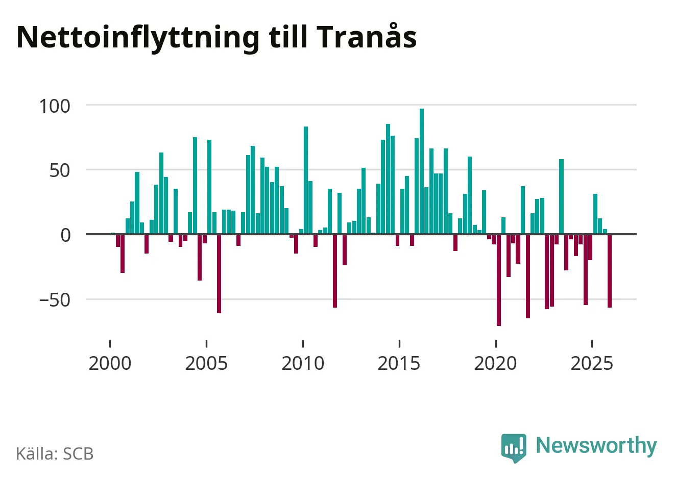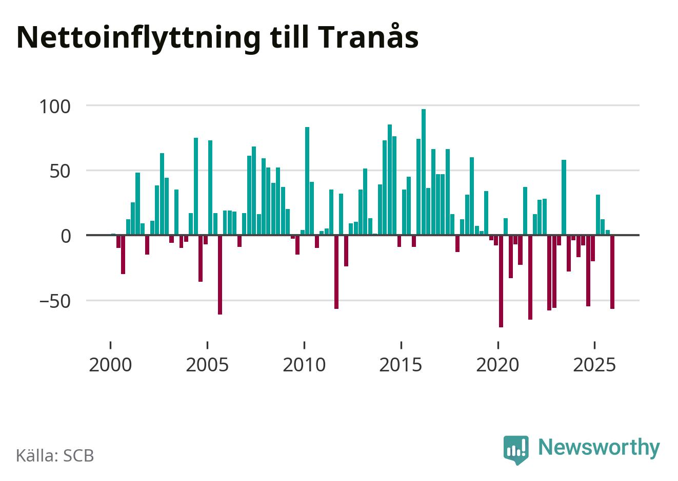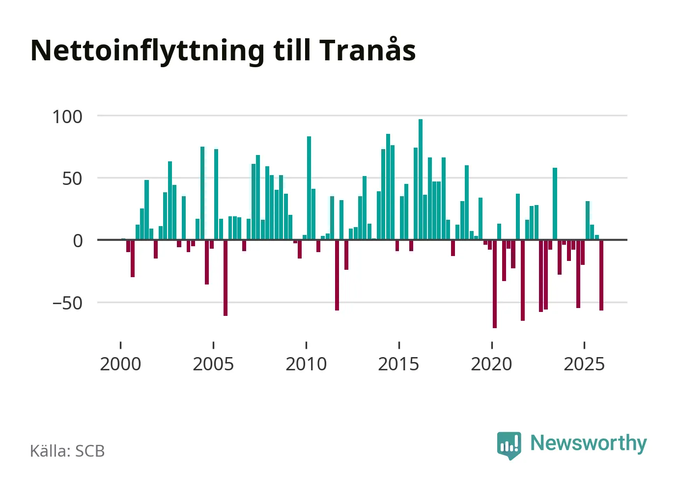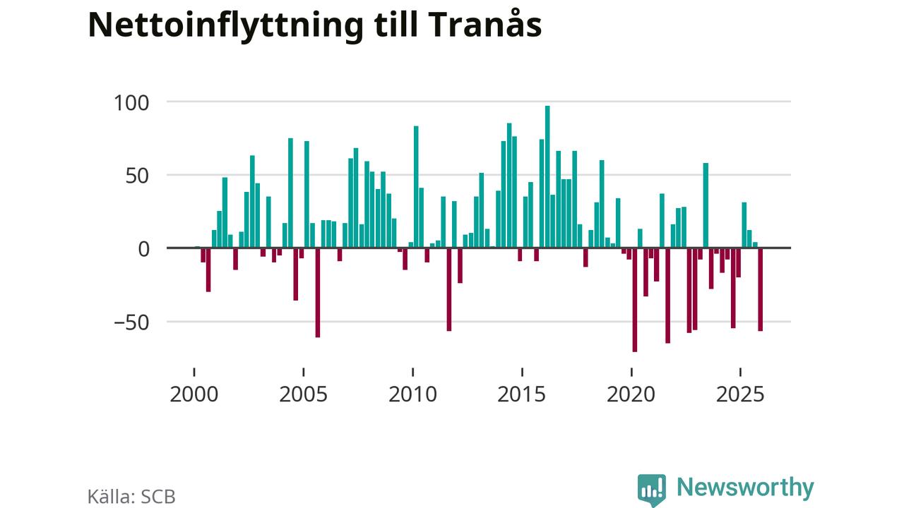 Under fjärde kvartalet 2025 flyttade 157 personer till kommunen medan 214 personer flyttade därifrån. Det är historiskt sett en liten inflyttning under ett kvartal. Sedan seklets början har Tranås haft ungefär lika många kvartal med positivt flyttnetto som negativt.