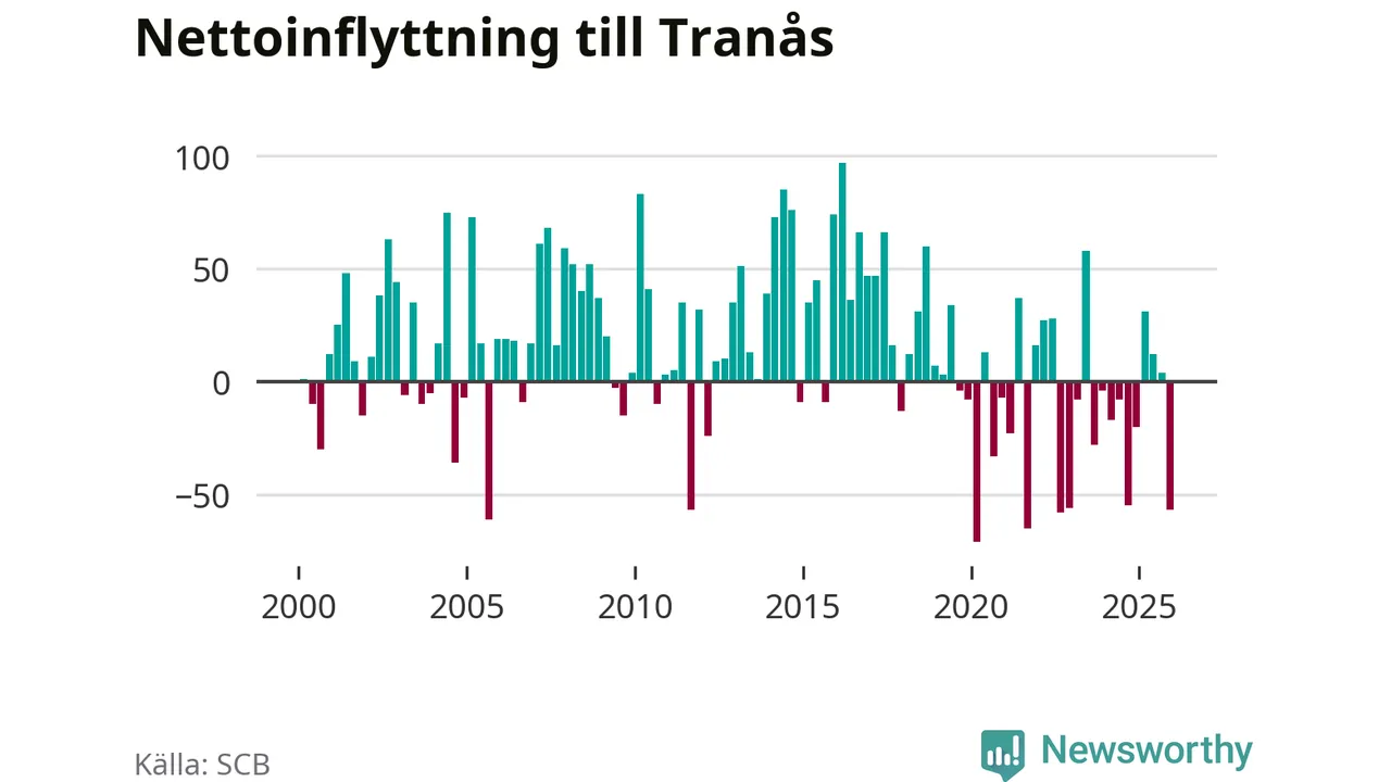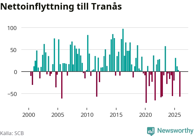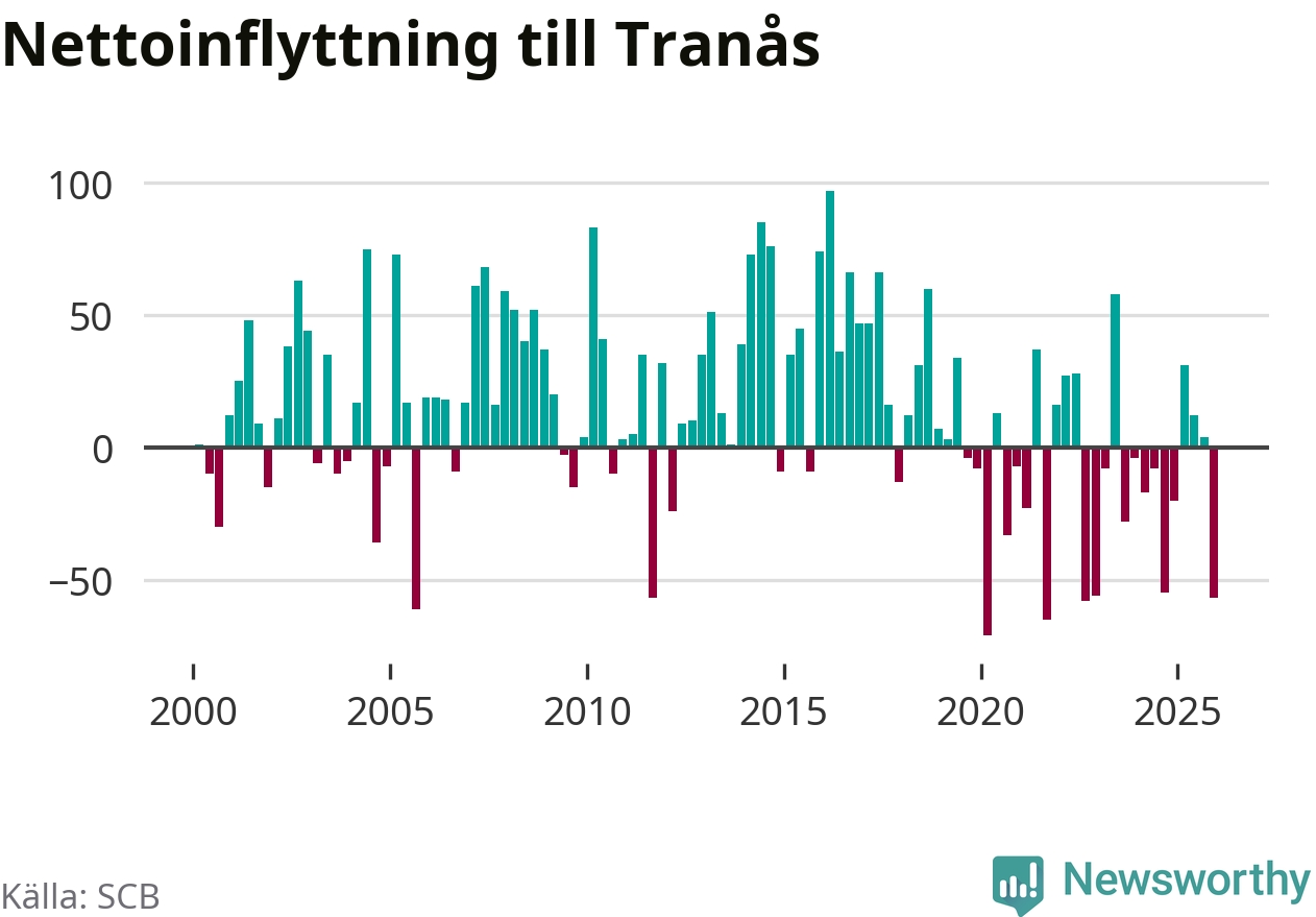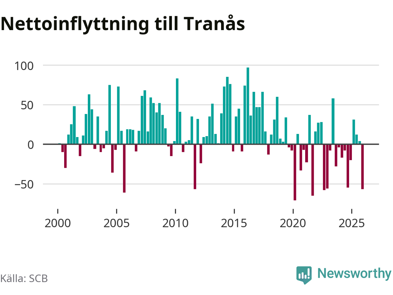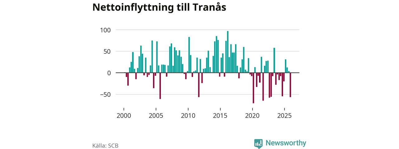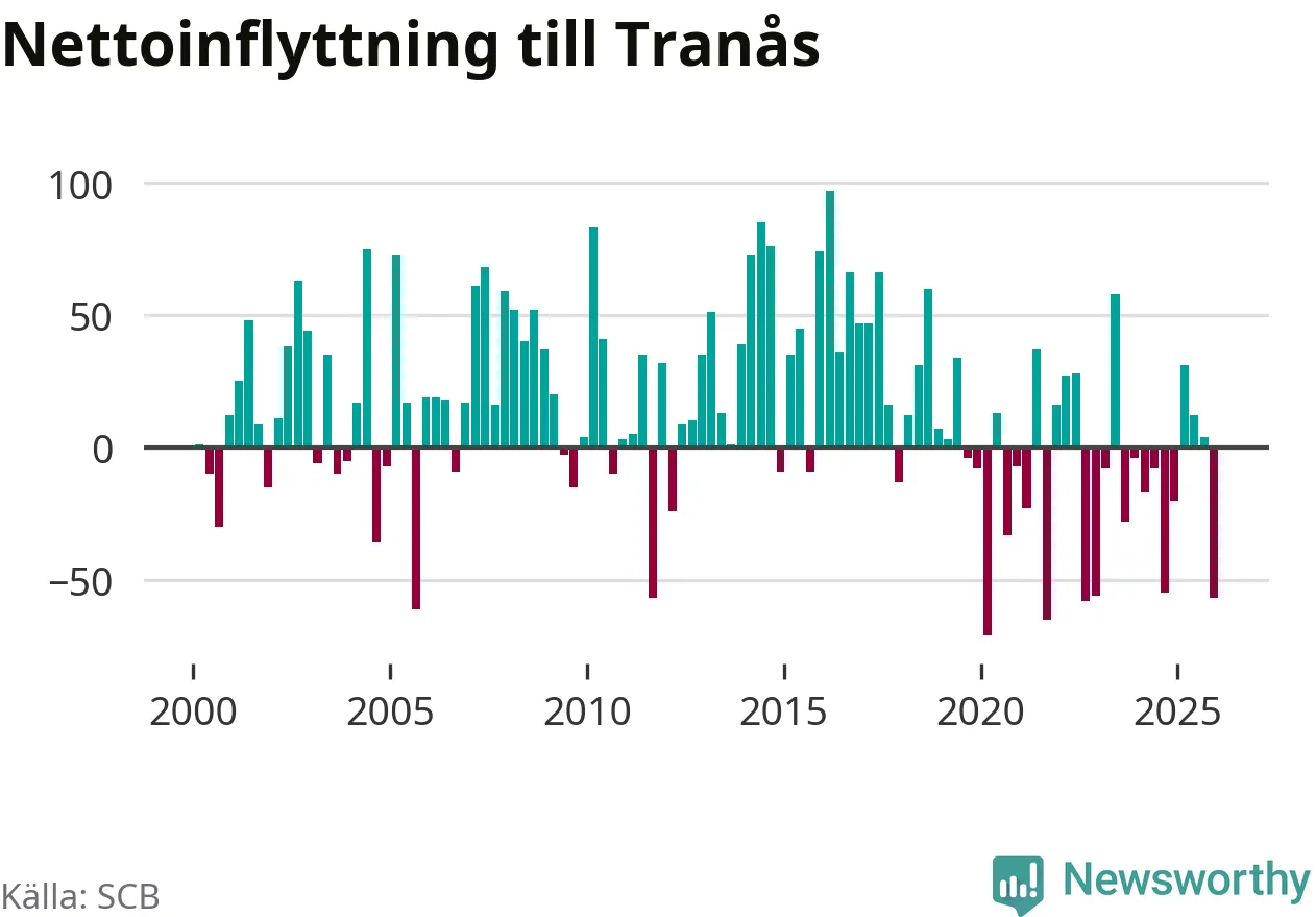 Under fjärde kvartalet 2025 flyttade 157 personer till kommunen medan 214 personer flyttade därifrån. Det är historiskt sett en liten inflyttning under ett kvartal. Sedan seklets början har Tranås haft ungefär lika många kvartal med positivt flyttnetto som negativt.