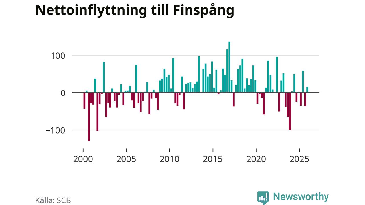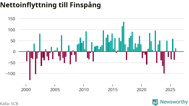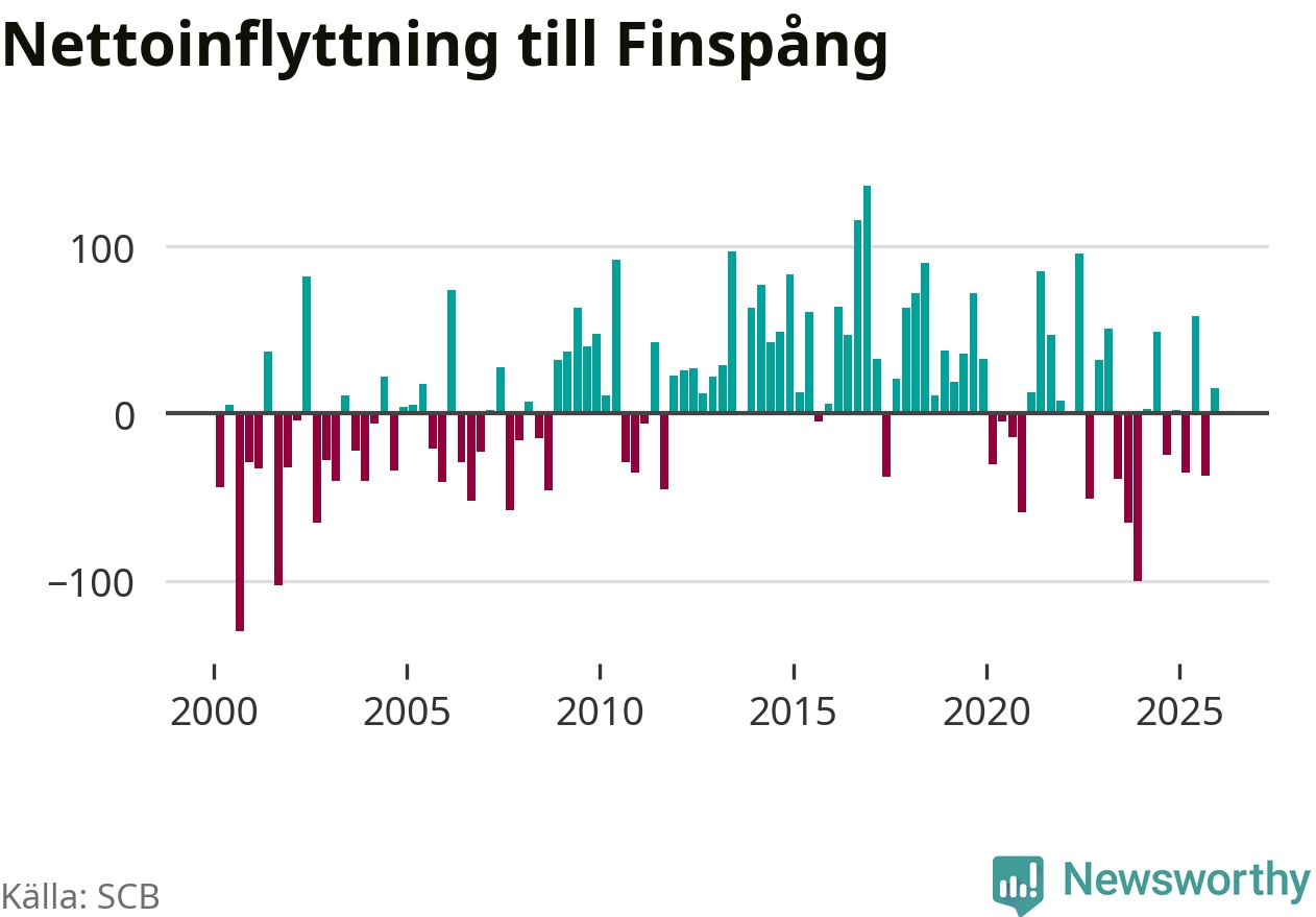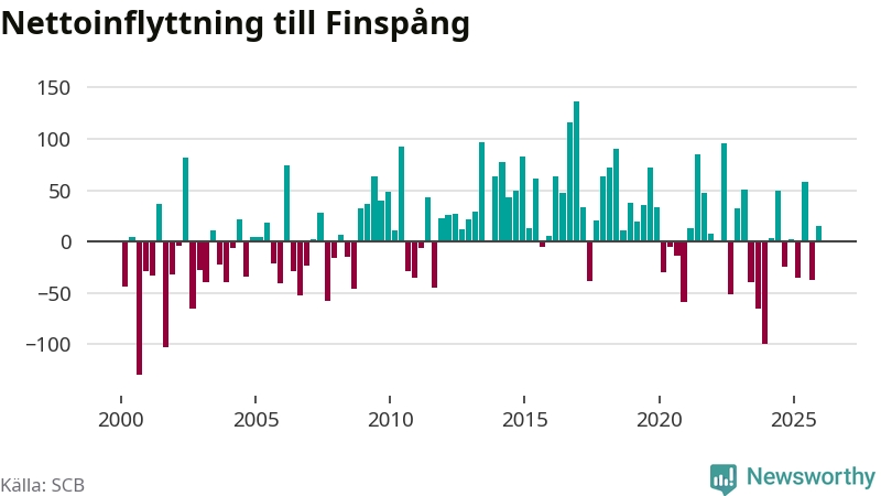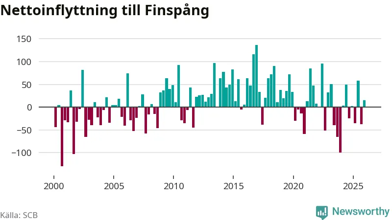 Under fjärde kvartalet 2025 flyttade 252 personer till kommunen medan 237 personer flyttade därifrån. Sedan seklets början har Finspång oftast haft ett positivt flyttnetto, inklusive det senaste kvartalet.