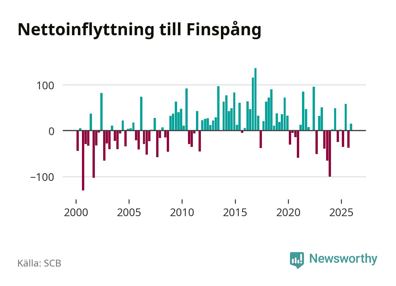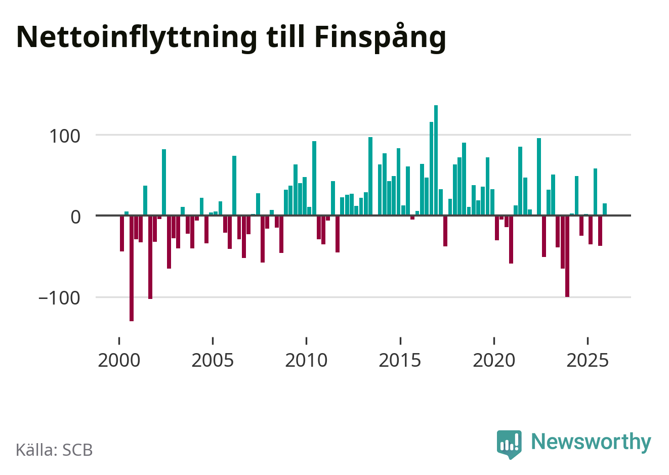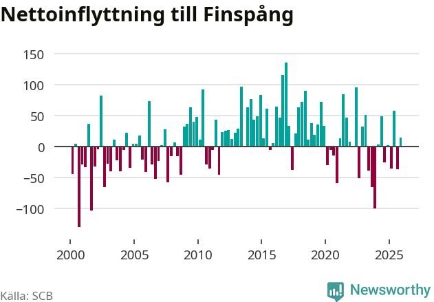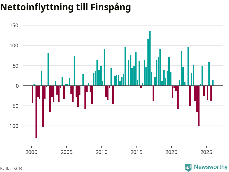 Under fjärde kvartalet 2025 flyttade 252 personer till kommunen medan 237 personer flyttade därifrån. Sedan seklets början har Finspång oftast haft ett positivt flyttnetto, inklusive det senaste kvartalet.