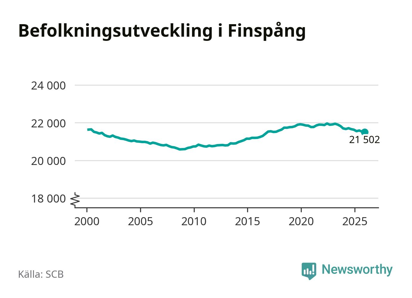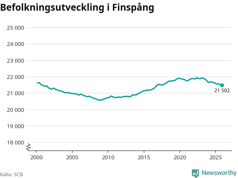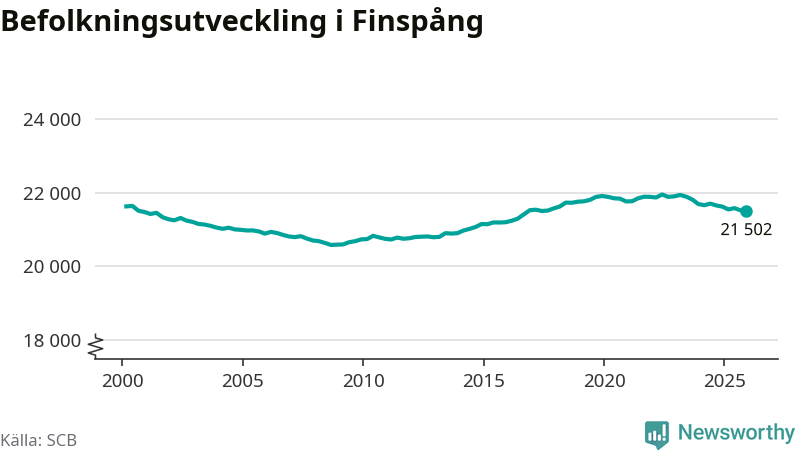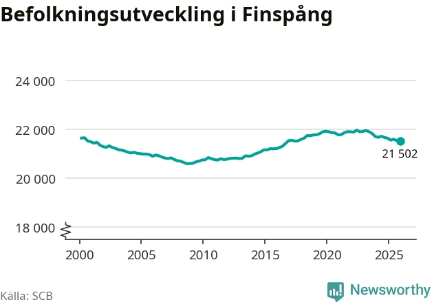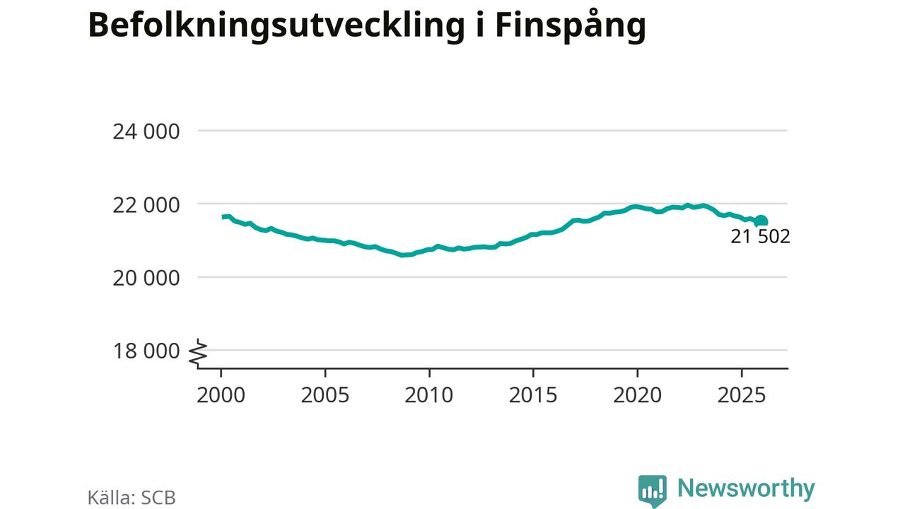 Befolkningen minskade i Finspångs kommun under det fjärde kvartalet 2025. Den 31 december bodde enligt SCB:s senaste siffror 21 502 personer i kommunen, vilket är 22 färre än i slutet av tredje kvartalet.