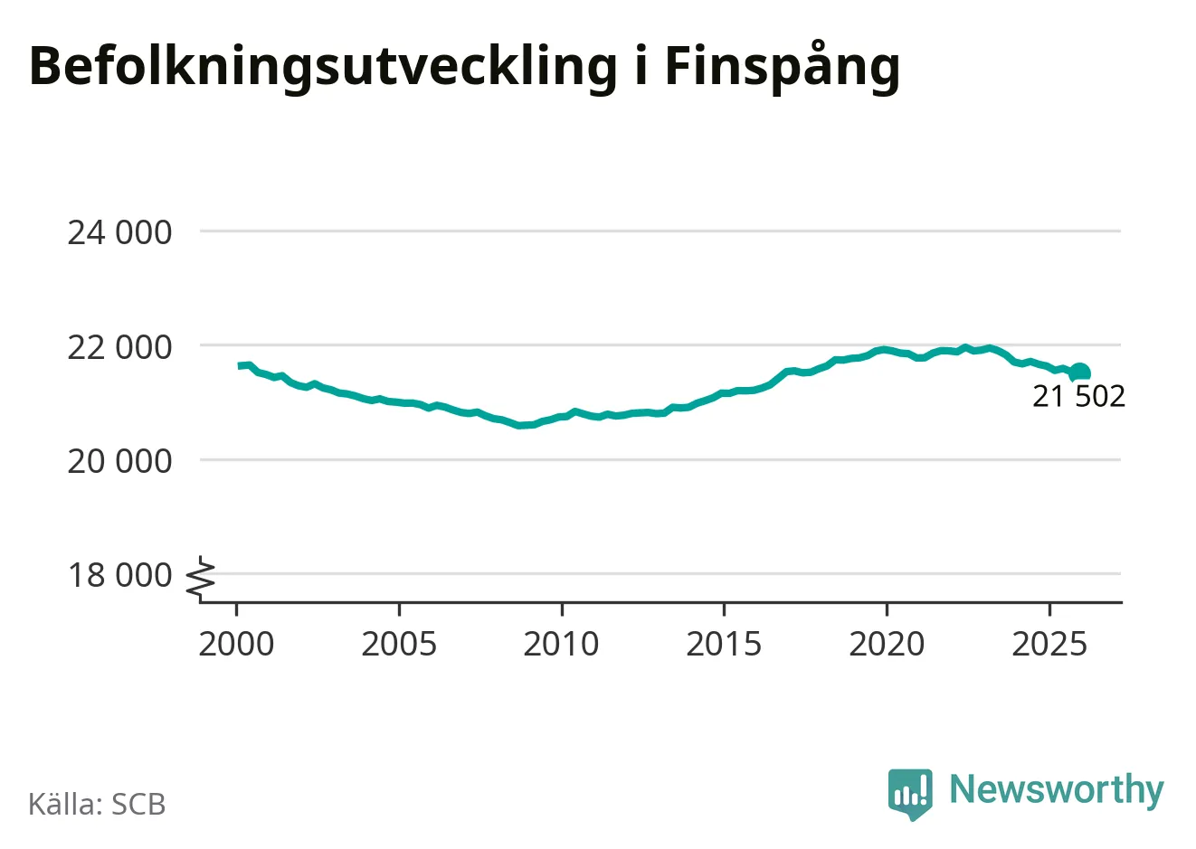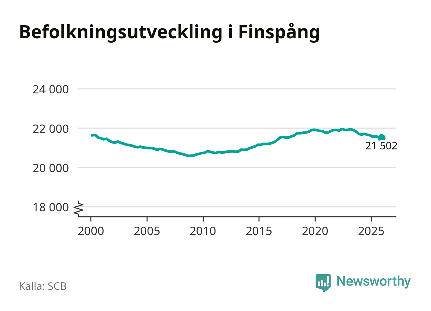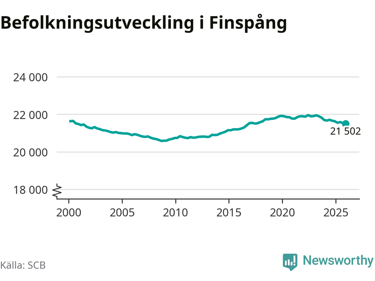 Befolkningen minskade i Finspångs kommun under det fjärde kvartalet 2025. Den 31 december bodde enligt SCB:s senaste siffror 21 502 personer i kommunen, vilket är 22 färre än i slutet av tredje kvartalet.