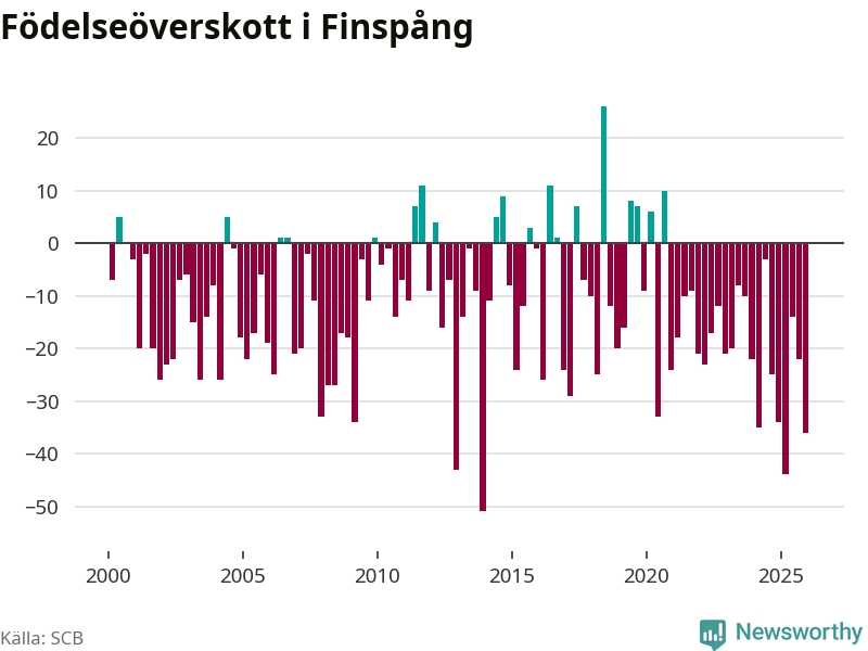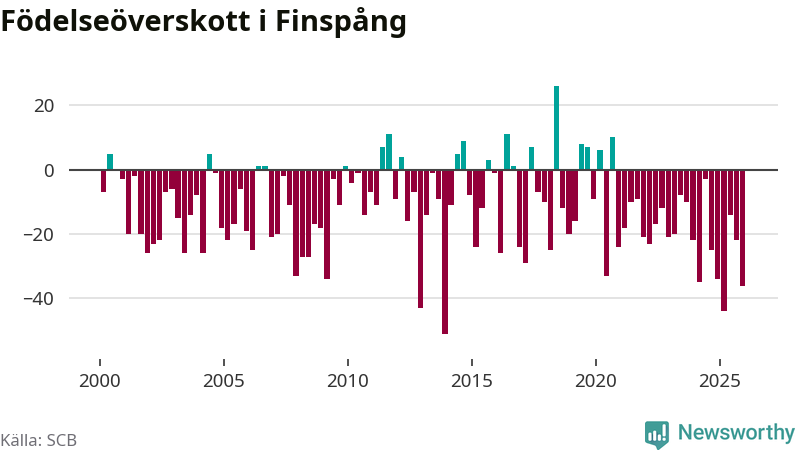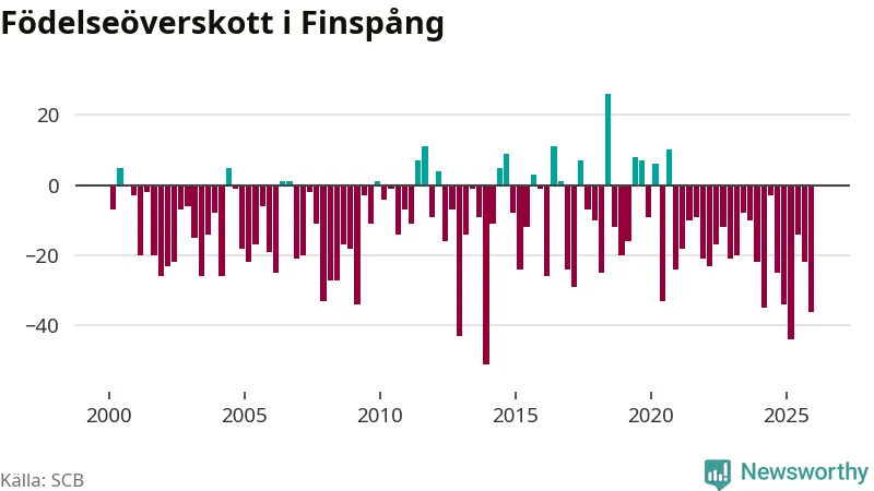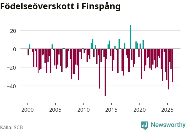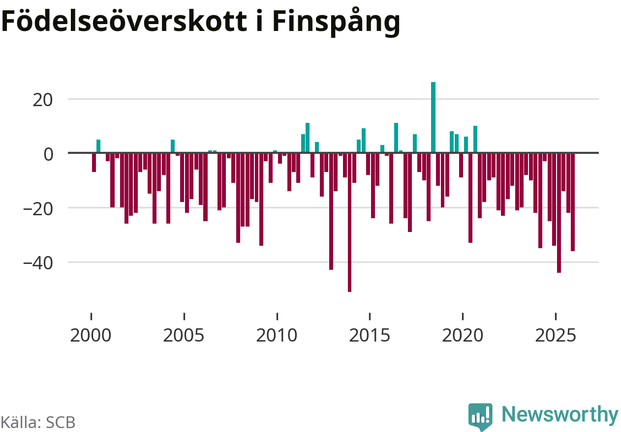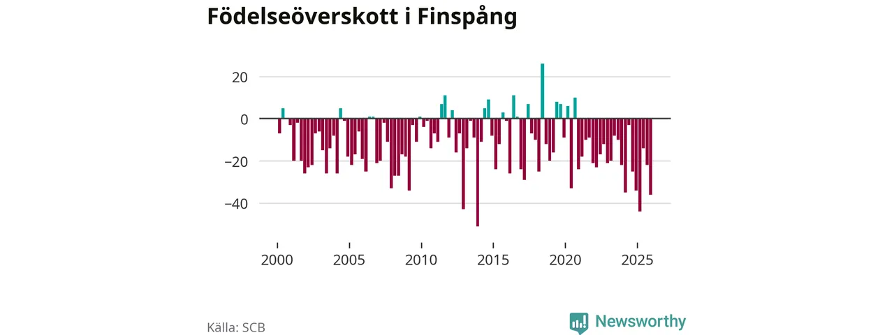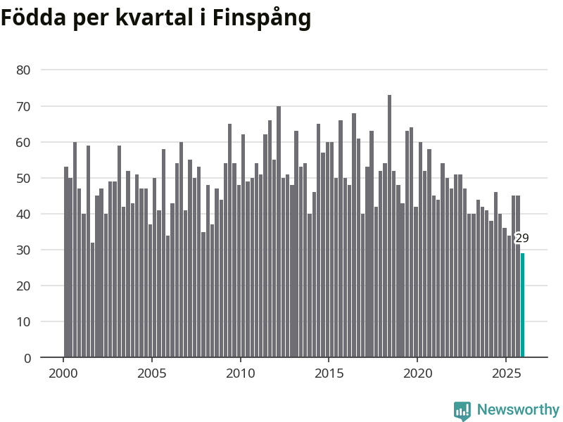 Enligt SCB:s siffror föddes 29 barn i Finspång under det senaste kvartalet. Det är det lägsta födelsetal som registrerats i kommunen under 2000-talet. Det finns en osäkerhet här, eftersom SCB lägger på ett slumpmässigt brus på alla siffror. Samtidigt avled 65 personer. Finspång hade alltså ett negativt födelsenetto, vilket kommunen historiskt sett nästan alltid har haft.