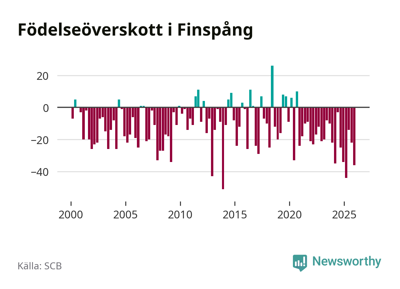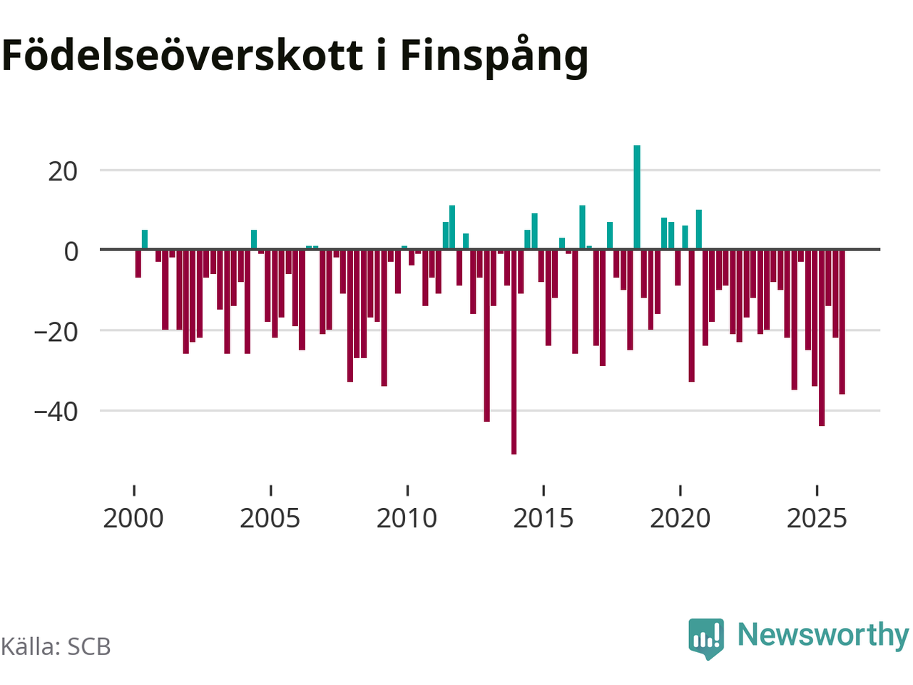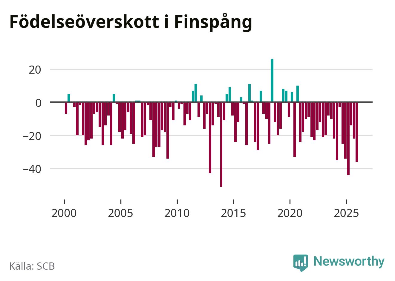 Enligt SCB:s siffror föddes 29 barn i Finspång under det senaste kvartalet. Det är det lägsta födelsetal som registrerats i kommunen under 2000-talet. Det finns en osäkerhet här, eftersom SCB lägger på ett slumpmässigt brus på alla siffror. Samtidigt avled 65 personer. Finspång hade alltså ett negativt födelsenetto, vilket kommunen historiskt sett nästan alltid har haft.