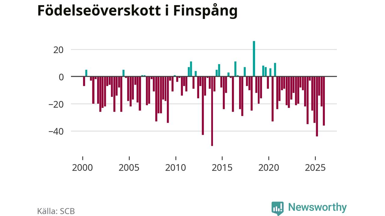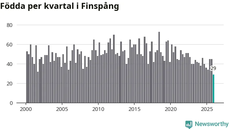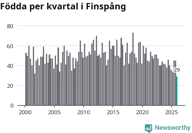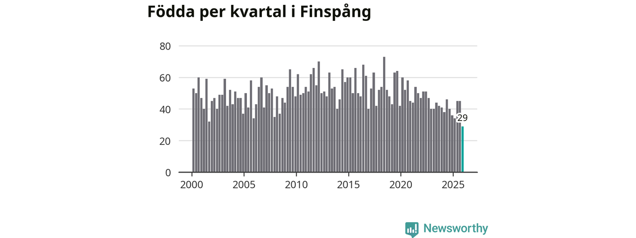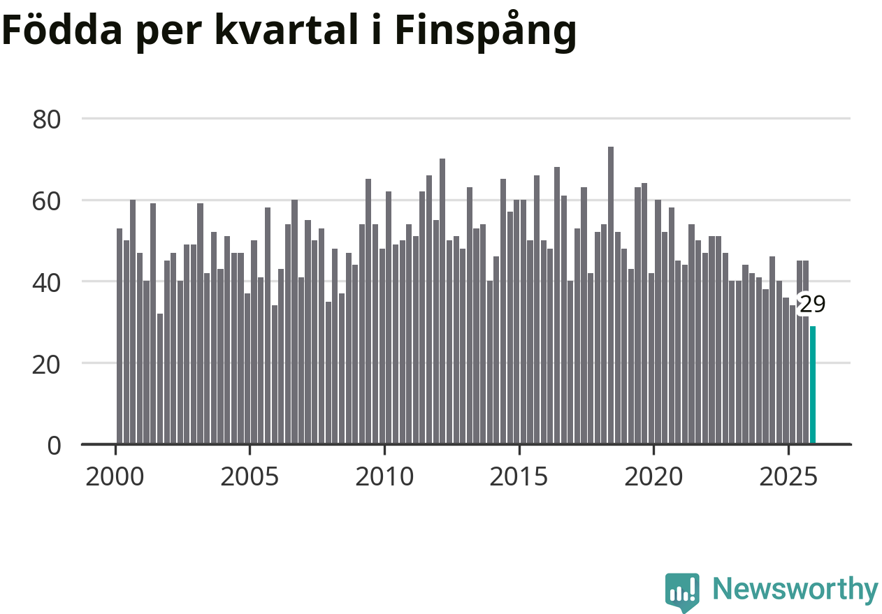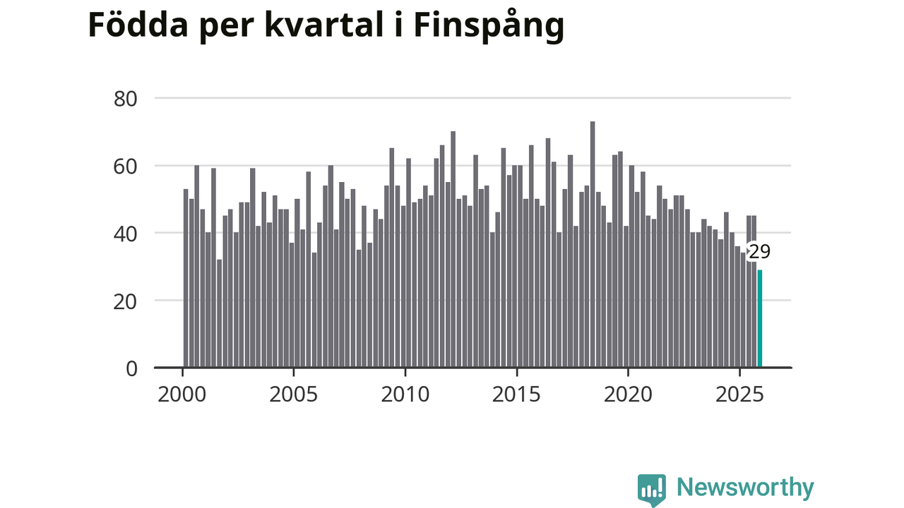 29 barn föddes i Finspångs kommun under fjärde kvartalet 2025. Det är den lägsta siffran hittills det här seklet. Det visar SCB:s senaste befolkningsstatistik.