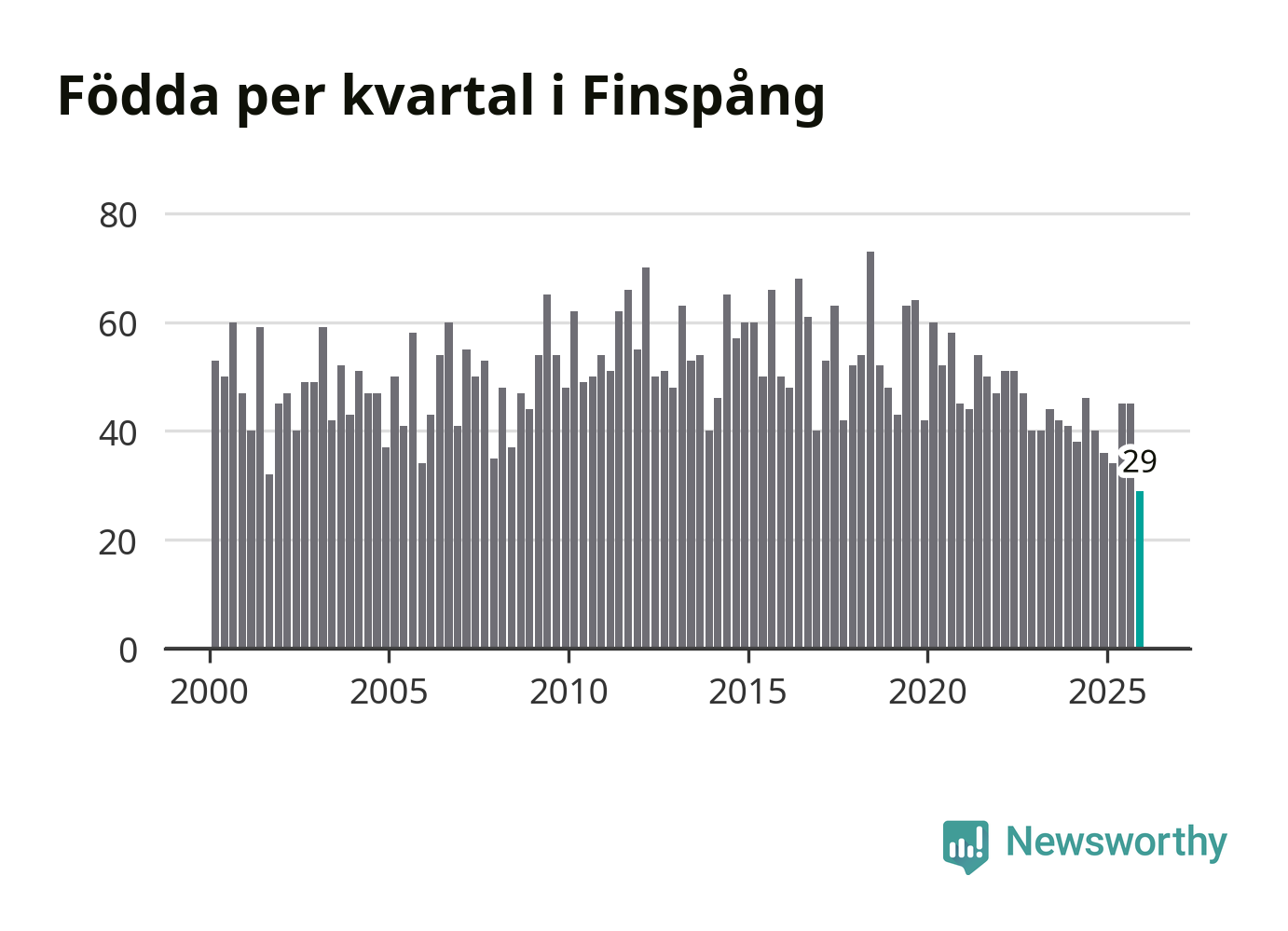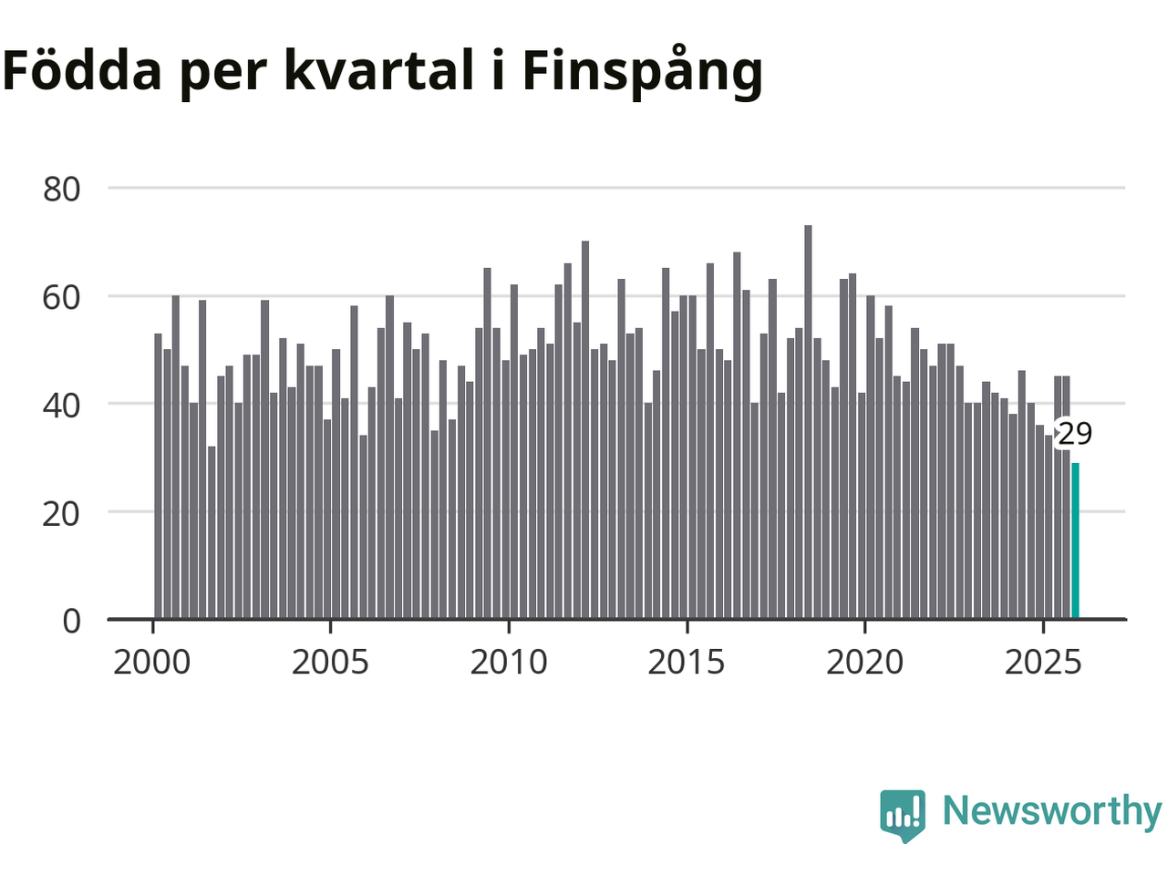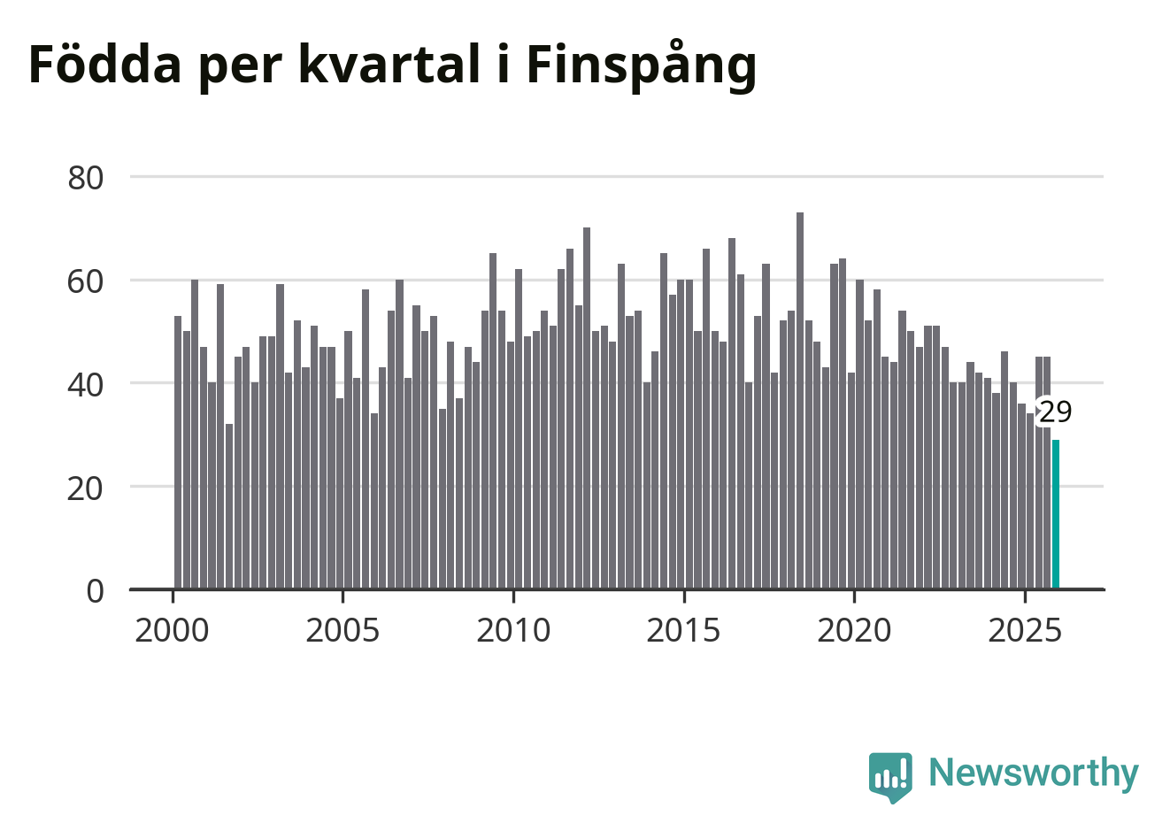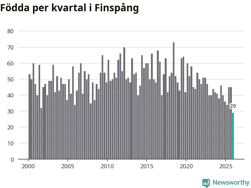 29 barn föddes i Finspångs kommun under fjärde kvartalet 2025. Det är den lägsta siffran hittills det här seklet. Det visar SCB:s senaste befolkningsstatistik.