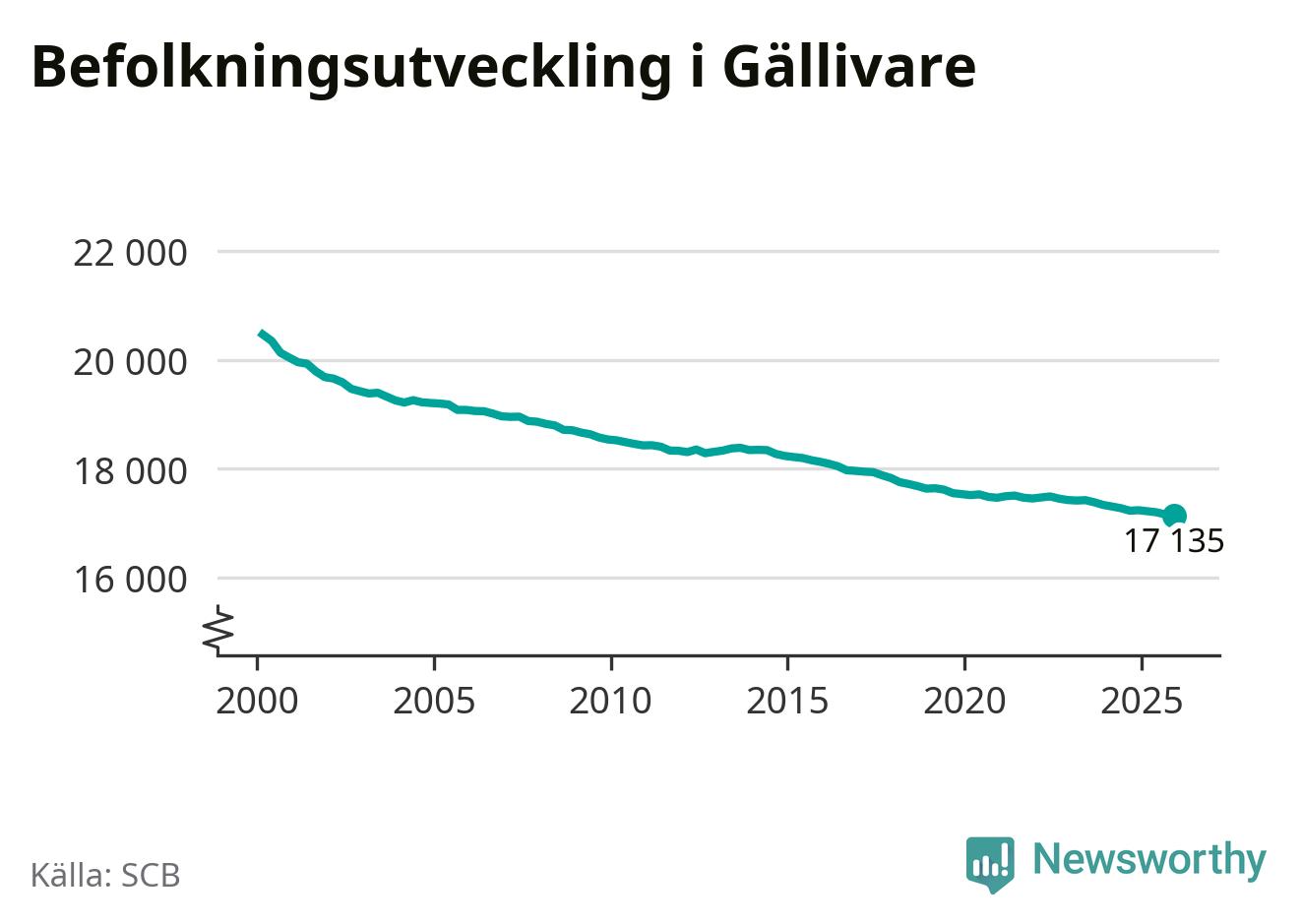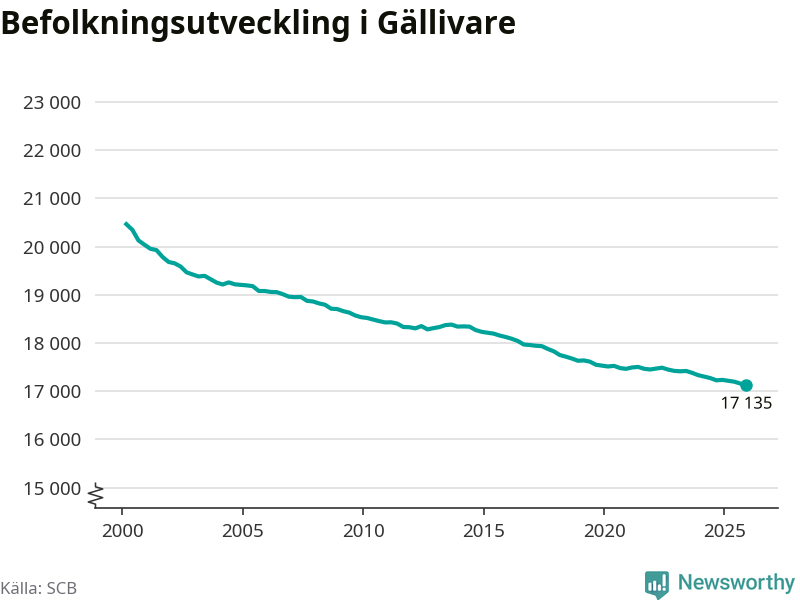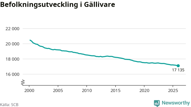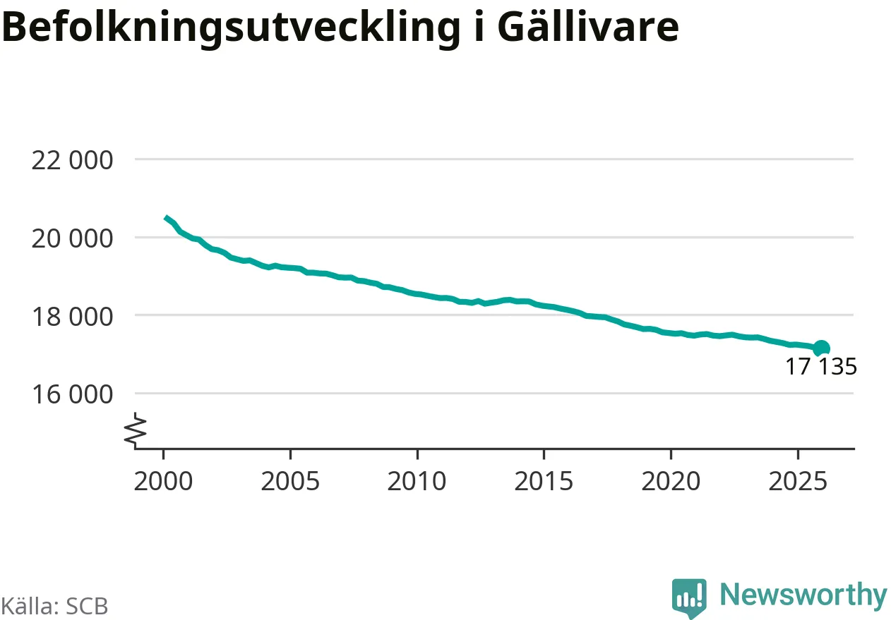 Jämfört med för ett år sedan har befolkningen i Gällivare minskat med ungefär 100 personer – vilket motsvarar en nedgång på 0,6 procent. Sedan millennieskiftet har folkmängden minskat med runt 3 330 personer, eller 16 procent.