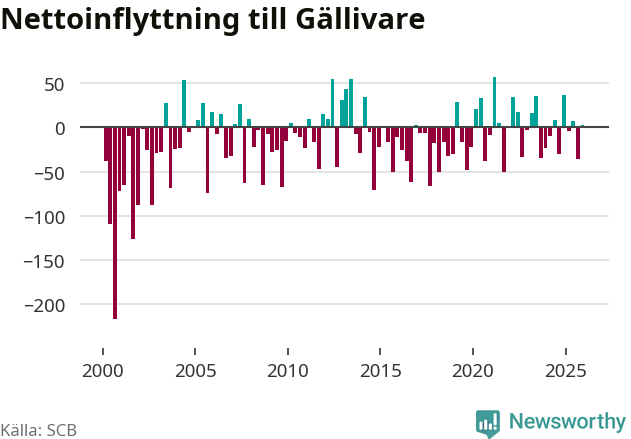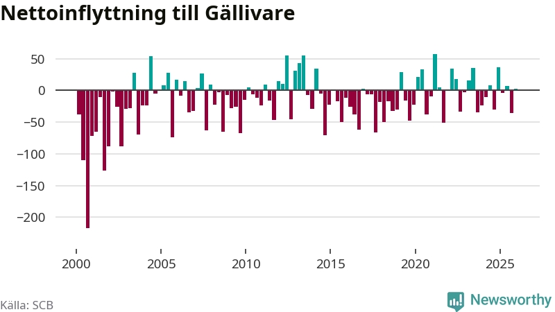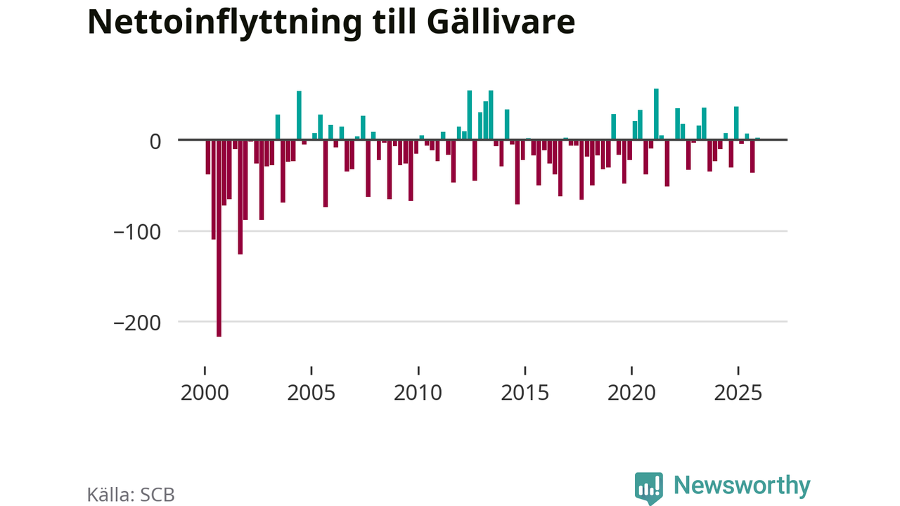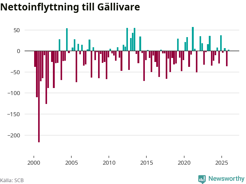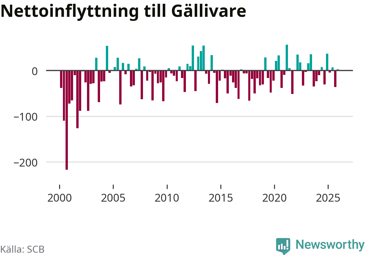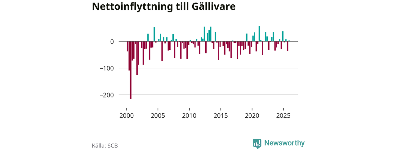 Under fjärde kvartalet 2025 flyttade 153 personer till kommunen medan 150 personer flyttade därifrån. Skillnaden mellan antalet in- och utflyttade är så liten att den lika gärna kan bero på SCB:s slumpmässiga brus. Sedan seklets början har Gällivare oftast haft ett negativt flyttnetto.