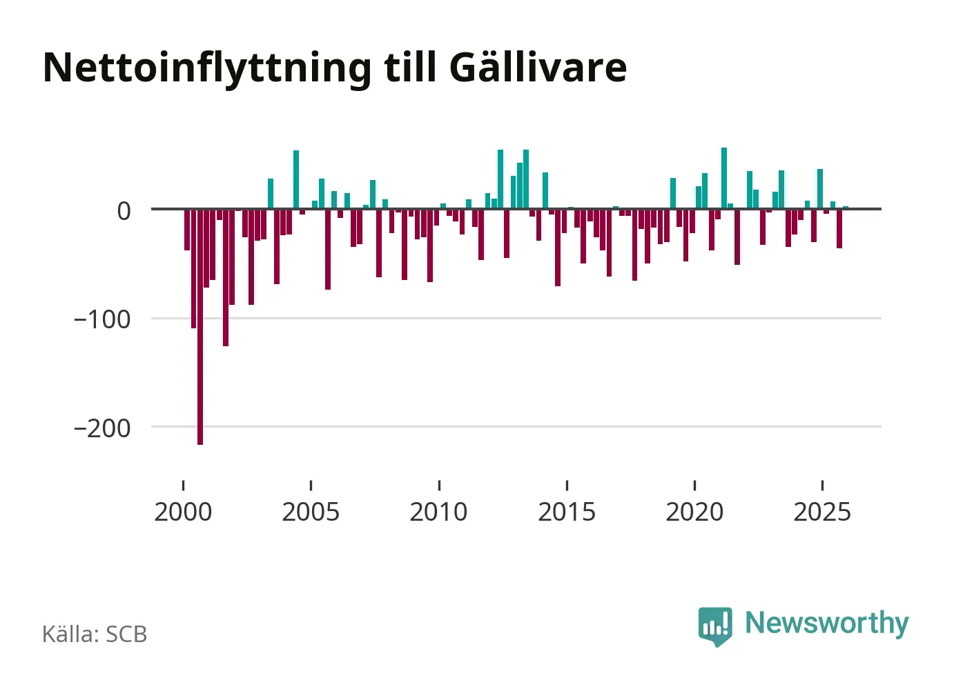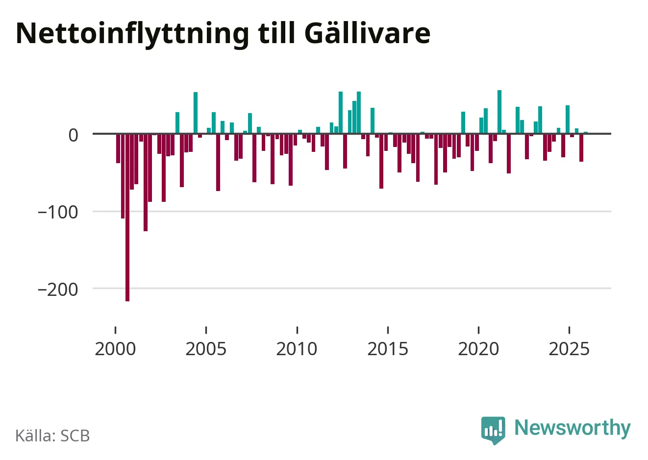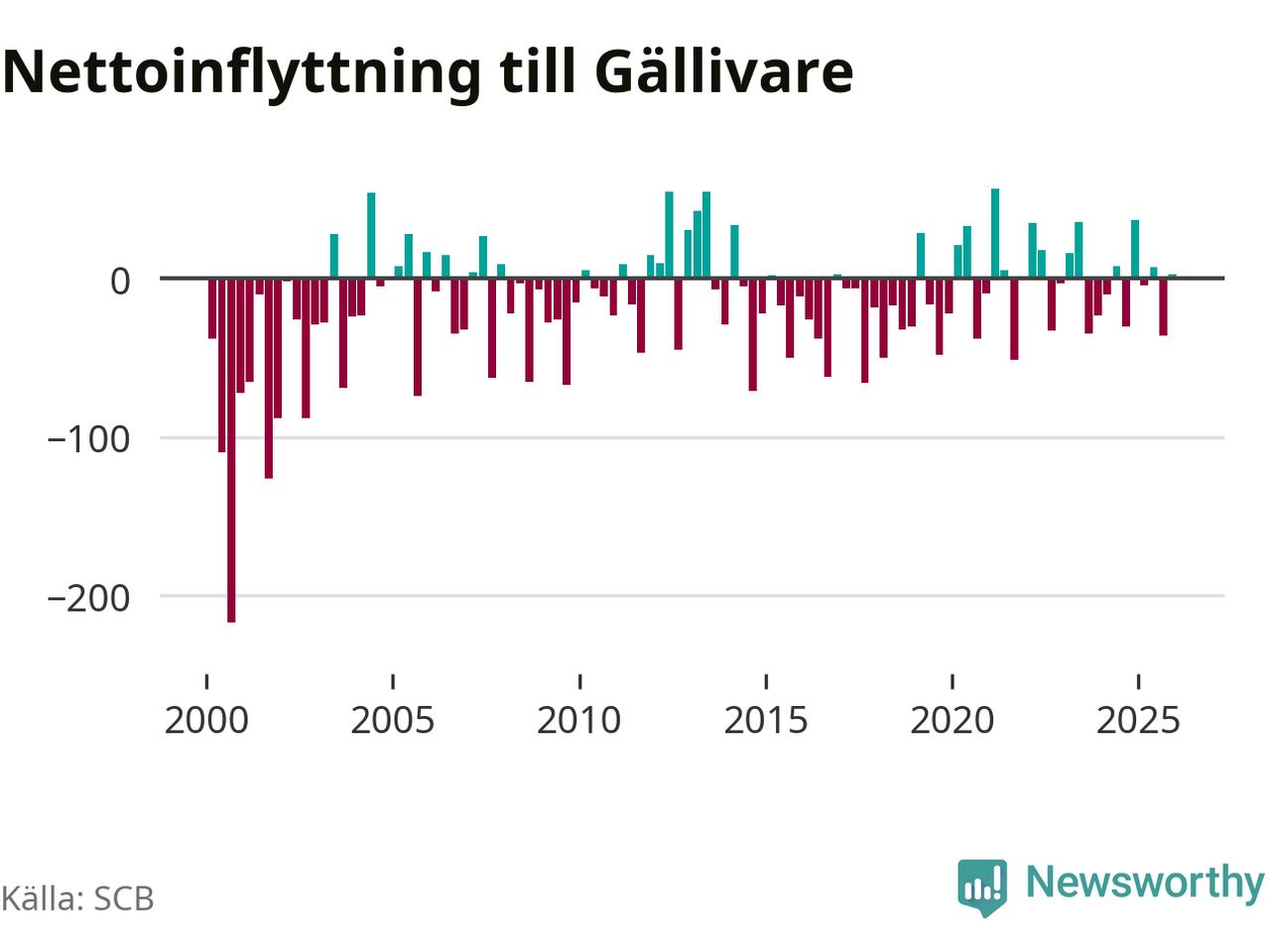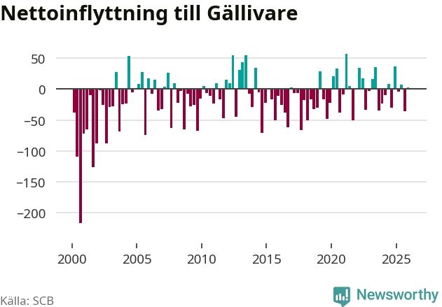 Under fjärde kvartalet 2025 flyttade 153 personer till kommunen medan 150 personer flyttade därifrån. Skillnaden mellan antalet in- och utflyttade är så liten att den lika gärna kan bero på SCB:s slumpmässiga brus. Sedan seklets början har Gällivare oftast haft ett negativt flyttnetto.