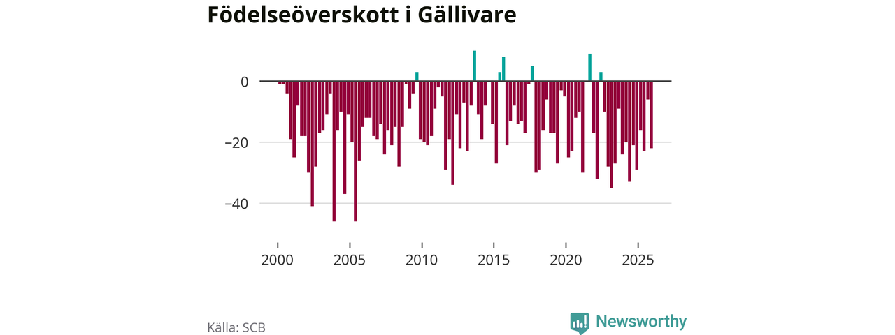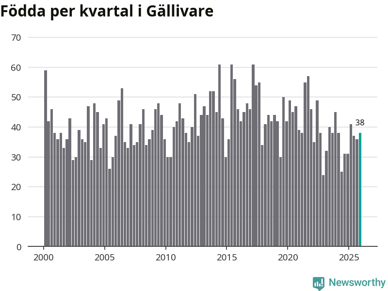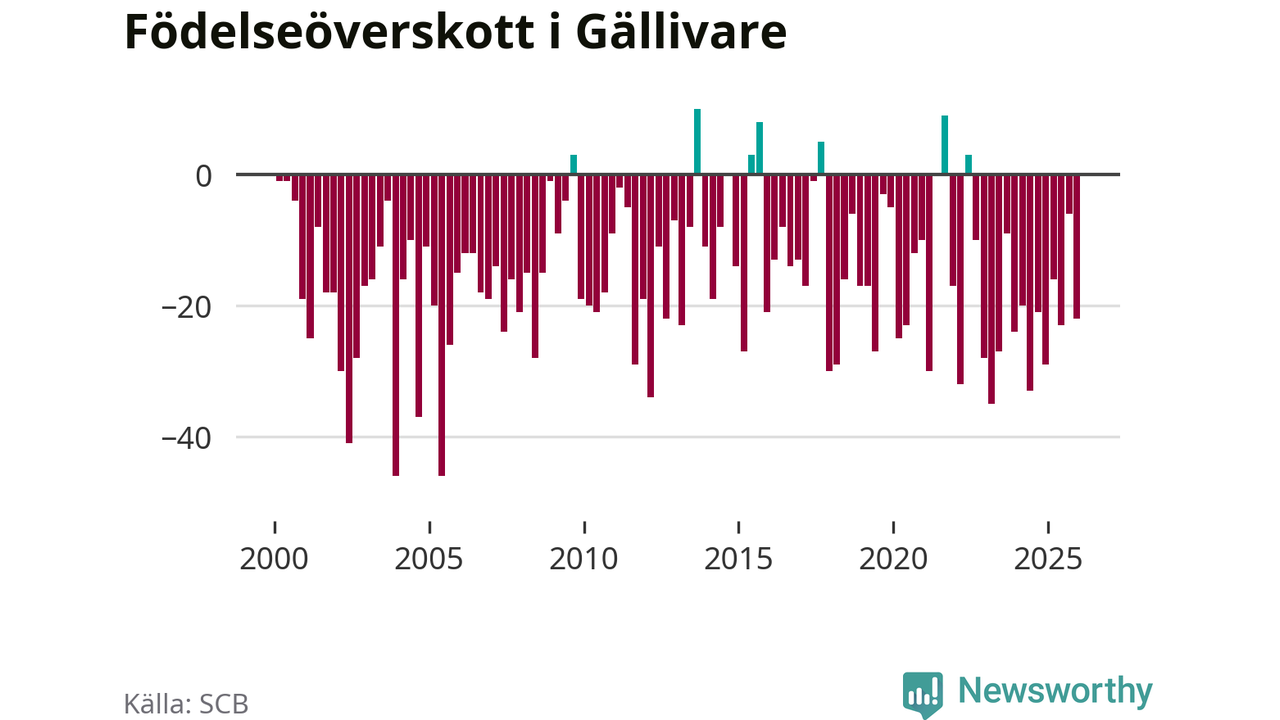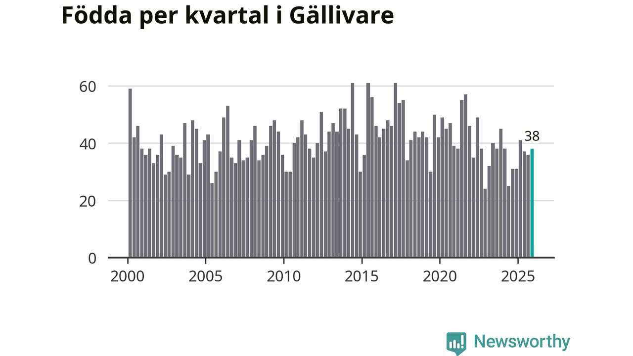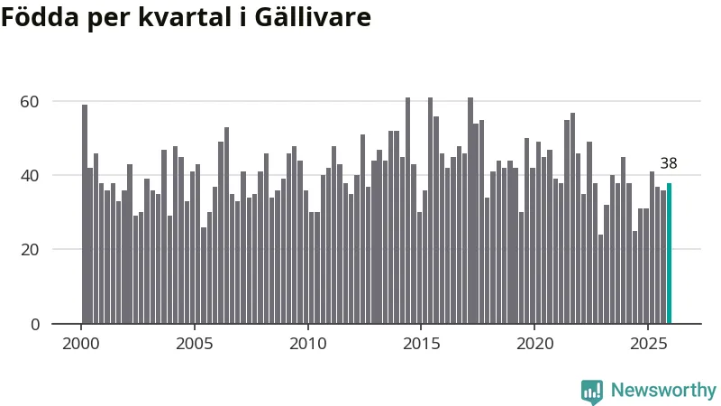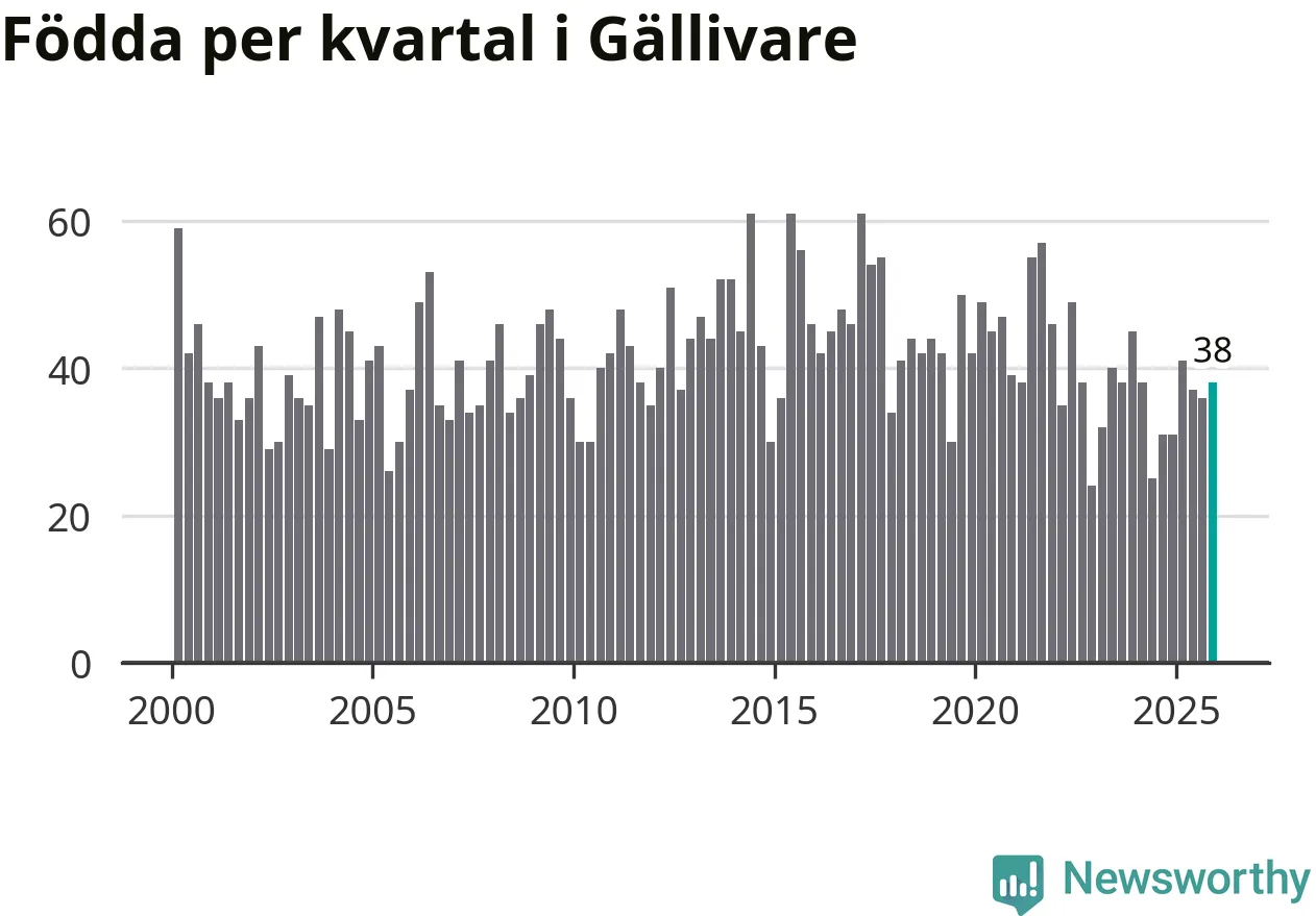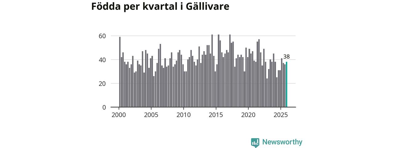 Enligt SCB:s siffror föddes 38 barn i Gällivare under det senaste kvartalet. Samtidigt avled 60 personer. Gällivare hade alltså ett negativt födelsenetto, vilket kommunen historiskt sett nästan alltid har haft.