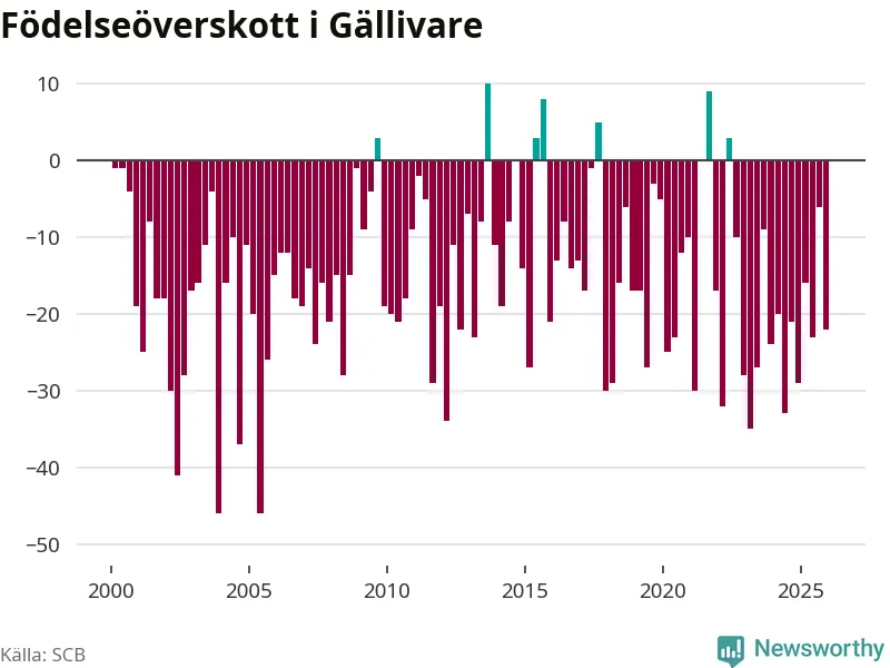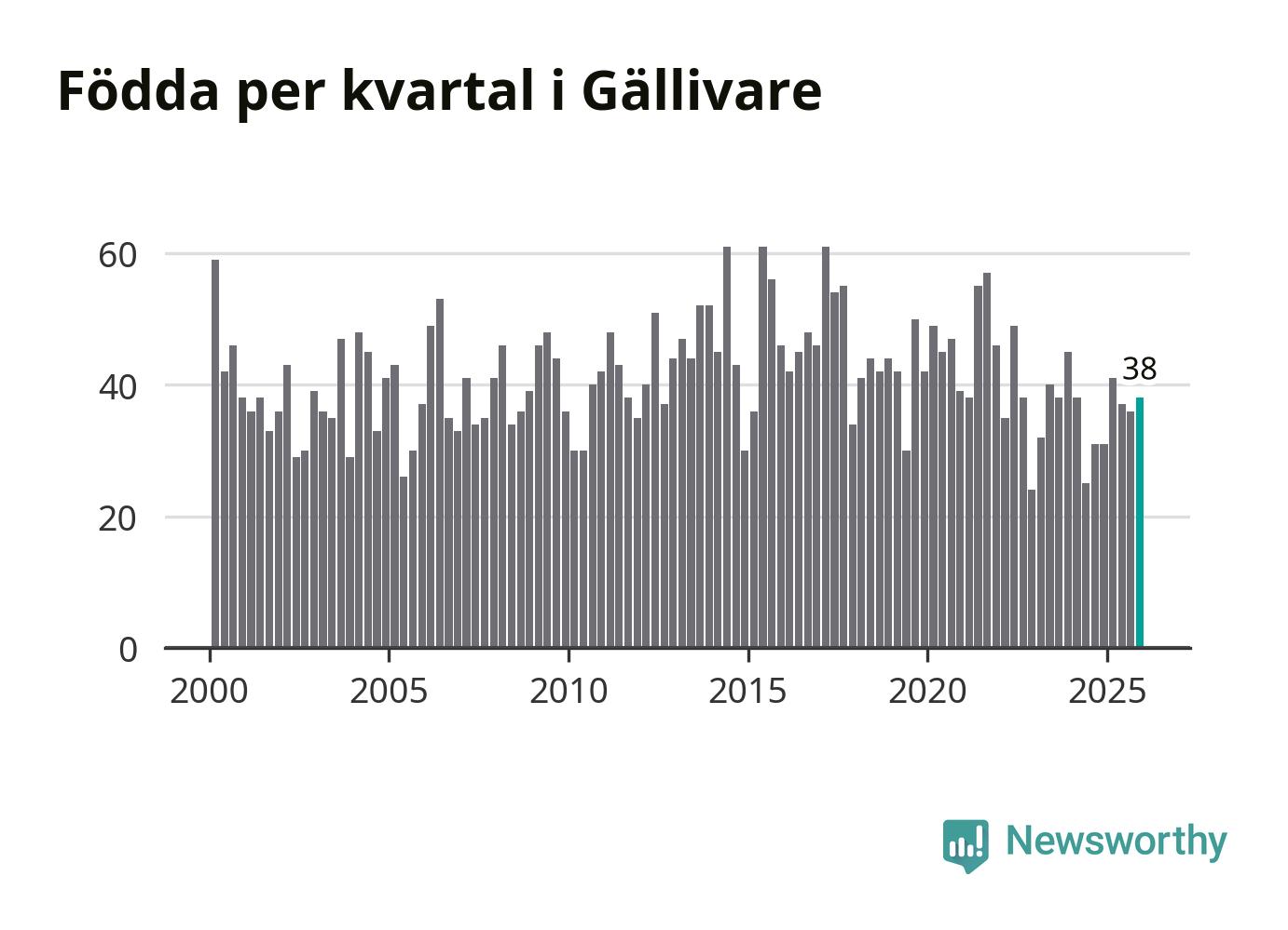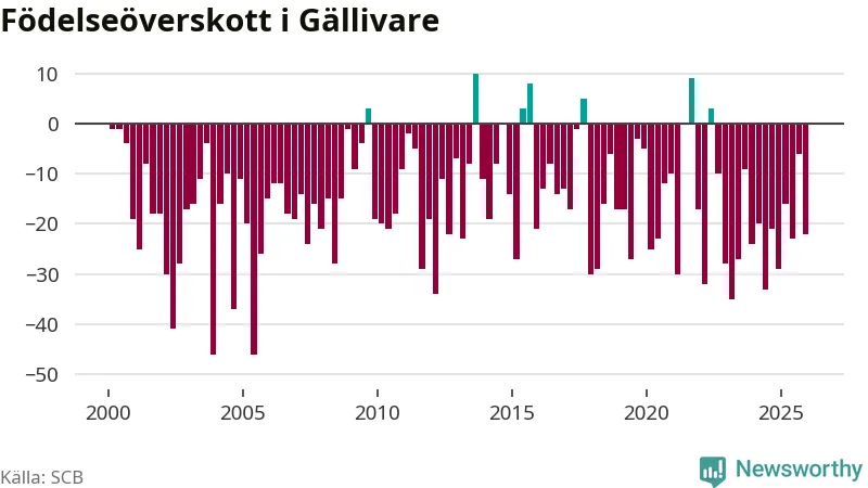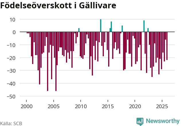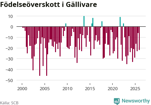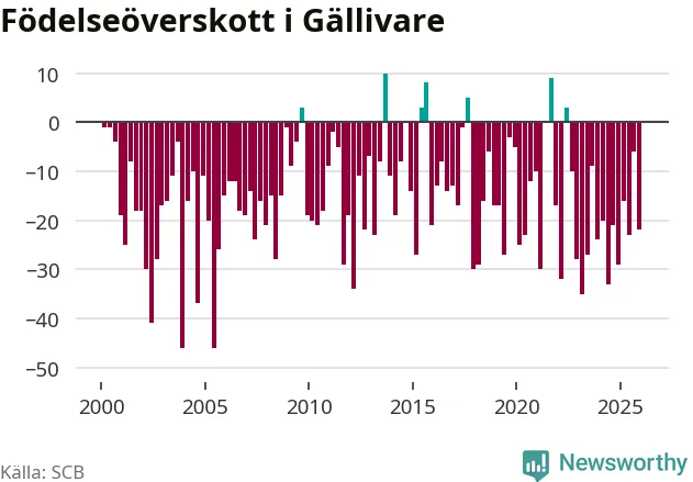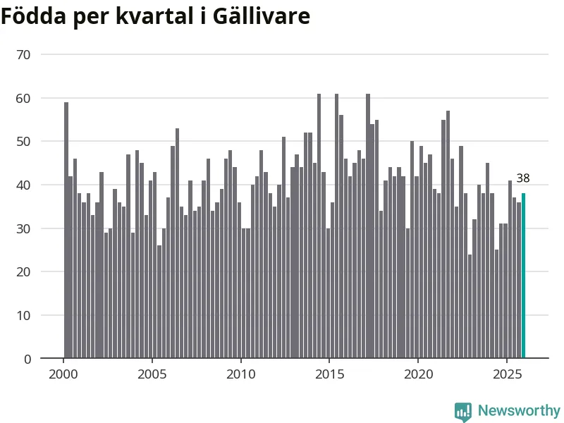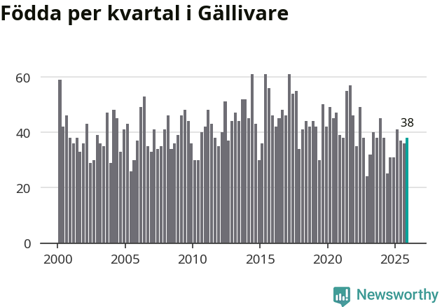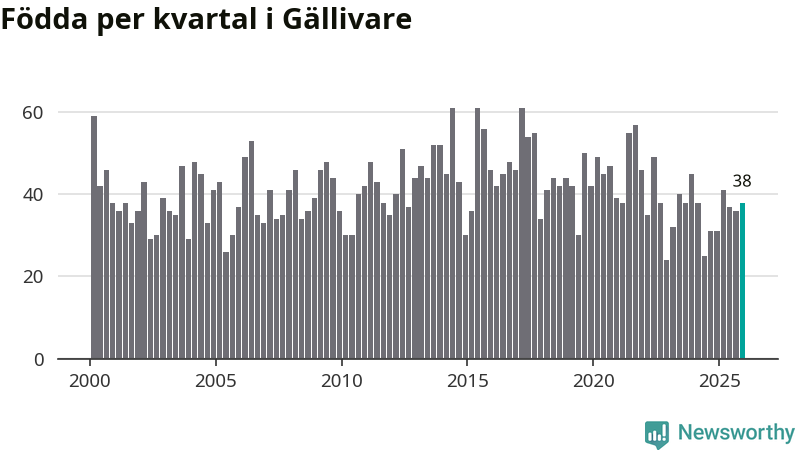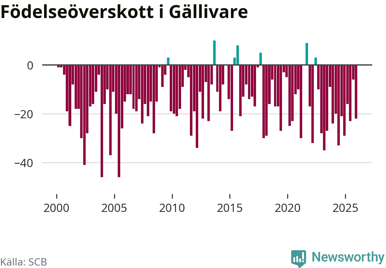 Enligt SCB:s siffror föddes 38 barn i Gällivare under det senaste kvartalet. Samtidigt avled 60 personer. Gällivare hade alltså ett negativt födelsenetto, vilket kommunen historiskt sett nästan alltid har haft.