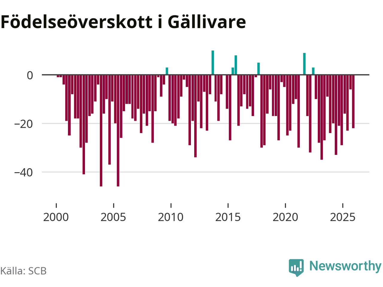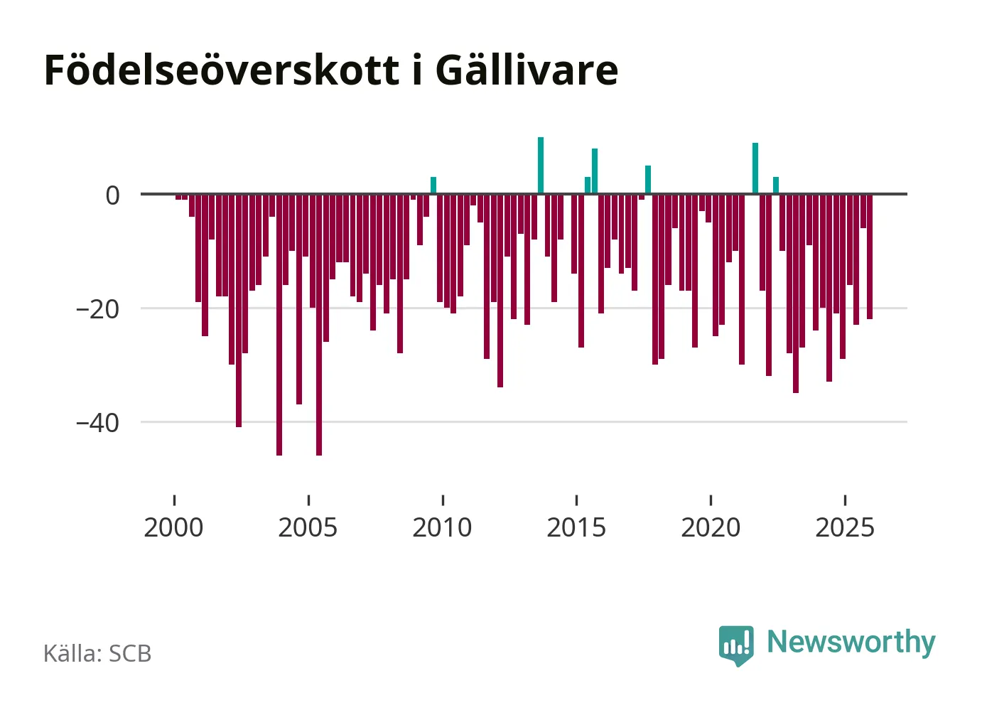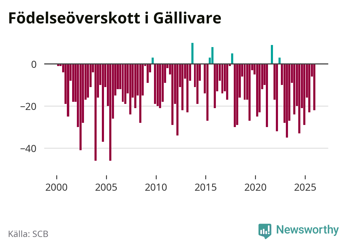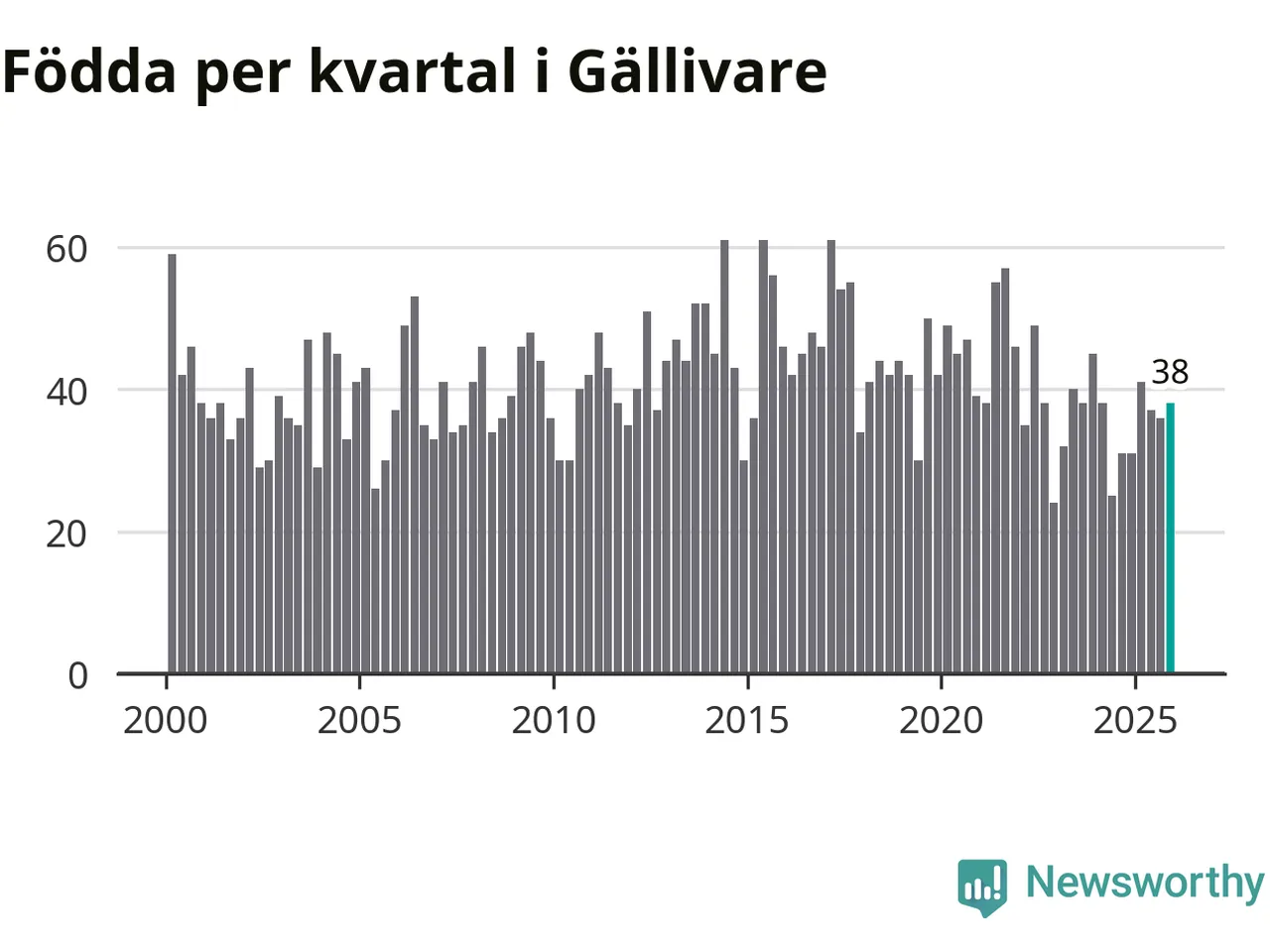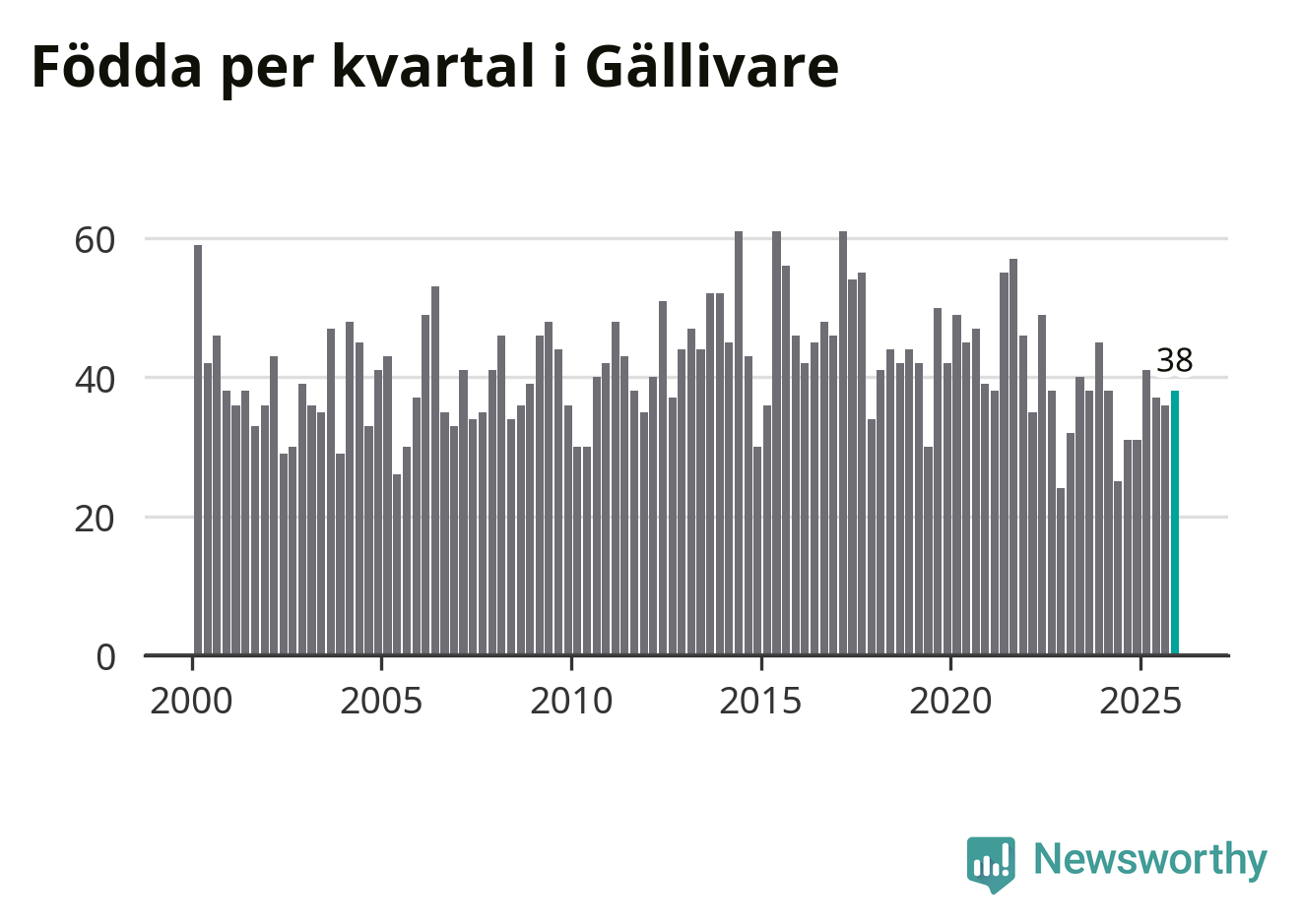 Enligt SCB:s siffror föddes 38 barn i Gällivare under det senaste kvartalet. Samtidigt avled 60 personer. Gällivare hade alltså ett negativt födelsenetto, vilket kommunen historiskt sett nästan alltid har haft.