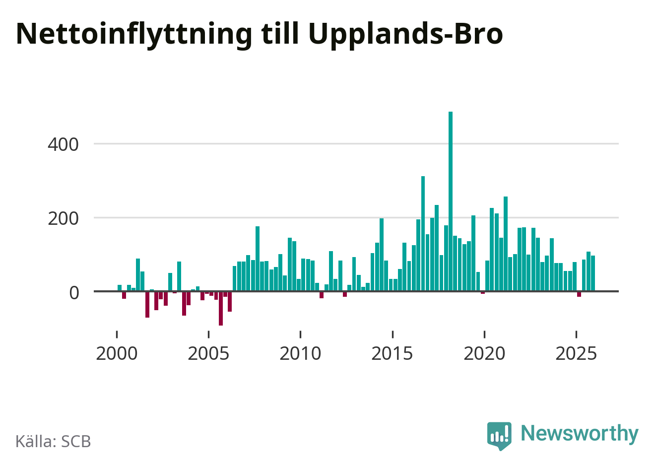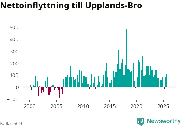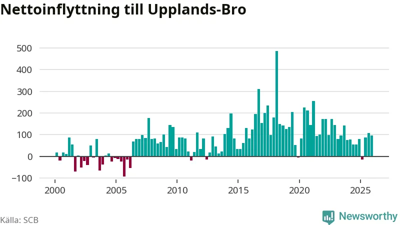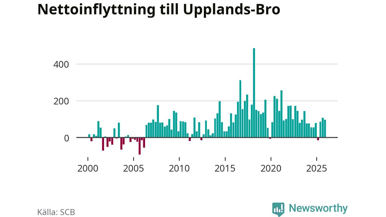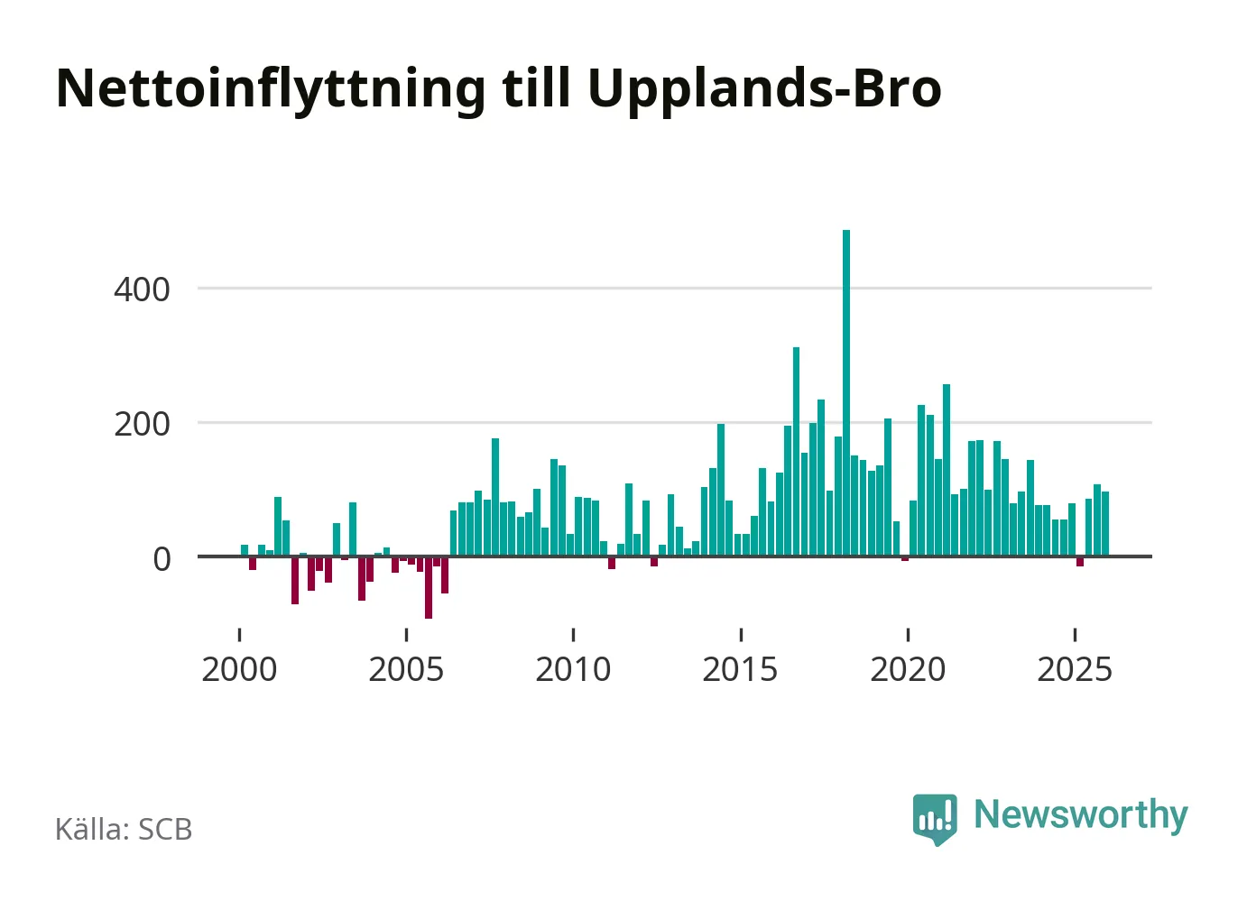 Under fjärde kvartalet 2025 flyttade 805 personer till kommunen medan 709 personer flyttade därifrån. Sedan seklets början har Upplands-Bro haft ett positivt flyttnetto under nästan alla kvartal, inklusive det senaste kvartalet.