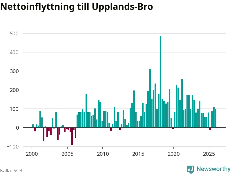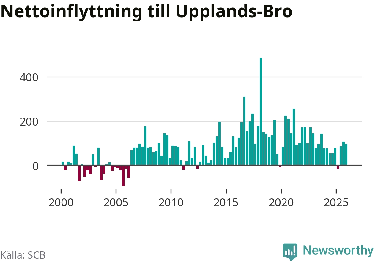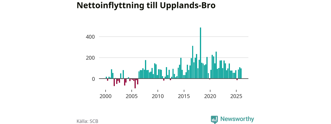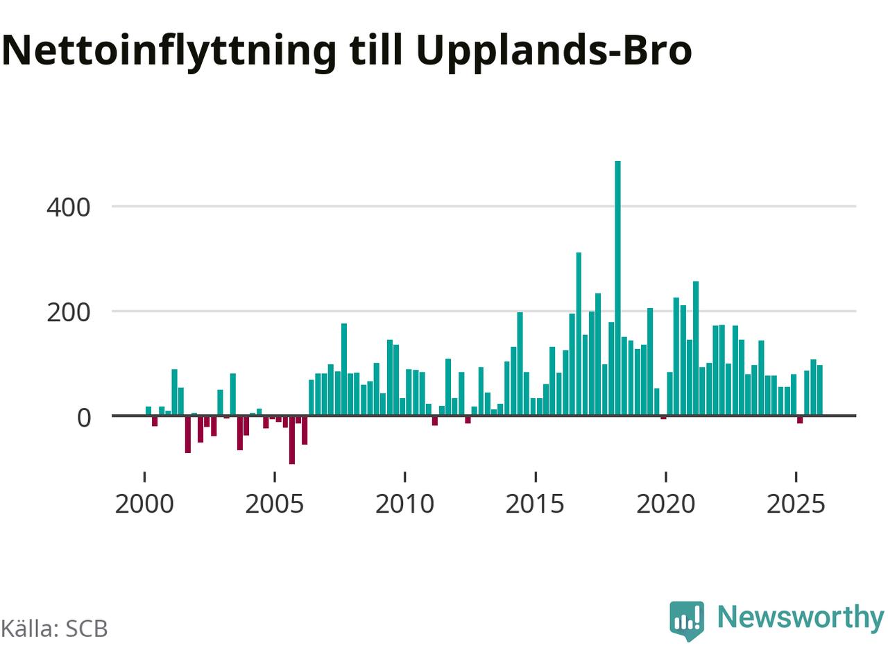 Under fjärde kvartalet 2025 flyttade 805 personer till kommunen medan 709 personer flyttade därifrån. Sedan seklets början har Upplands-Bro haft ett positivt flyttnetto under nästan alla kvartal, inklusive det senaste kvartalet.