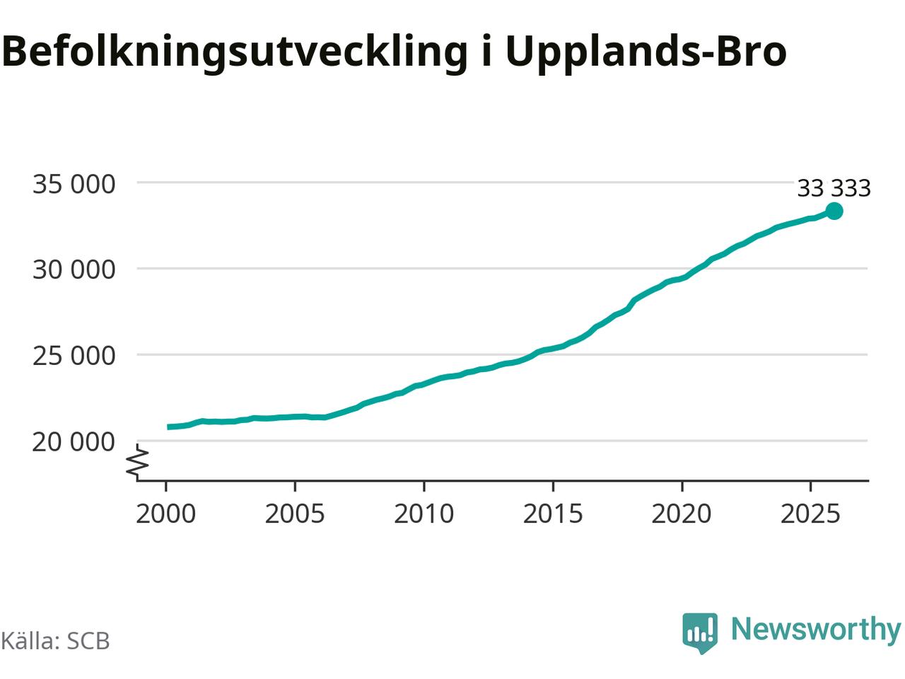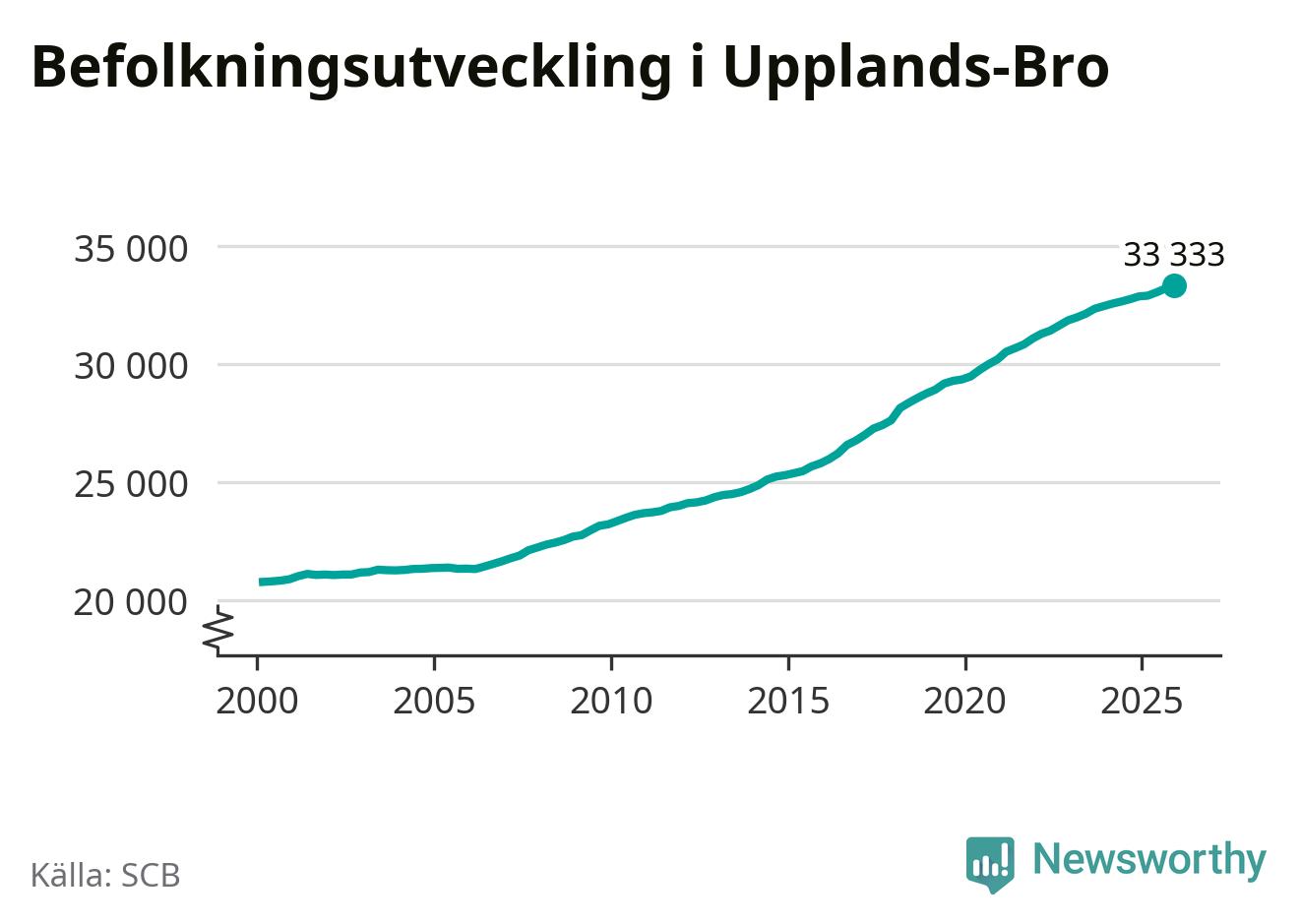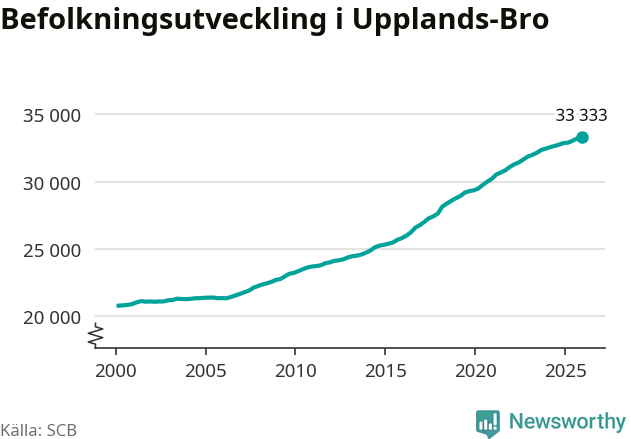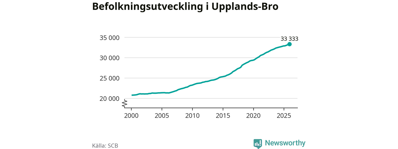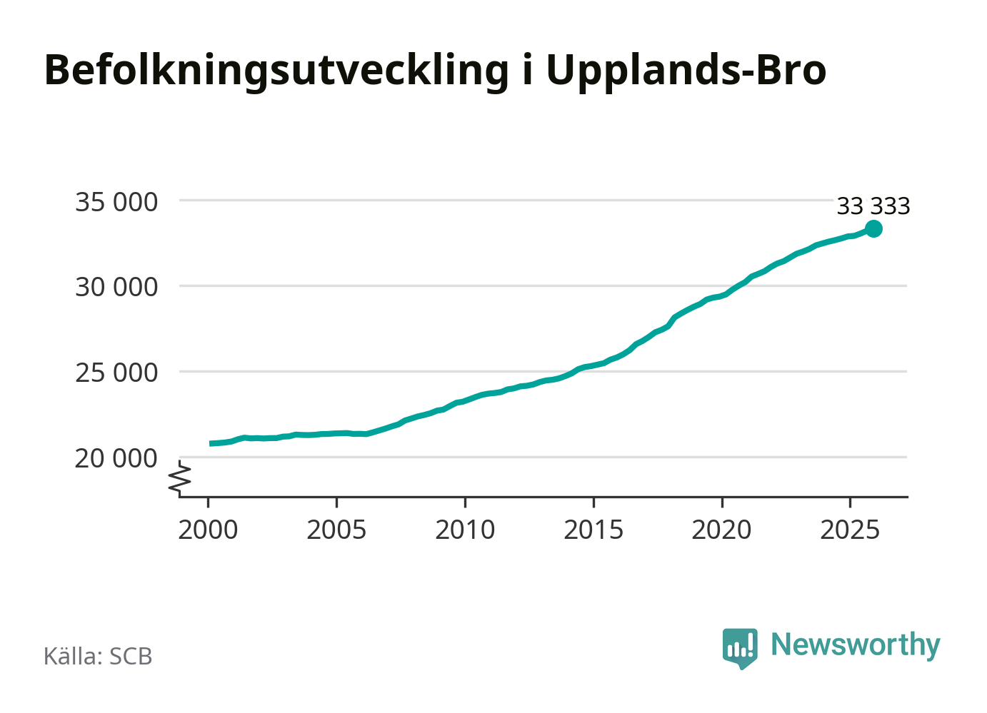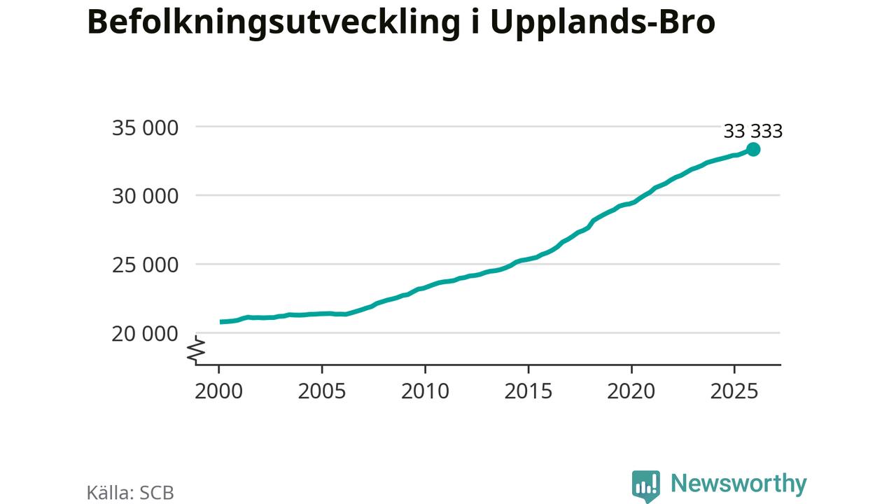 Befolkningen ökade i Upplands-Bro kommun under det fjärde kvartalet 2025. Den 31 december bodde enligt SCB:s senaste siffror 33 333 personer i kommunen, vilket är 129 fler än i slutet av tredje kvartalet. Folkökningen är den näst största i Stockholms län procentuellt sett.