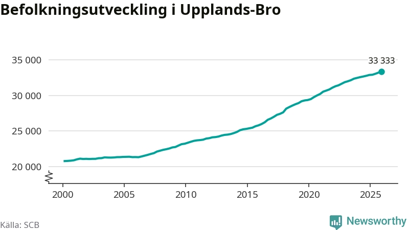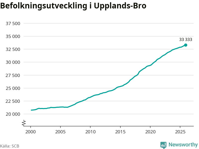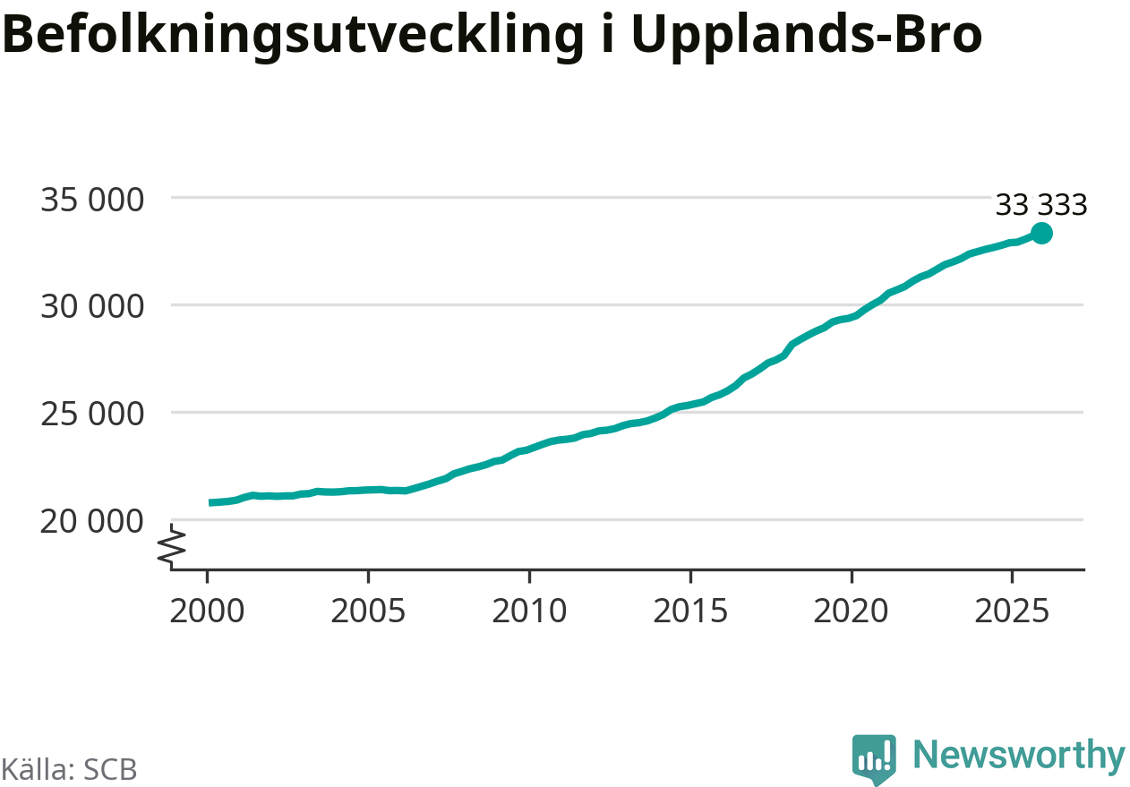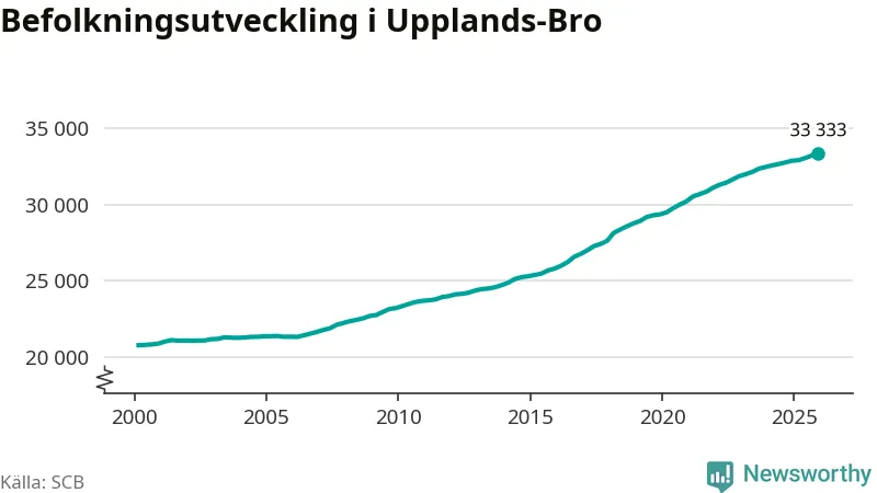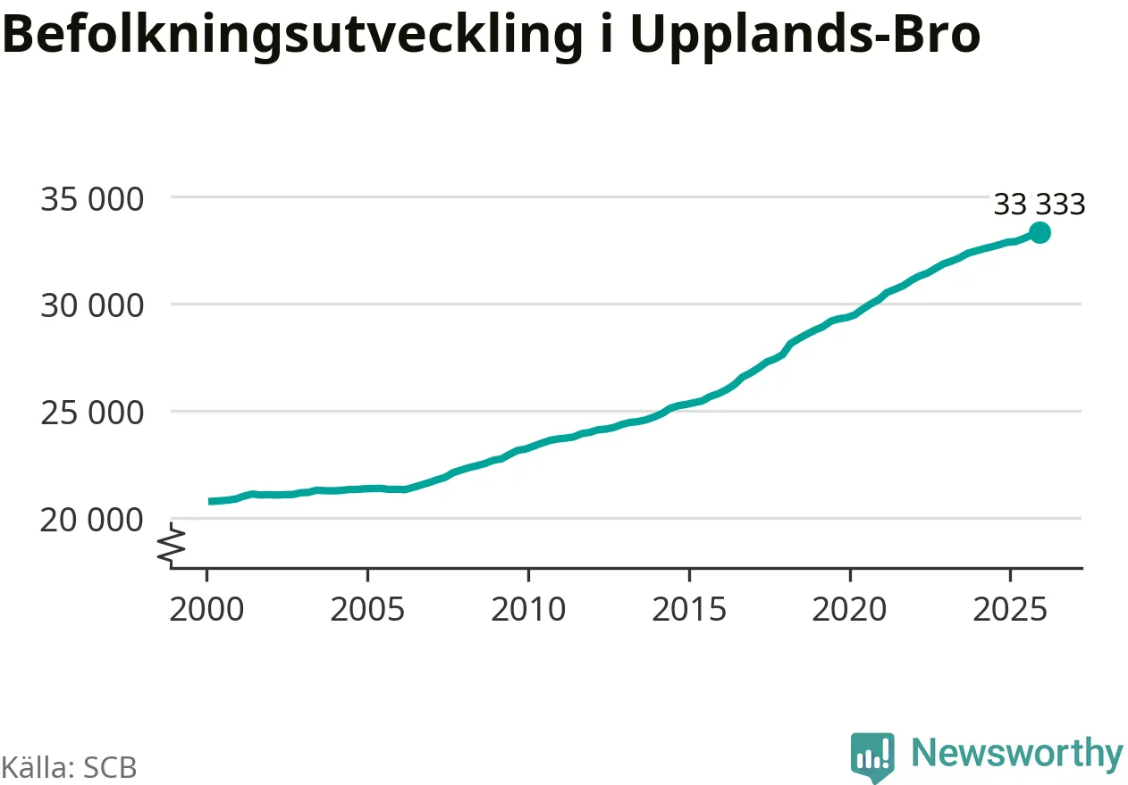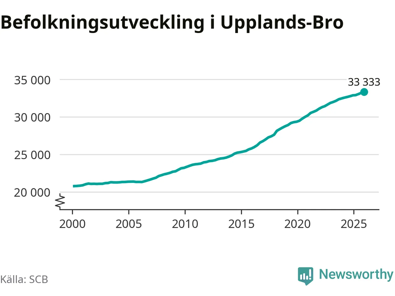 Befolkningen ökade i Upplands-Bro kommun under det fjärde kvartalet 2025. Den 31 december bodde enligt SCB:s senaste siffror 33 333 personer i kommunen, vilket är 129 fler än i slutet av tredje kvartalet. Folkökningen är den näst största i Stockholms län procentuellt sett.