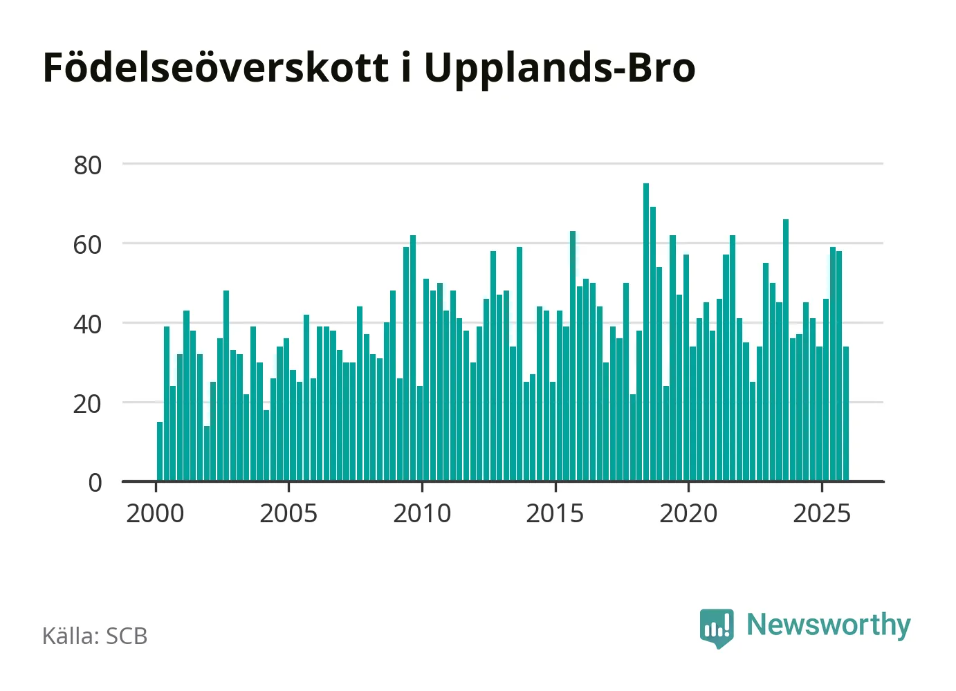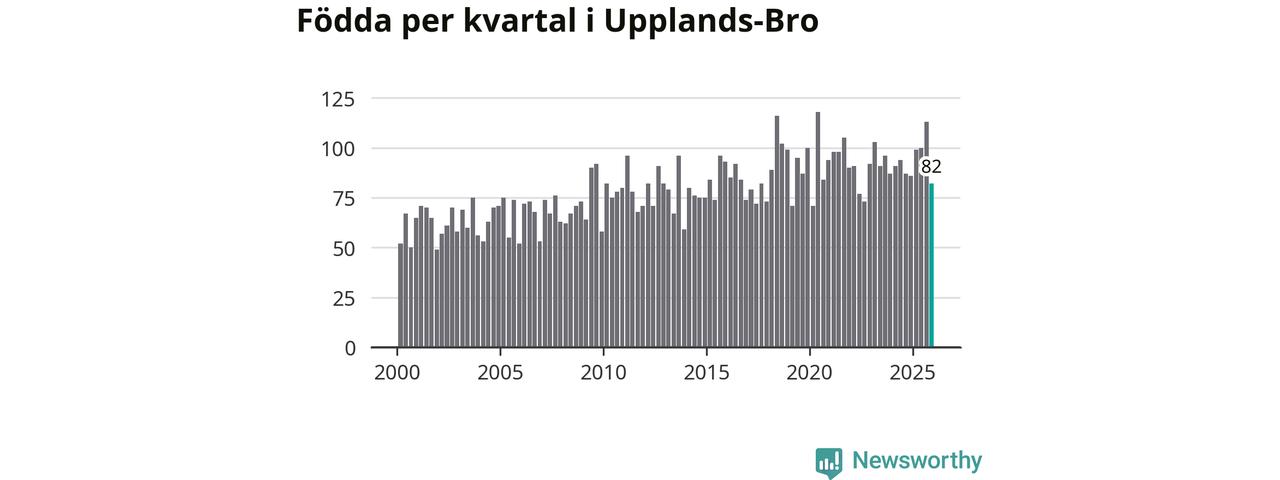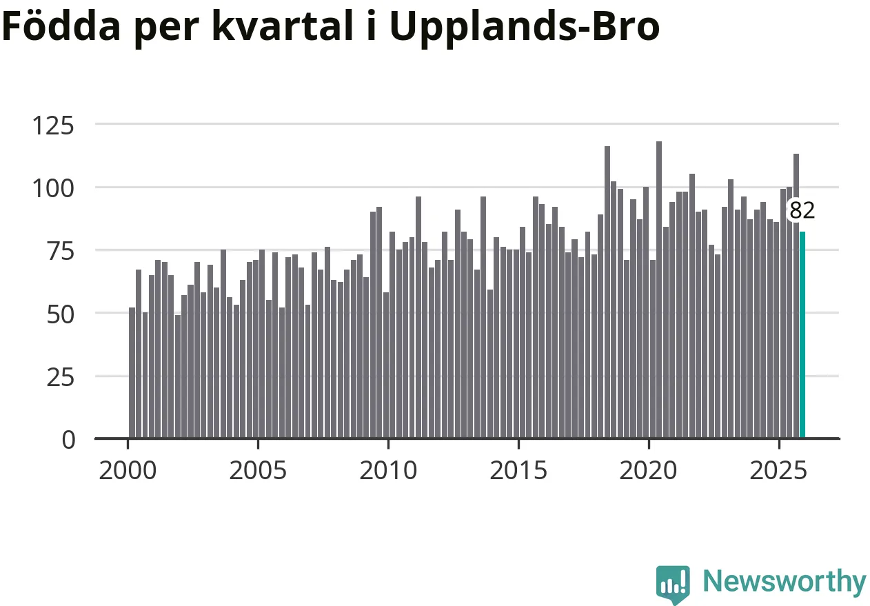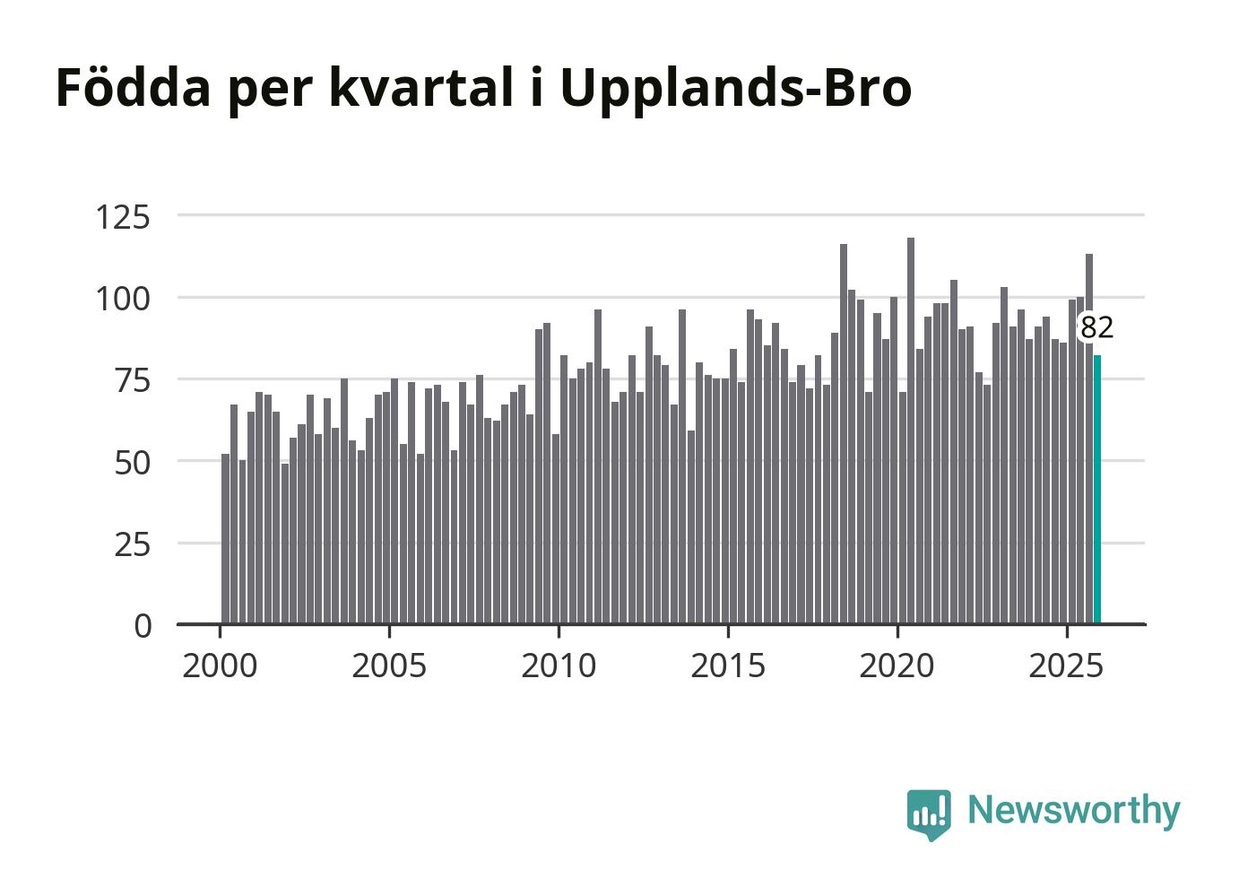 Enligt SCB:s siffror föddes 82 barn i Upplands-Bro under det senaste kvartalet. Samtidigt avled 48 personer. Upplands-Bro hade alltså ett positivt födelsenetto, vilket kommunen historiskt sett i princip alltid har haft.