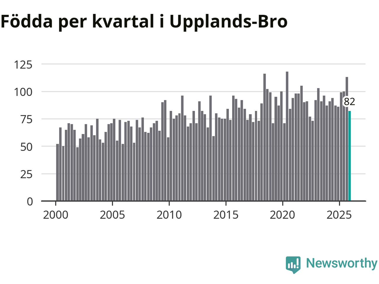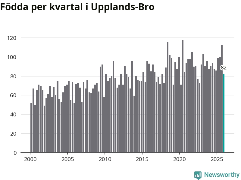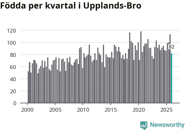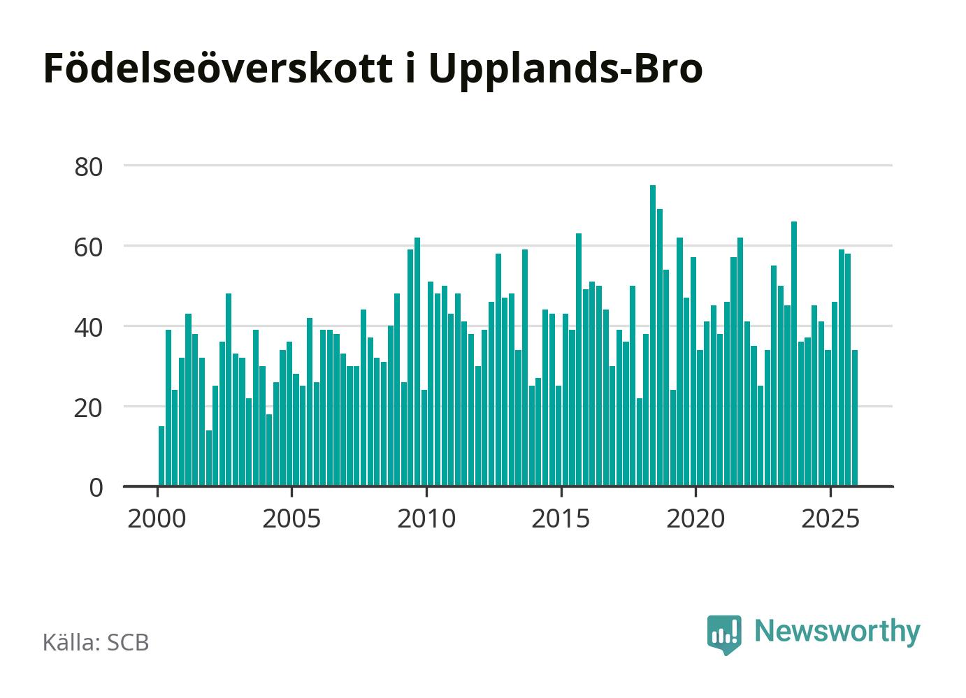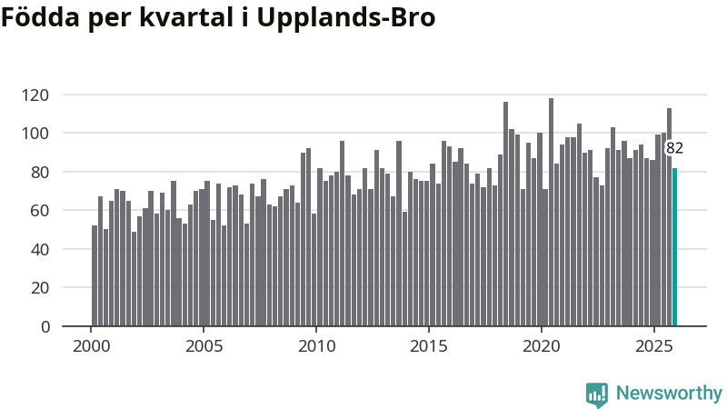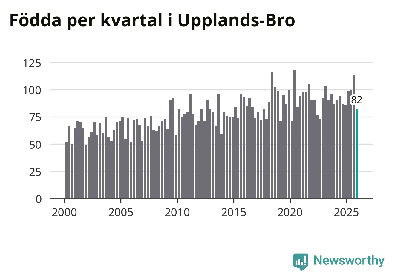 Enligt SCB:s siffror föddes 82 barn i Upplands-Bro under det senaste kvartalet. Samtidigt avled 48 personer. Upplands-Bro hade alltså ett positivt födelsenetto, vilket kommunen historiskt sett i princip alltid har haft.