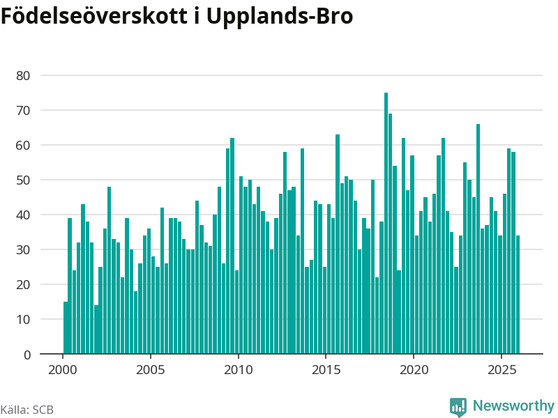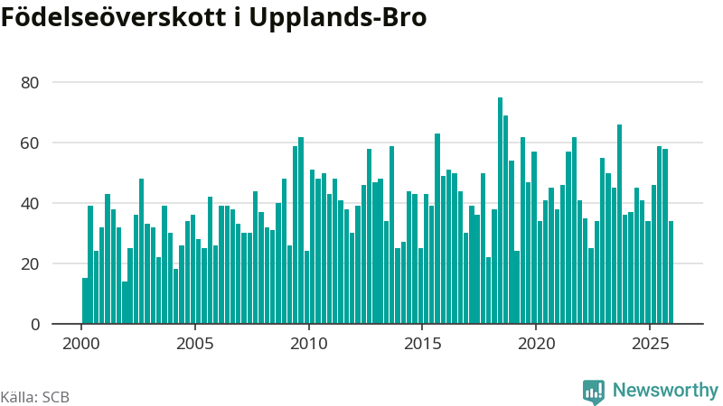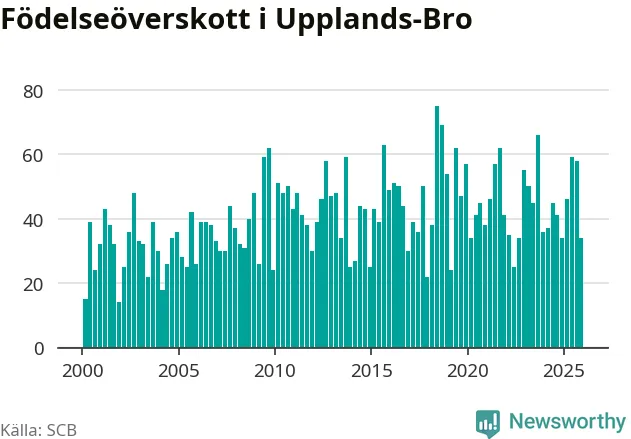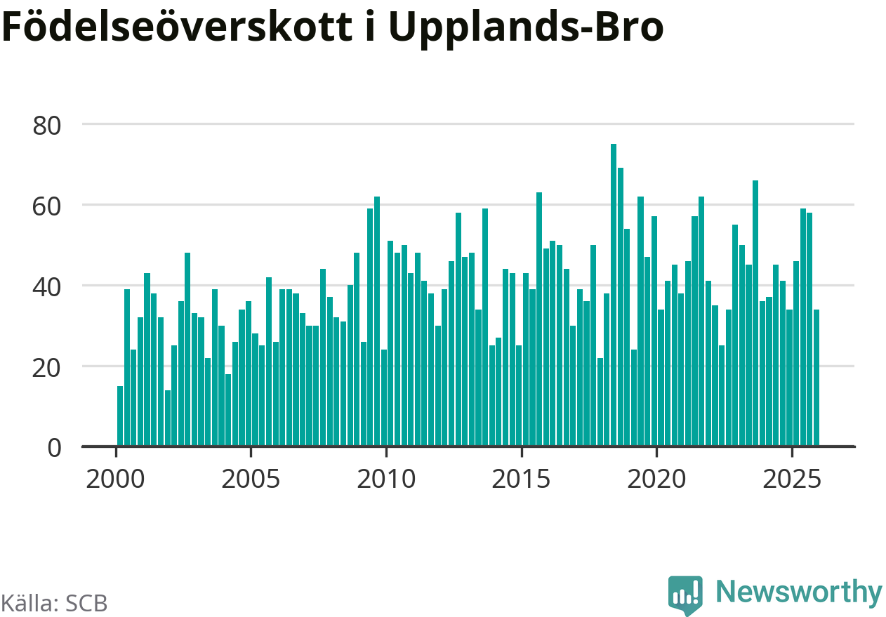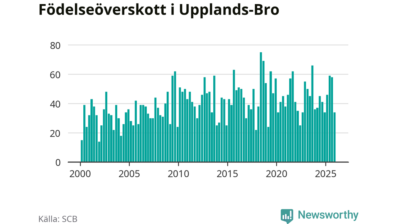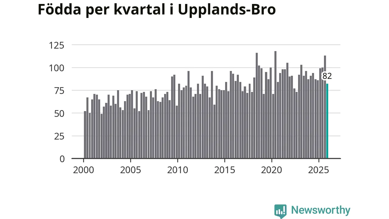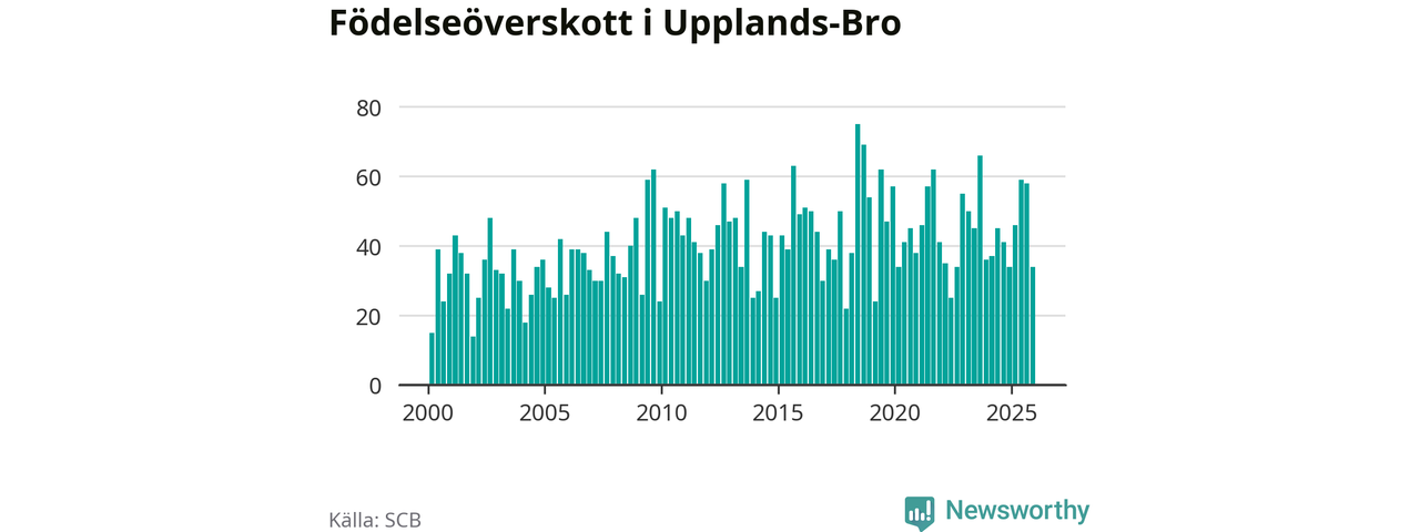 Enligt SCB:s siffror föddes 82 barn i Upplands-Bro under det senaste kvartalet. Samtidigt avled 48 personer. Upplands-Bro hade alltså ett positivt födelsenetto, vilket kommunen historiskt sett i princip alltid har haft.