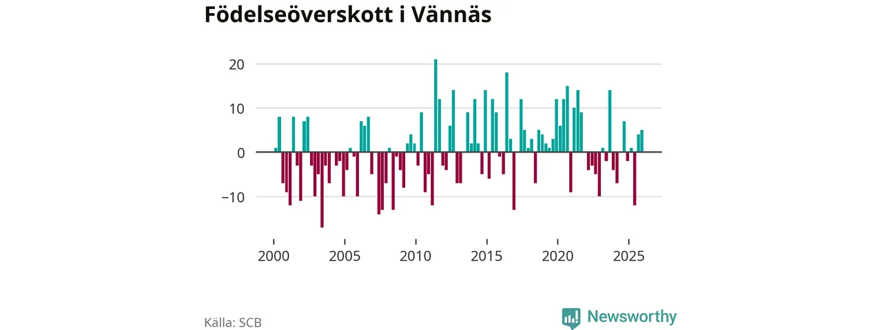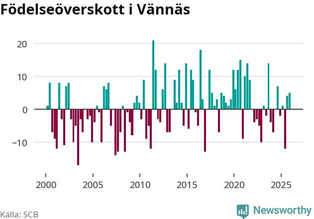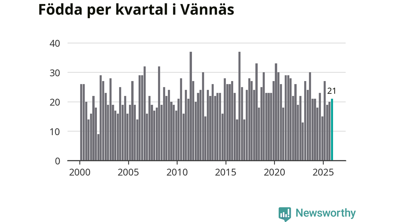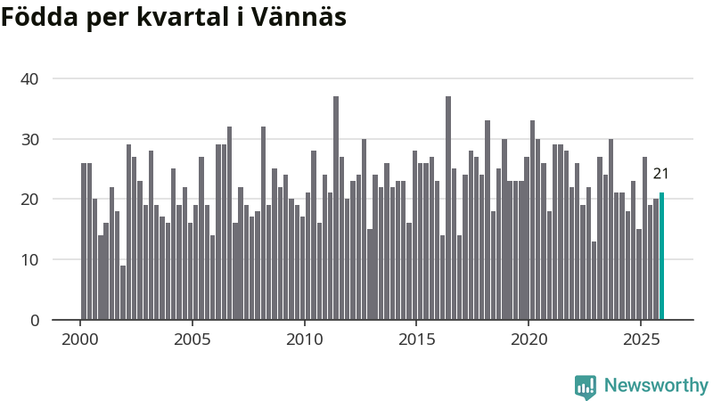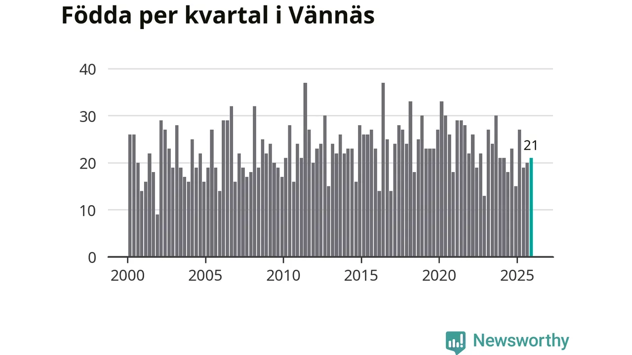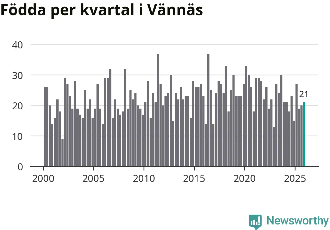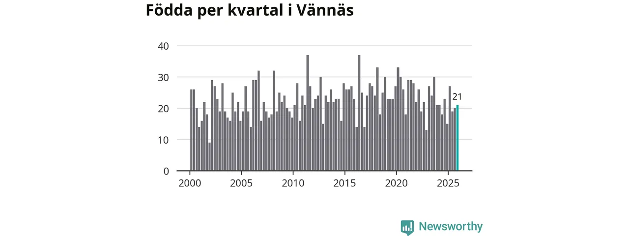 Enligt SCB:s siffror föddes 21 barn i Vännäs under det senaste kvartalet. Samtidigt avled 16 personer. Skillnaden mellan antal födda och döda är så liten att det inte går att säga om det beror på något annat än SCB:s röjandeskydd. Kommunen har historiskt sett haft ungefär lika många kvartal med positivt födelsenetto som negativt.