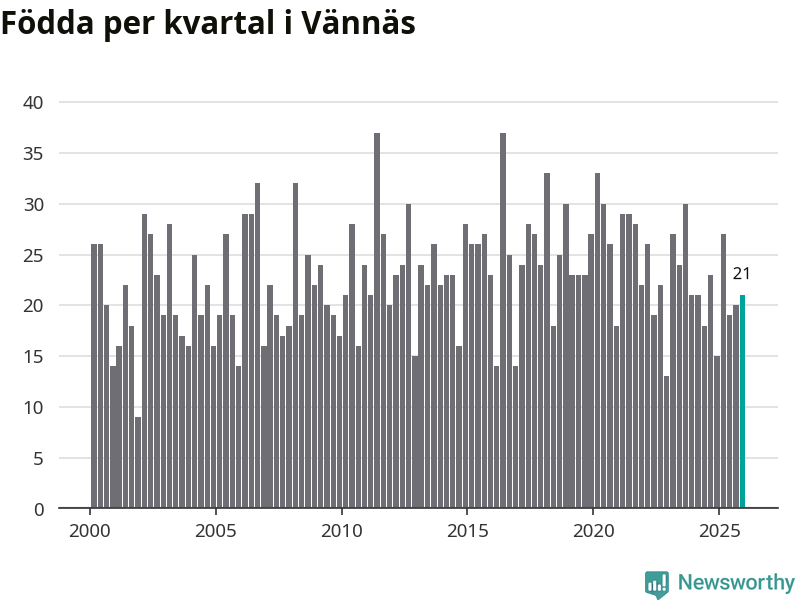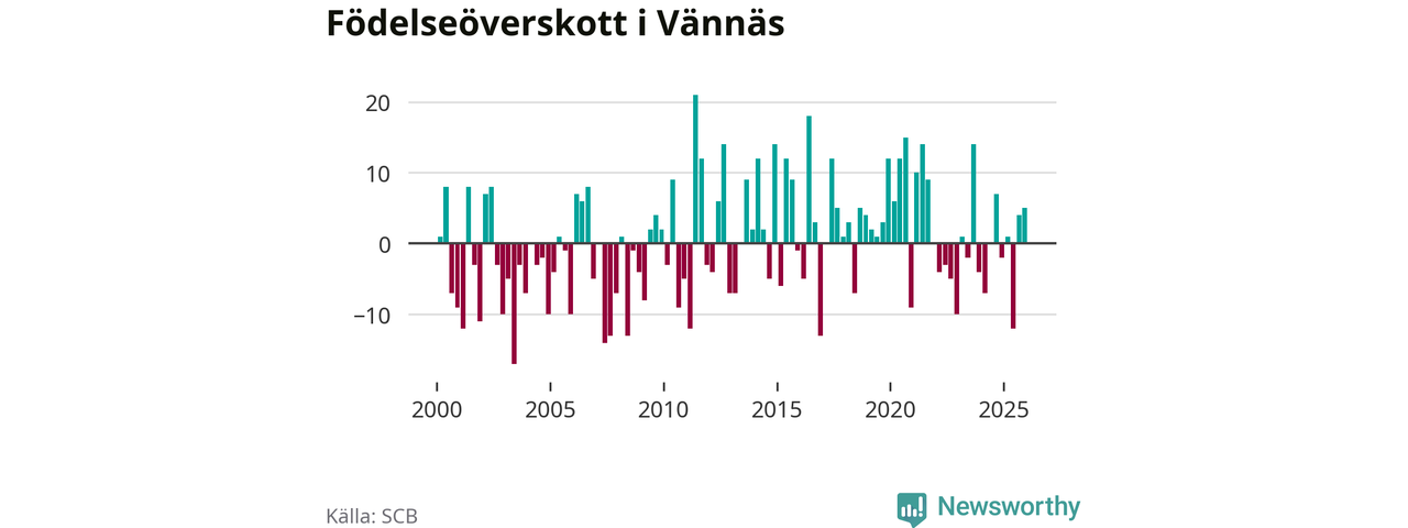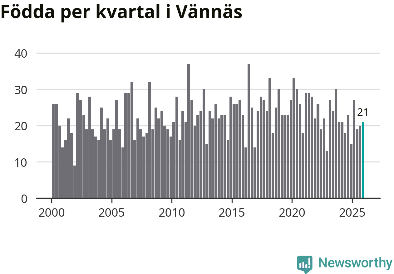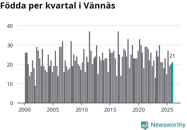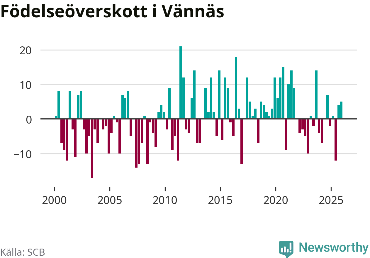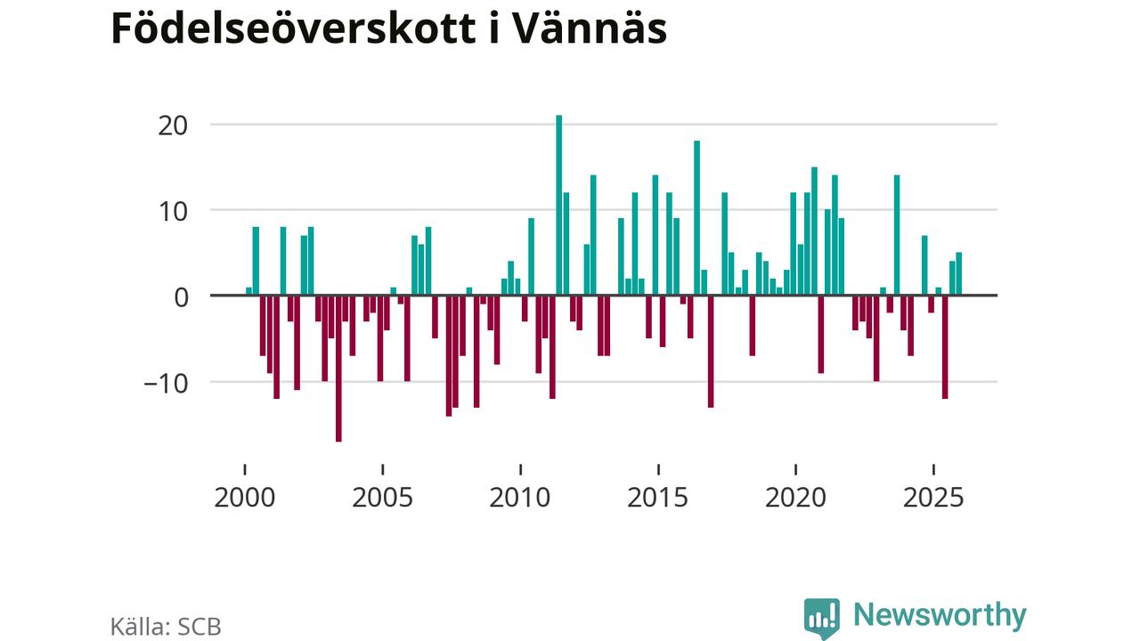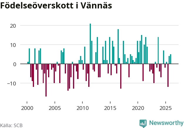 Enligt SCB:s siffror föddes 21 barn i Vännäs under det senaste kvartalet. Samtidigt avled 16 personer. Skillnaden mellan antal födda och döda är så liten att det inte går att säga om det beror på något annat än SCB:s röjandeskydd. Kommunen har historiskt sett haft ungefär lika många kvartal med positivt födelsenetto som negativt.