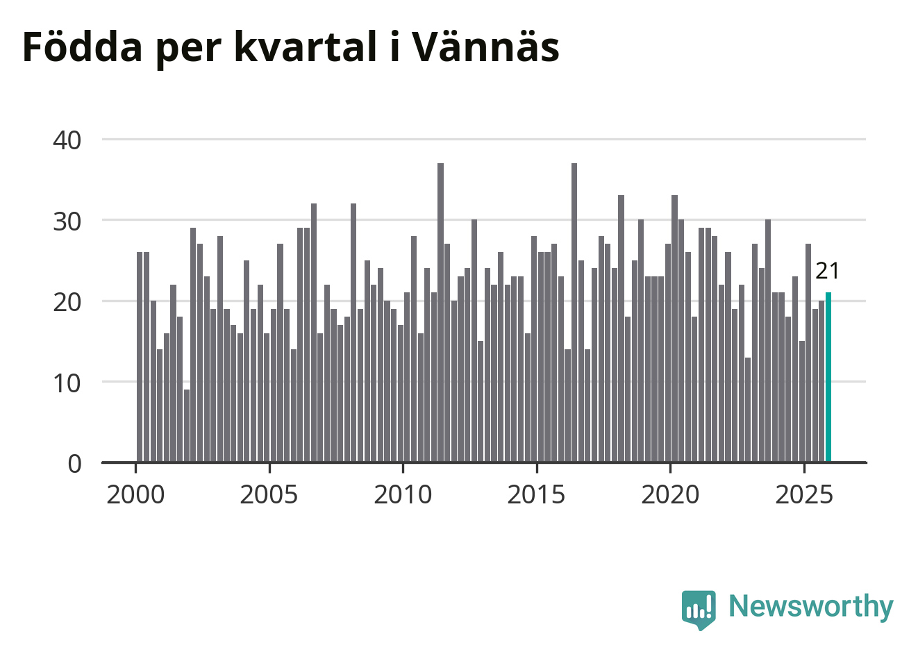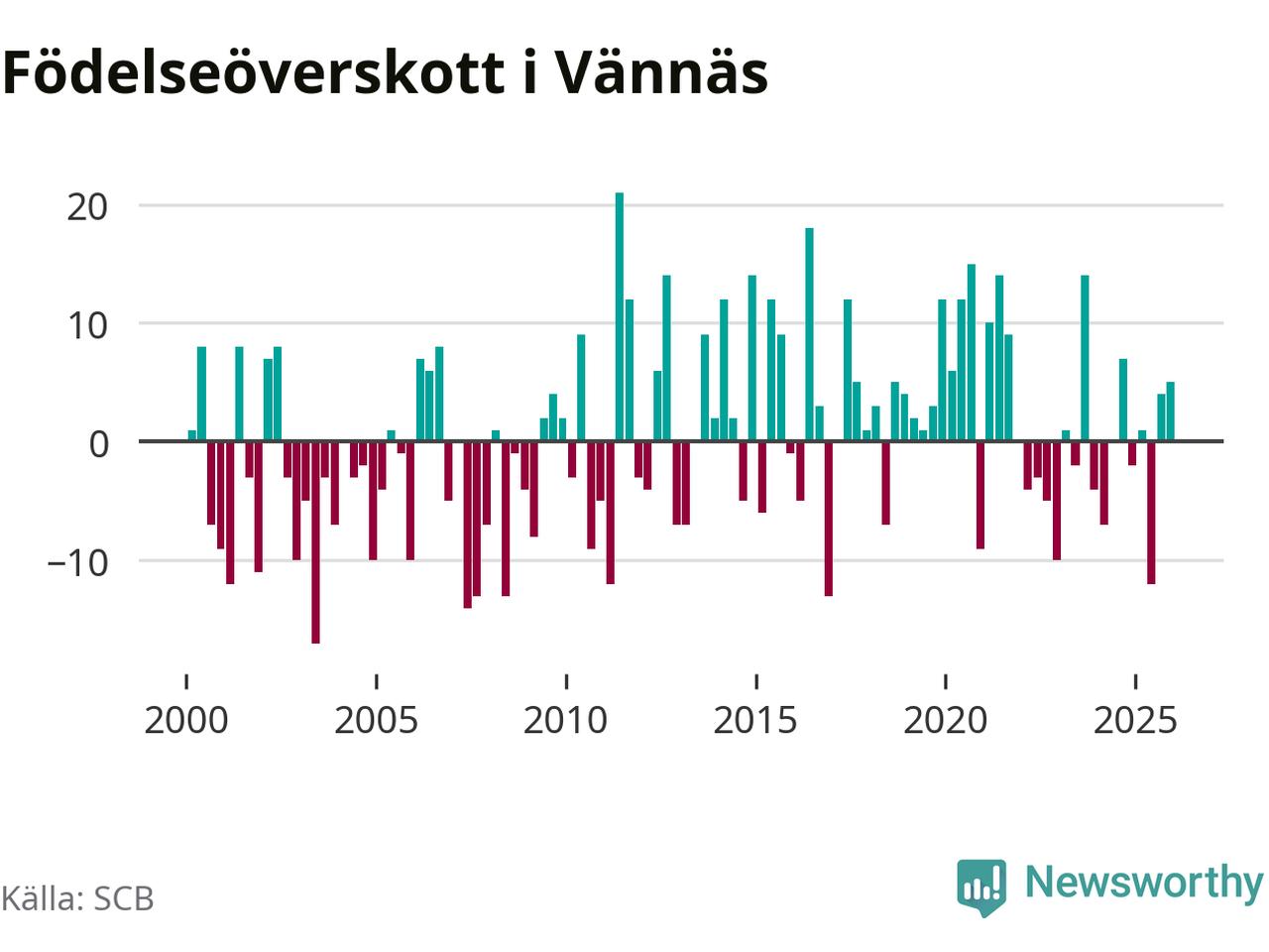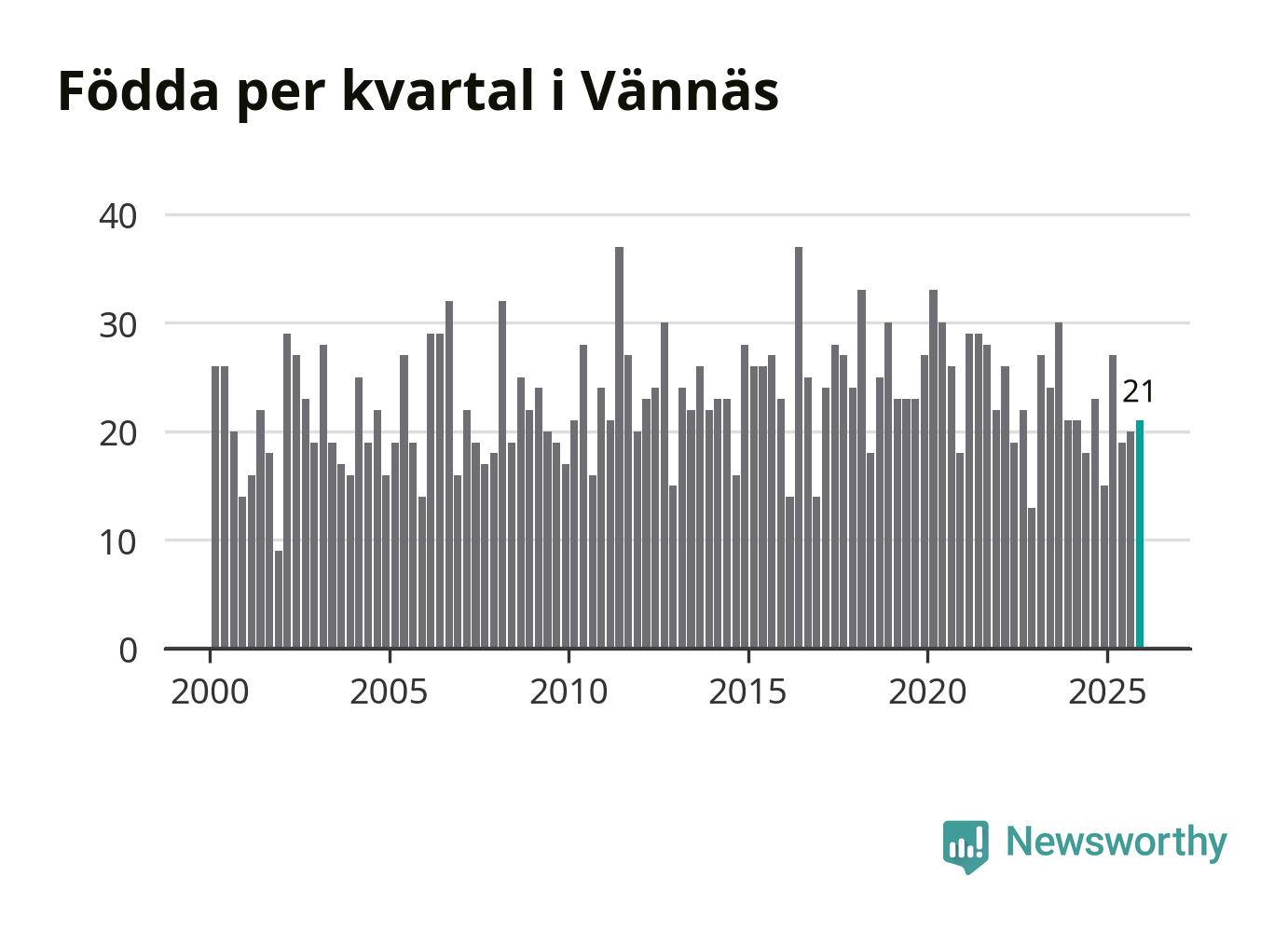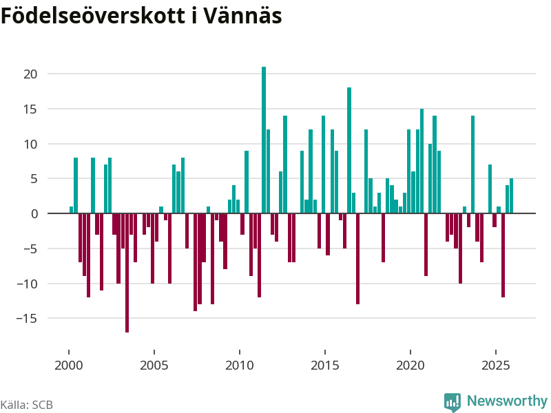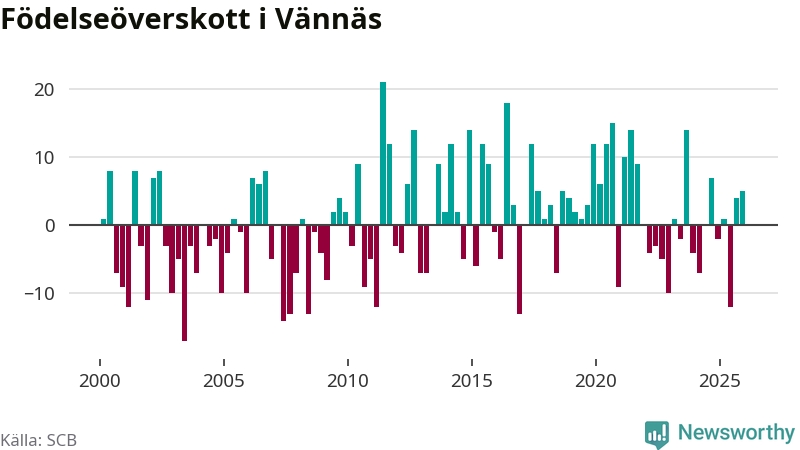 Enligt SCB:s siffror föddes 21 barn i Vännäs under det senaste kvartalet. Samtidigt avled 16 personer. Skillnaden mellan antal födda och döda är så liten att det inte går att säga om det beror på något annat än SCB:s röjandeskydd. Kommunen har historiskt sett haft ungefär lika många kvartal med positivt födelsenetto som negativt.
