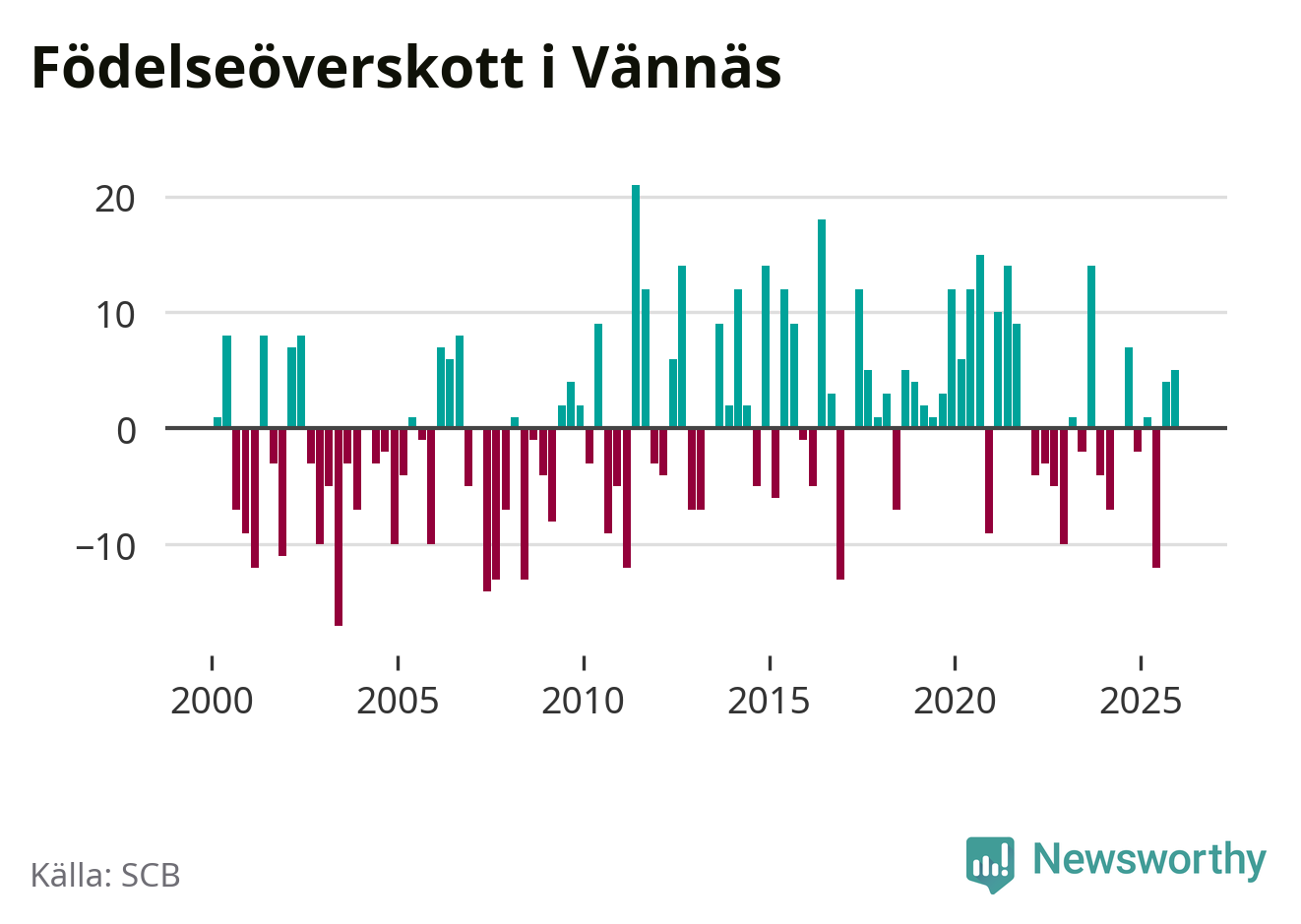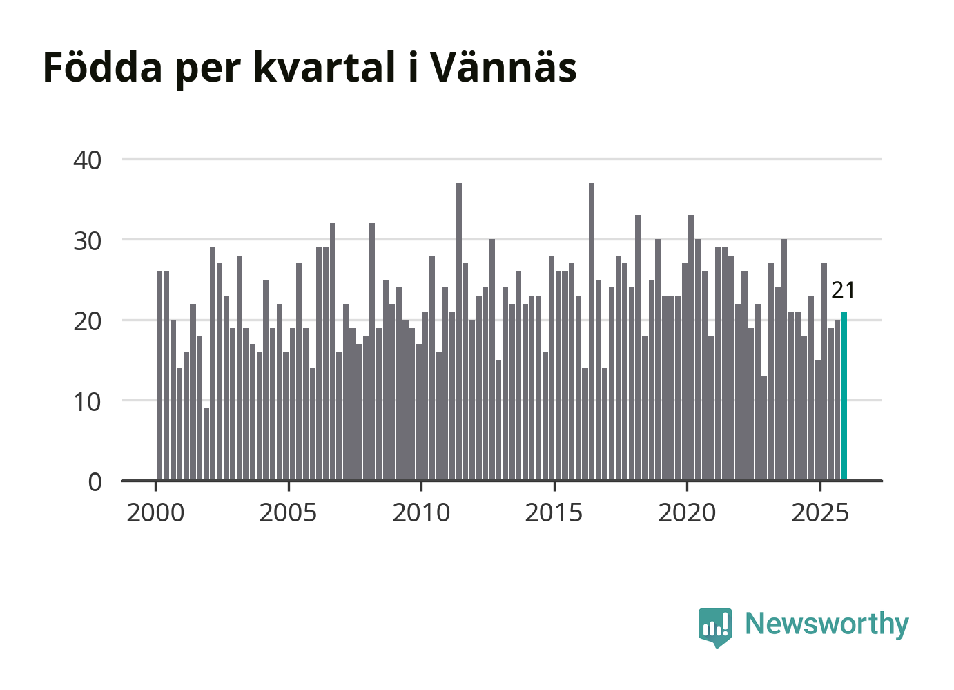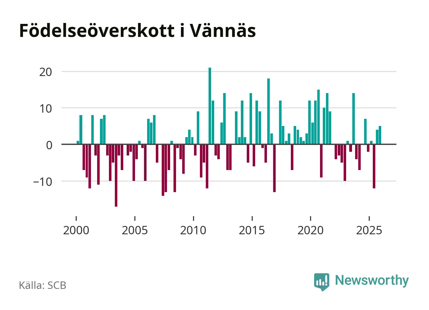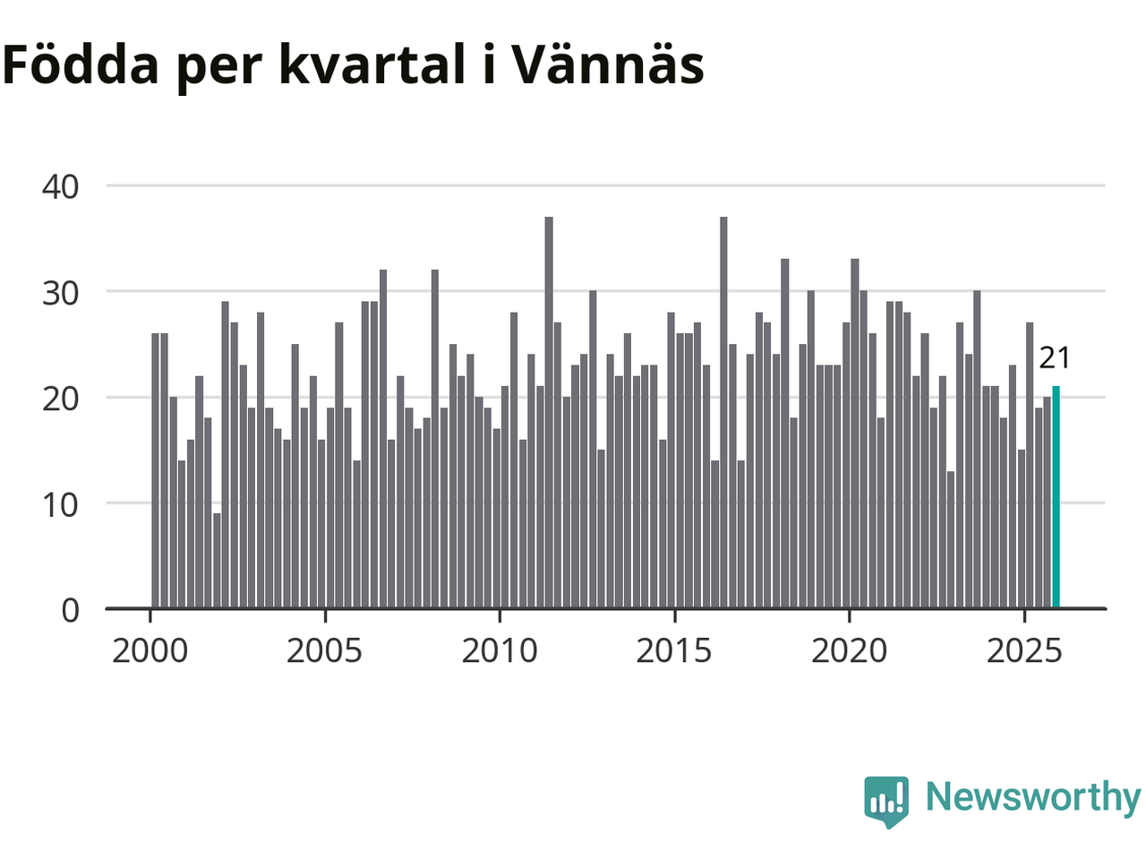 Enligt SCB:s siffror föddes 21 barn i Vännäs under det senaste kvartalet. Samtidigt avled 16 personer. Skillnaden mellan antal födda och döda är så liten att det inte går att säga om det beror på något annat än SCB:s röjandeskydd. Kommunen har historiskt sett haft ungefär lika många kvartal med positivt födelsenetto som negativt.
