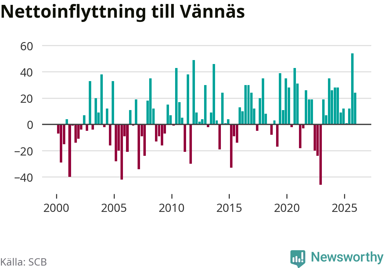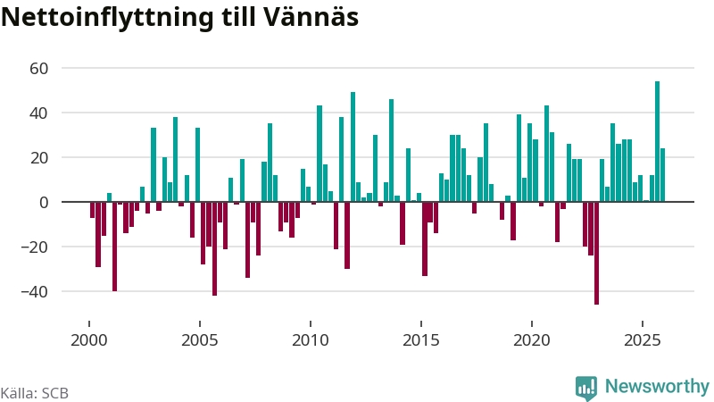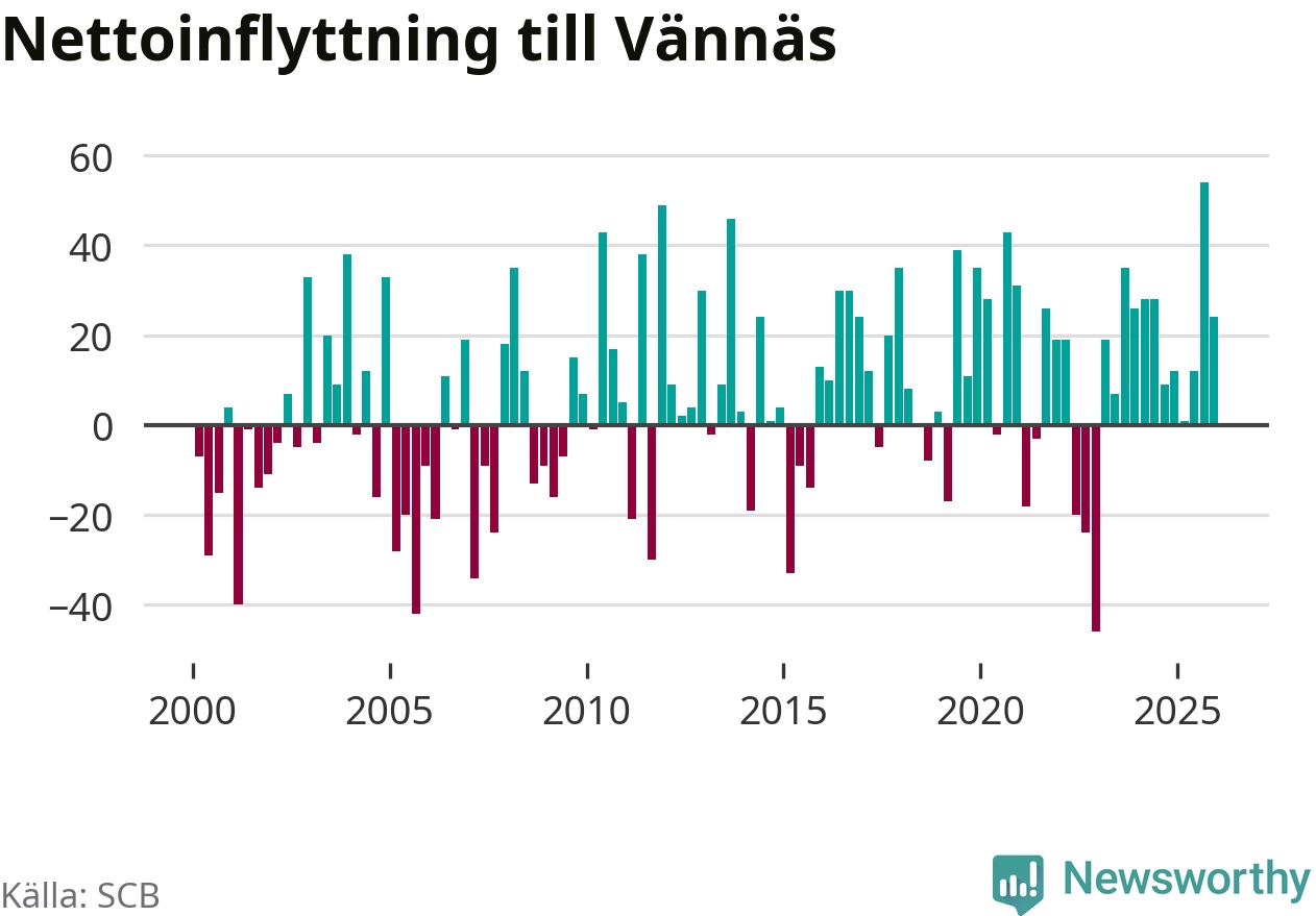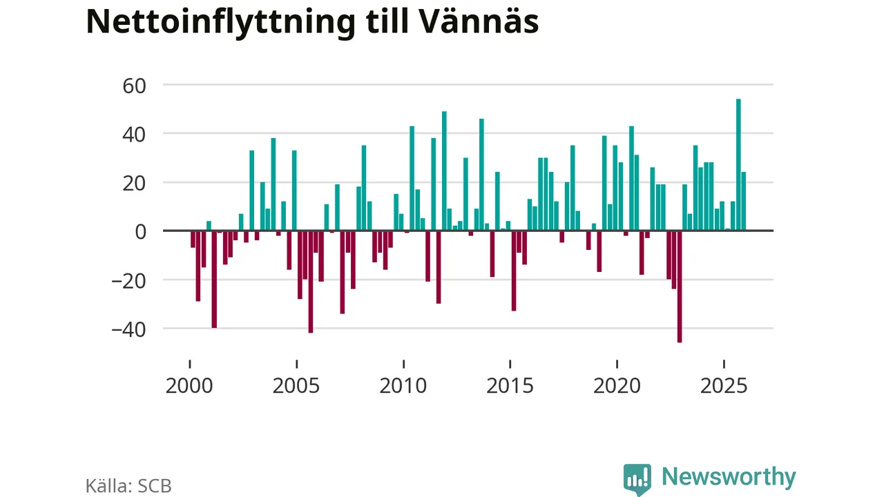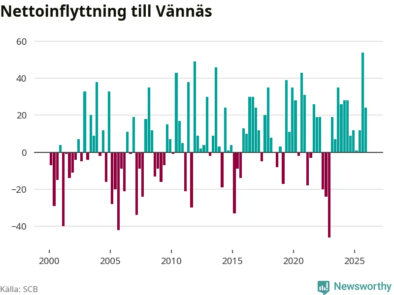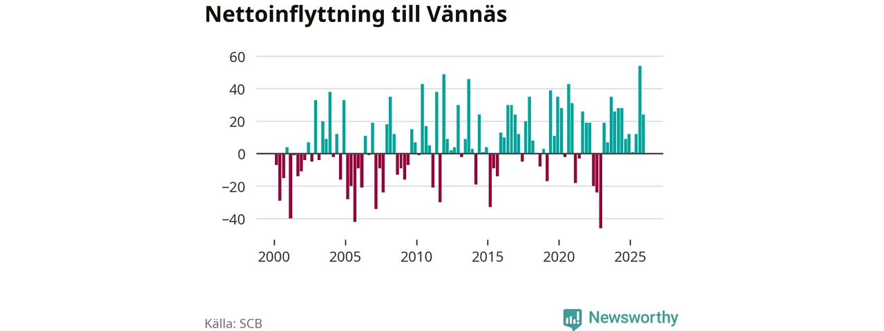 Under fjärde kvartalet 2025 flyttade 114 personer till kommunen medan 90 personer flyttade därifrån. Sedan seklets början har Vännäs oftast haft ett positivt flyttnetto, inklusive det senaste kvartalet.