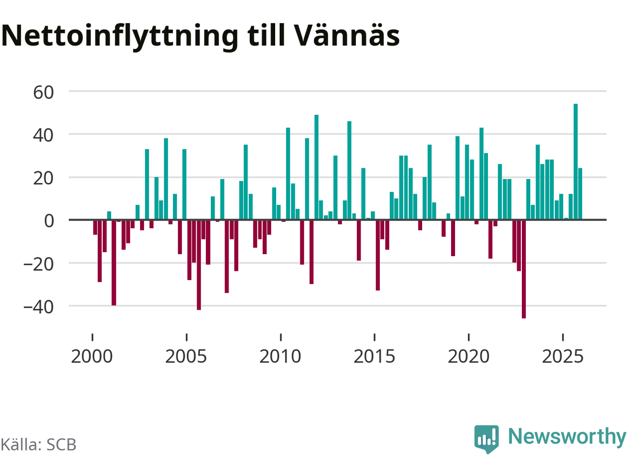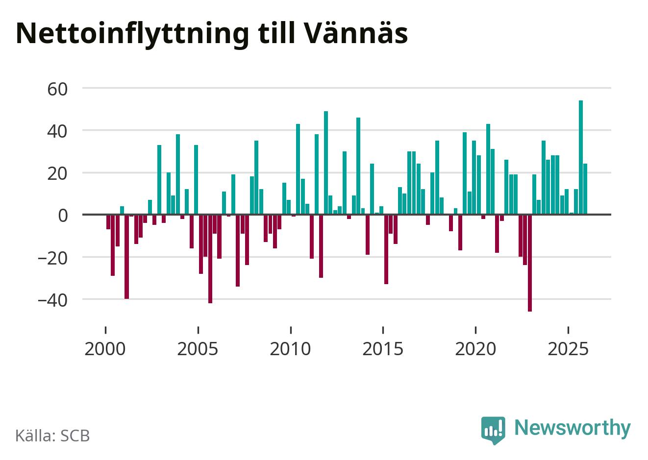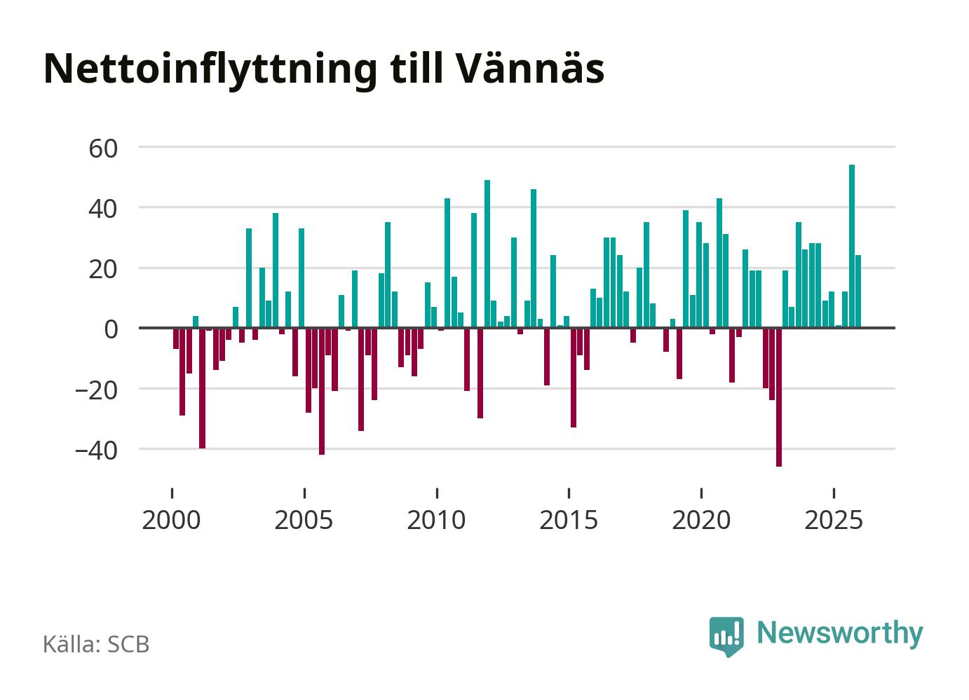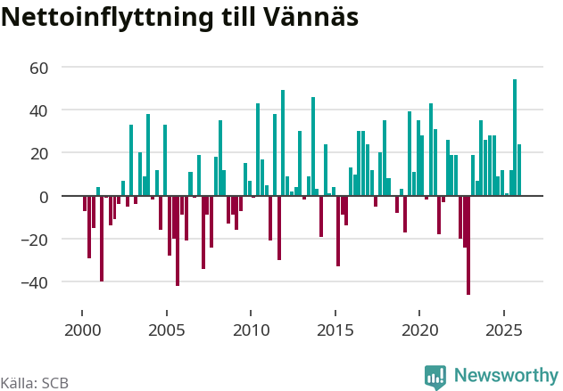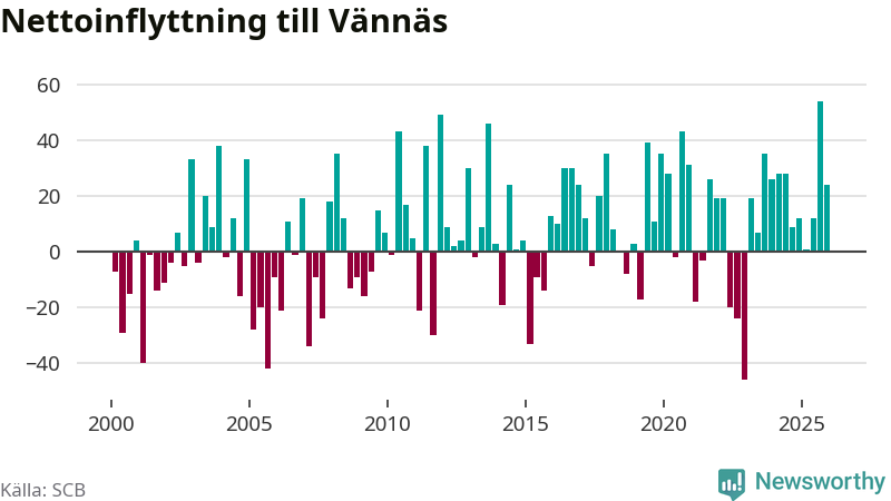 Under fjärde kvartalet 2025 flyttade 114 personer till kommunen medan 90 personer flyttade därifrån. Sedan seklets början har Vännäs oftast haft ett positivt flyttnetto, inklusive det senaste kvartalet.