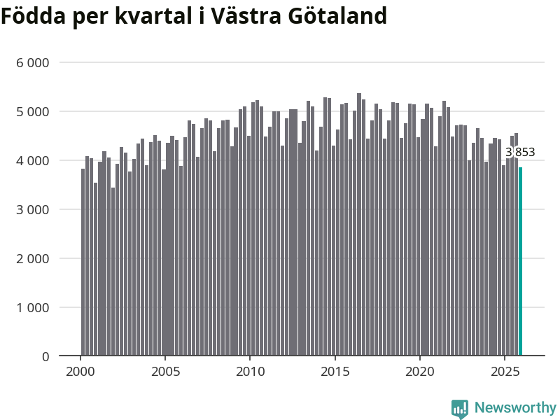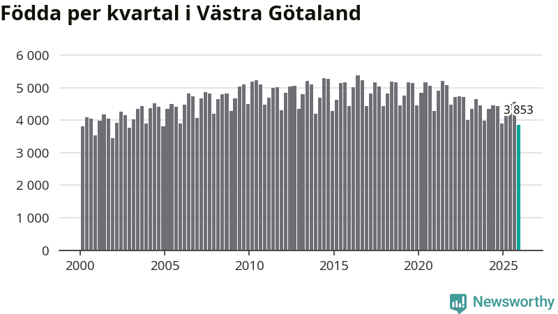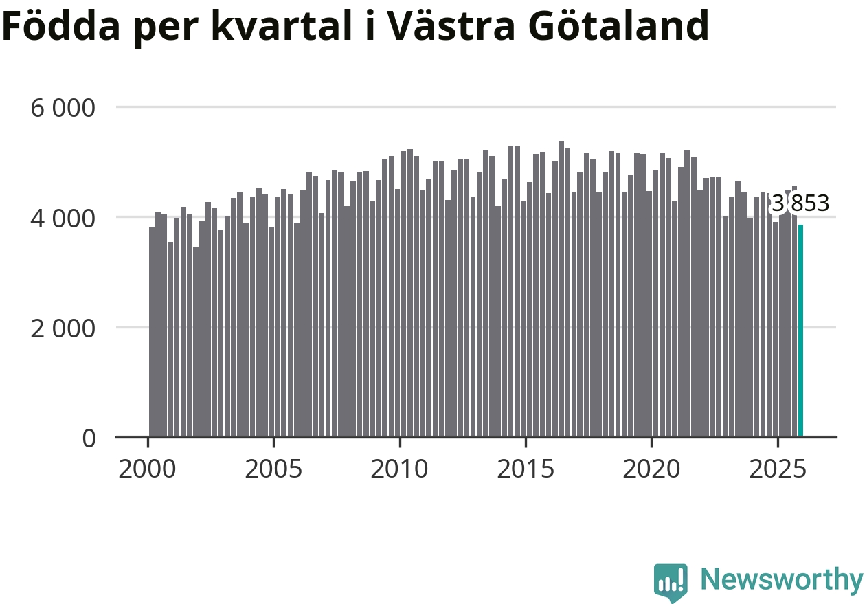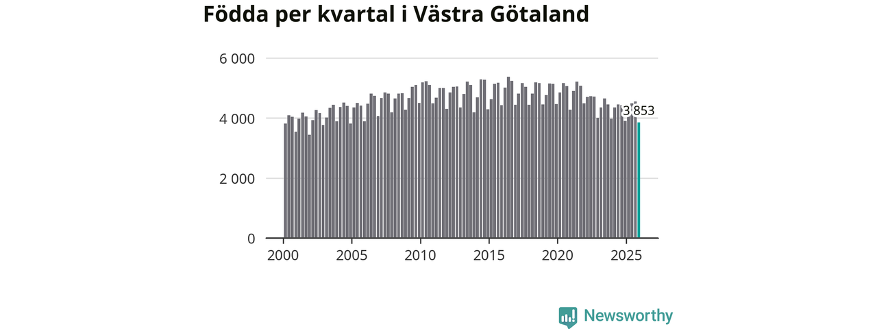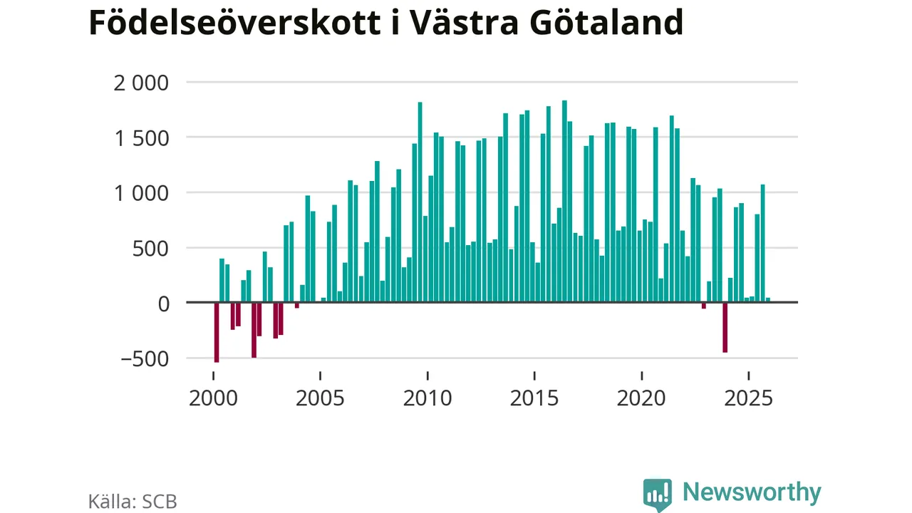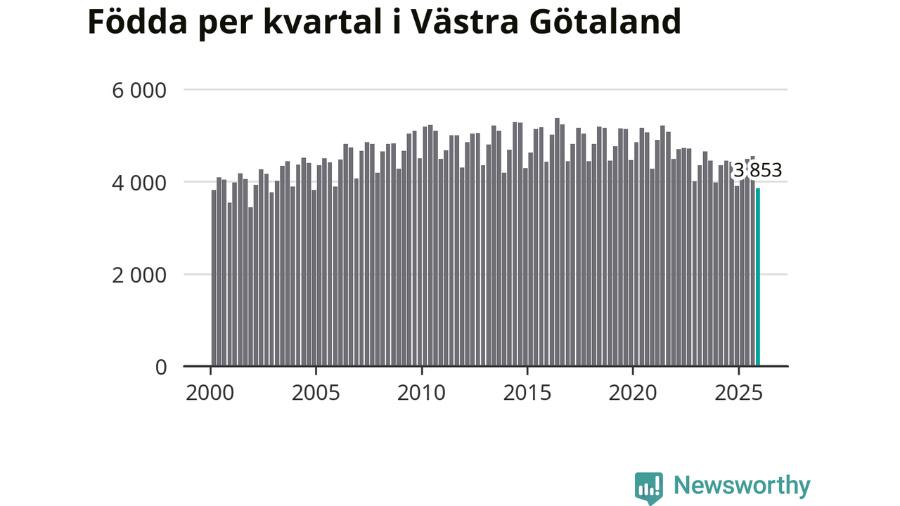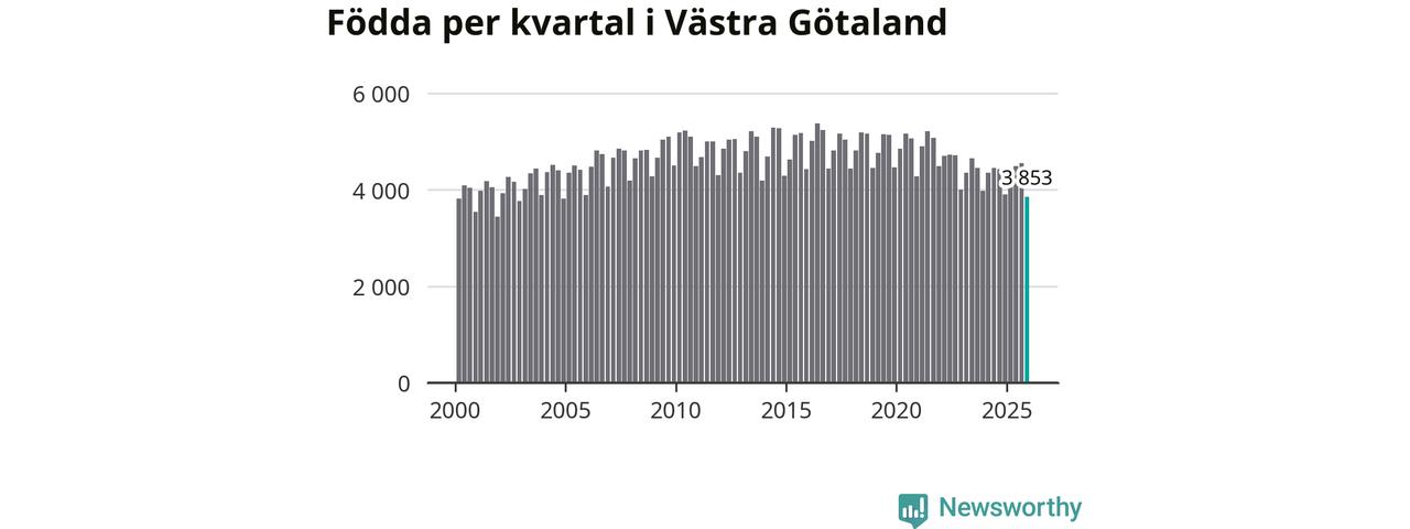 Enligt SCB:s siffror föddes 3 853 barn i Västra Götaland under det senaste kvartalet. Samtidigt avled 3 811 personer. Västra Götaland hade alltså ett positivt födelsenetto, vilket länet historiskt sett nästan alltid har haft.