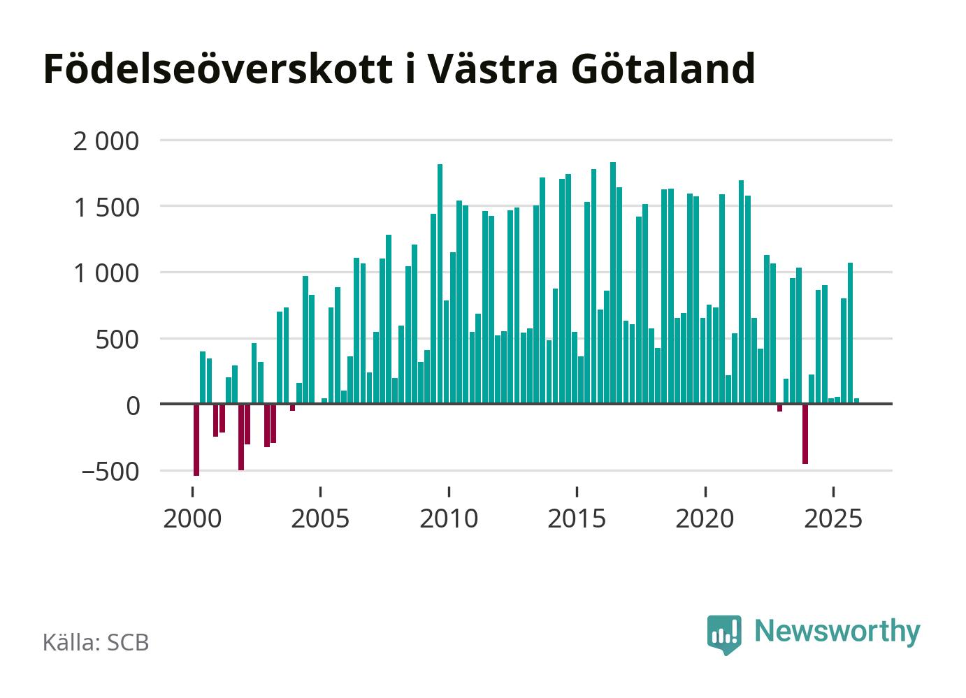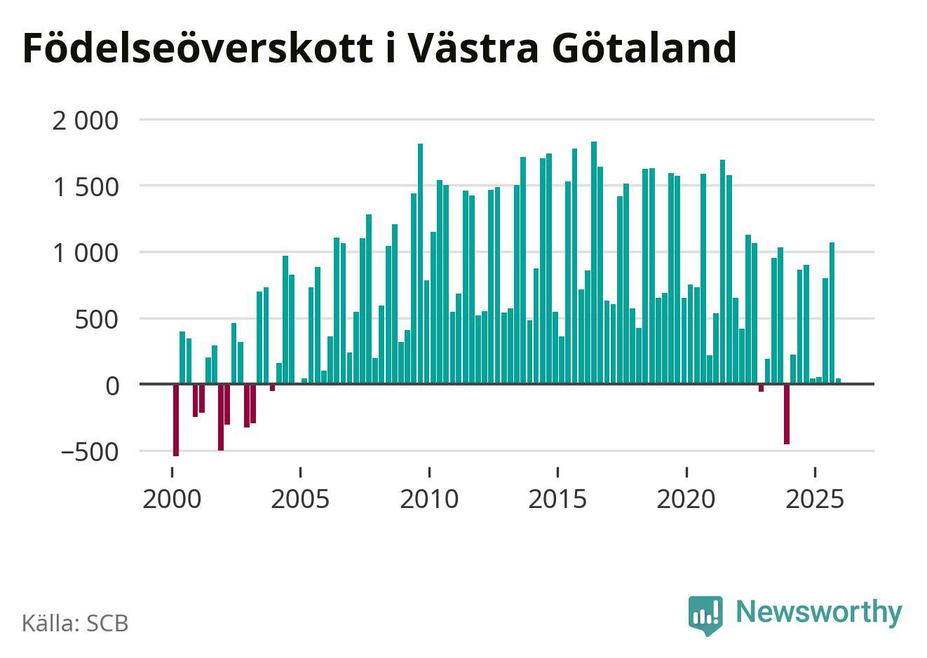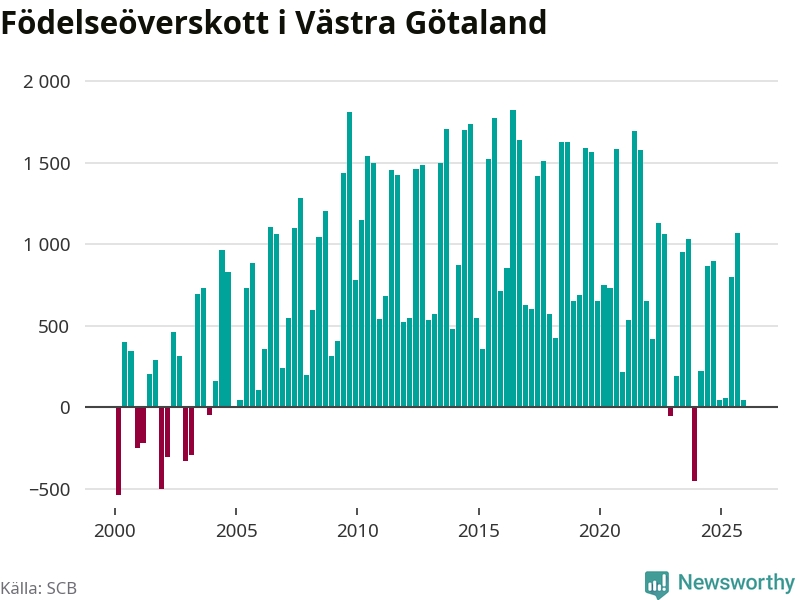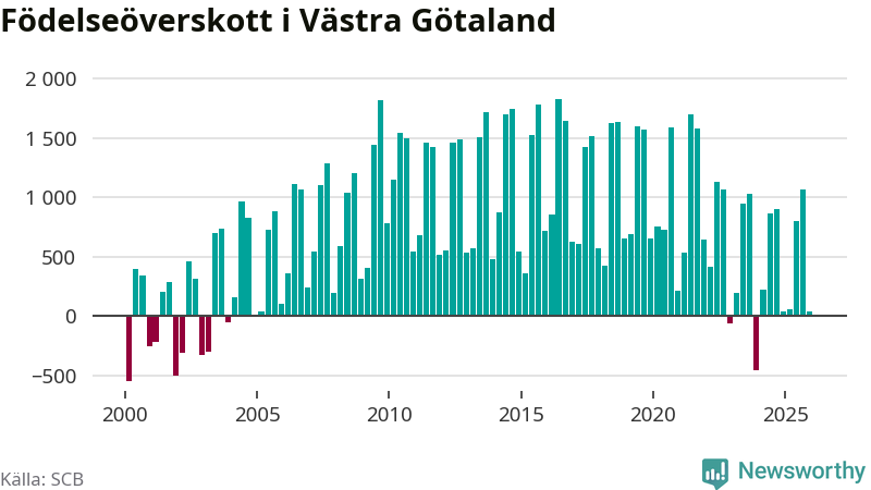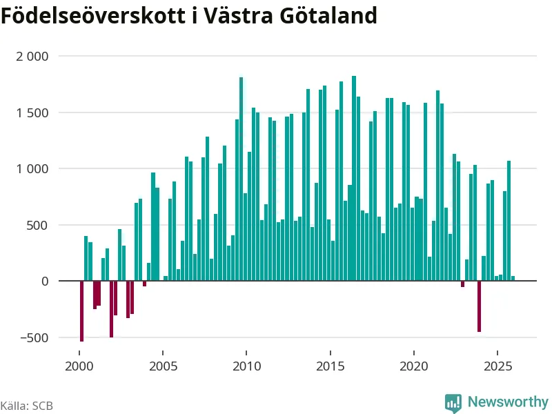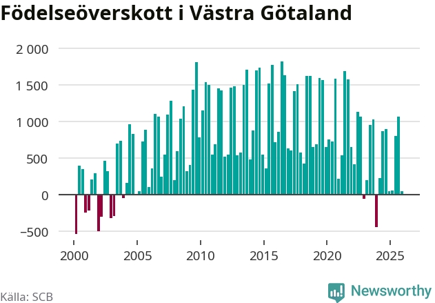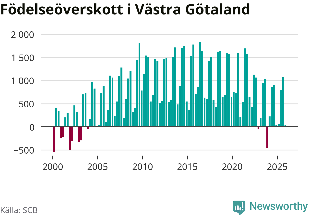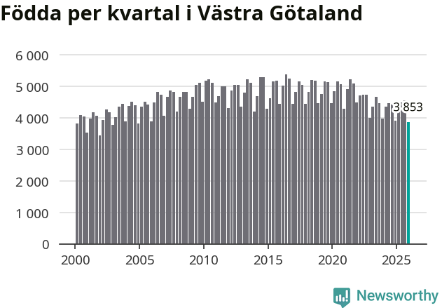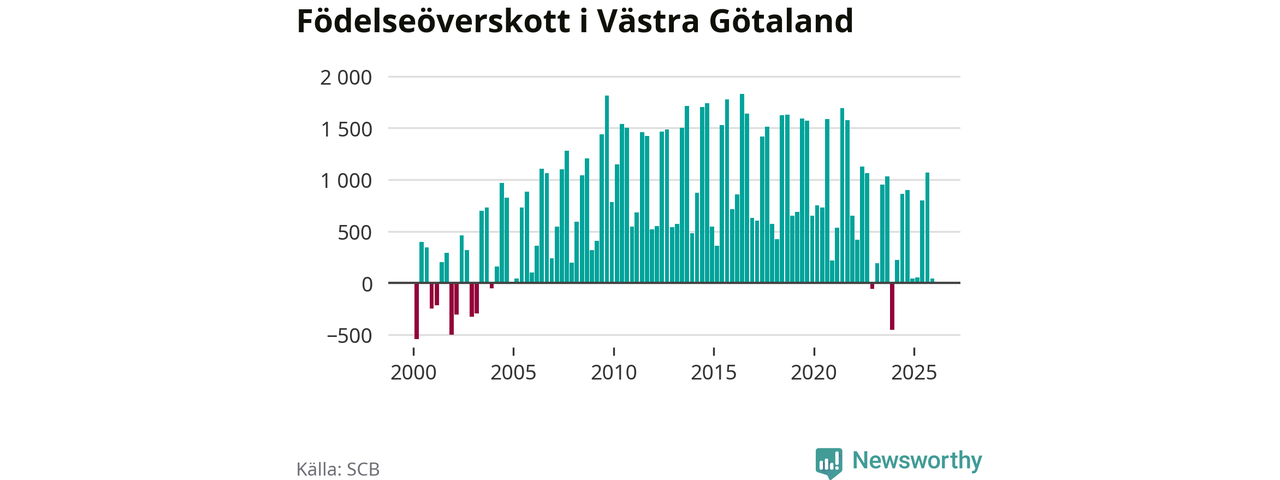 Enligt SCB:s siffror föddes 3 853 barn i Västra Götaland under det senaste kvartalet. Samtidigt avled 3 811 personer. Västra Götaland hade alltså ett positivt födelsenetto, vilket länet historiskt sett nästan alltid har haft.