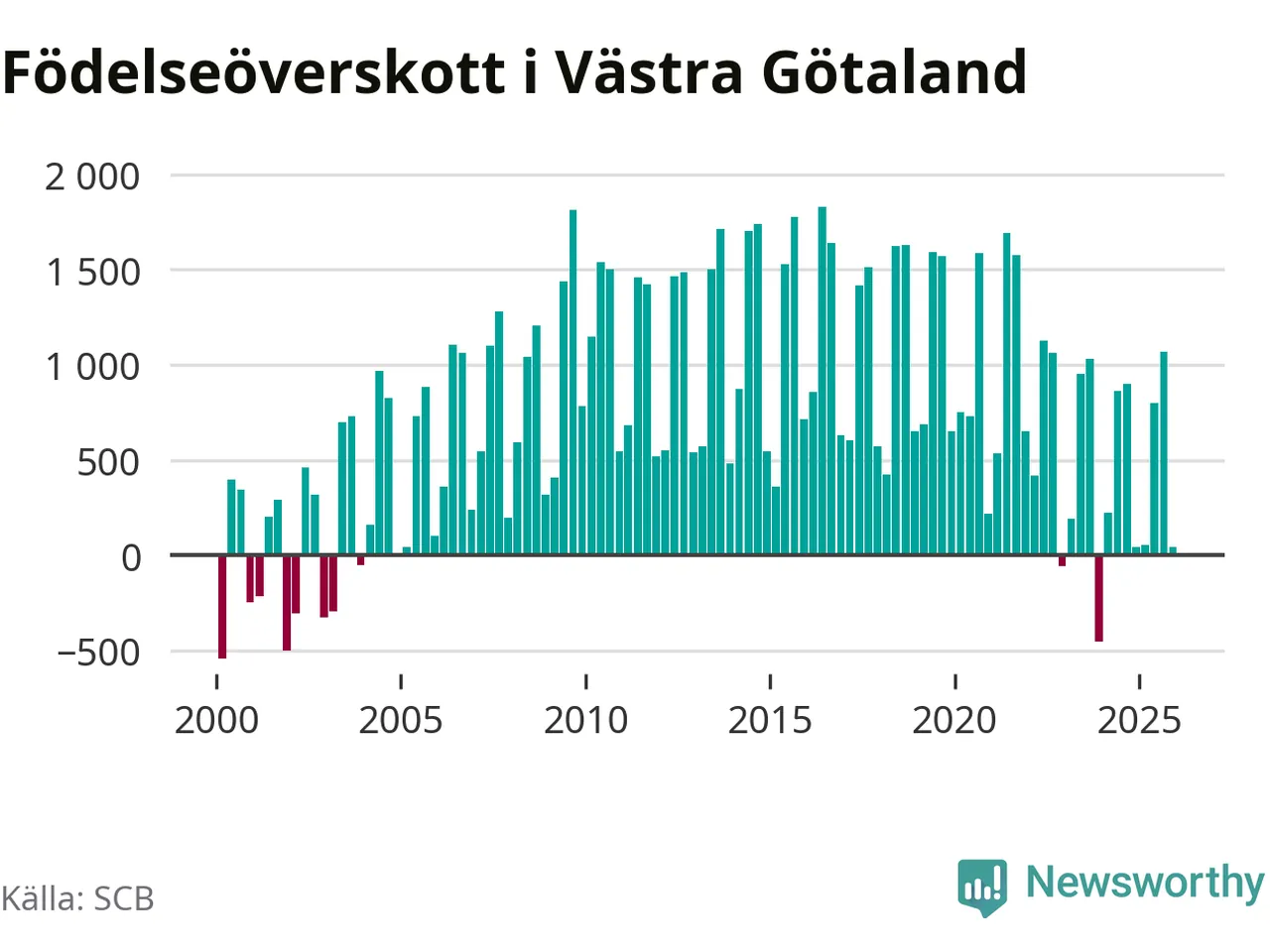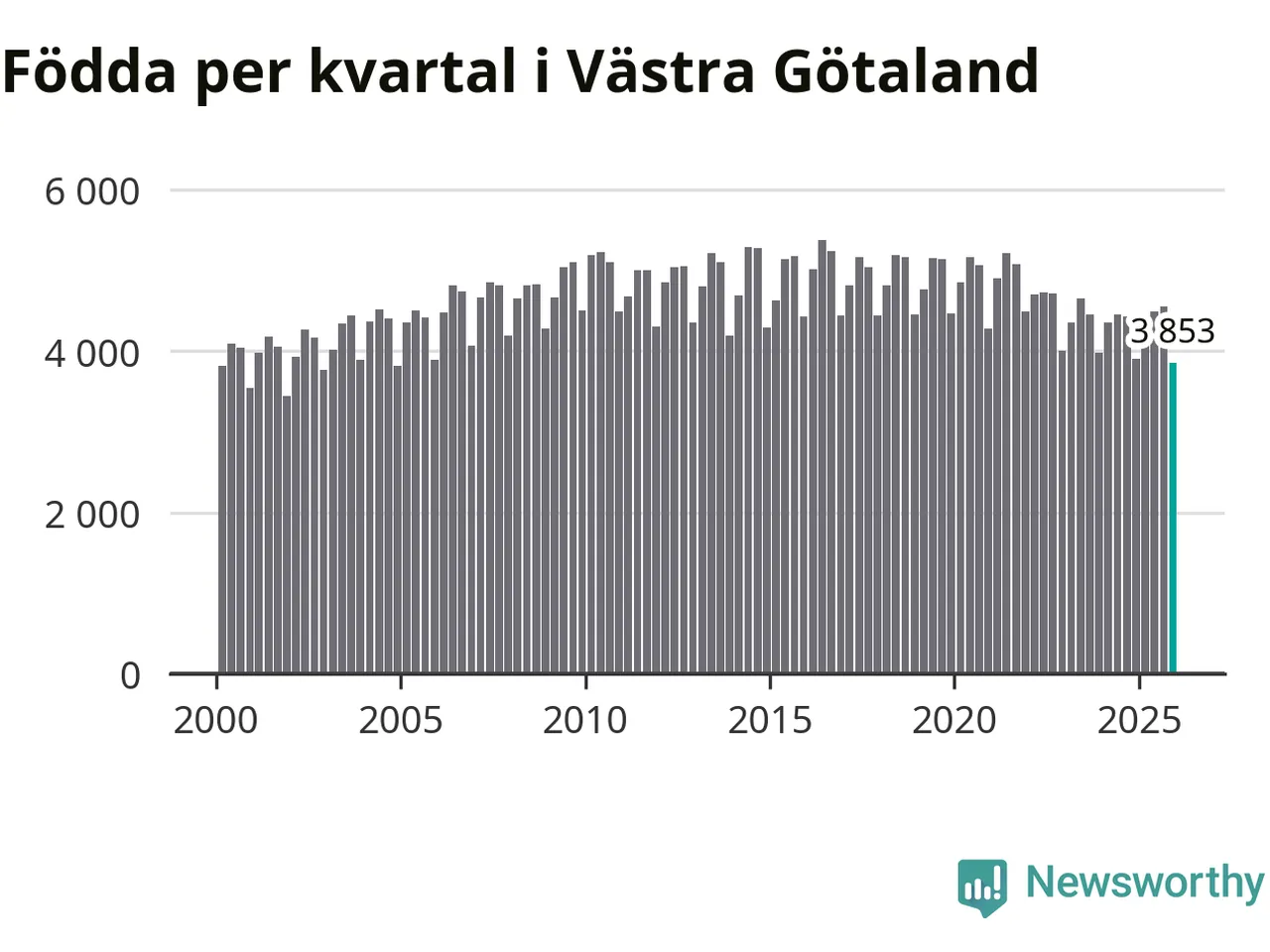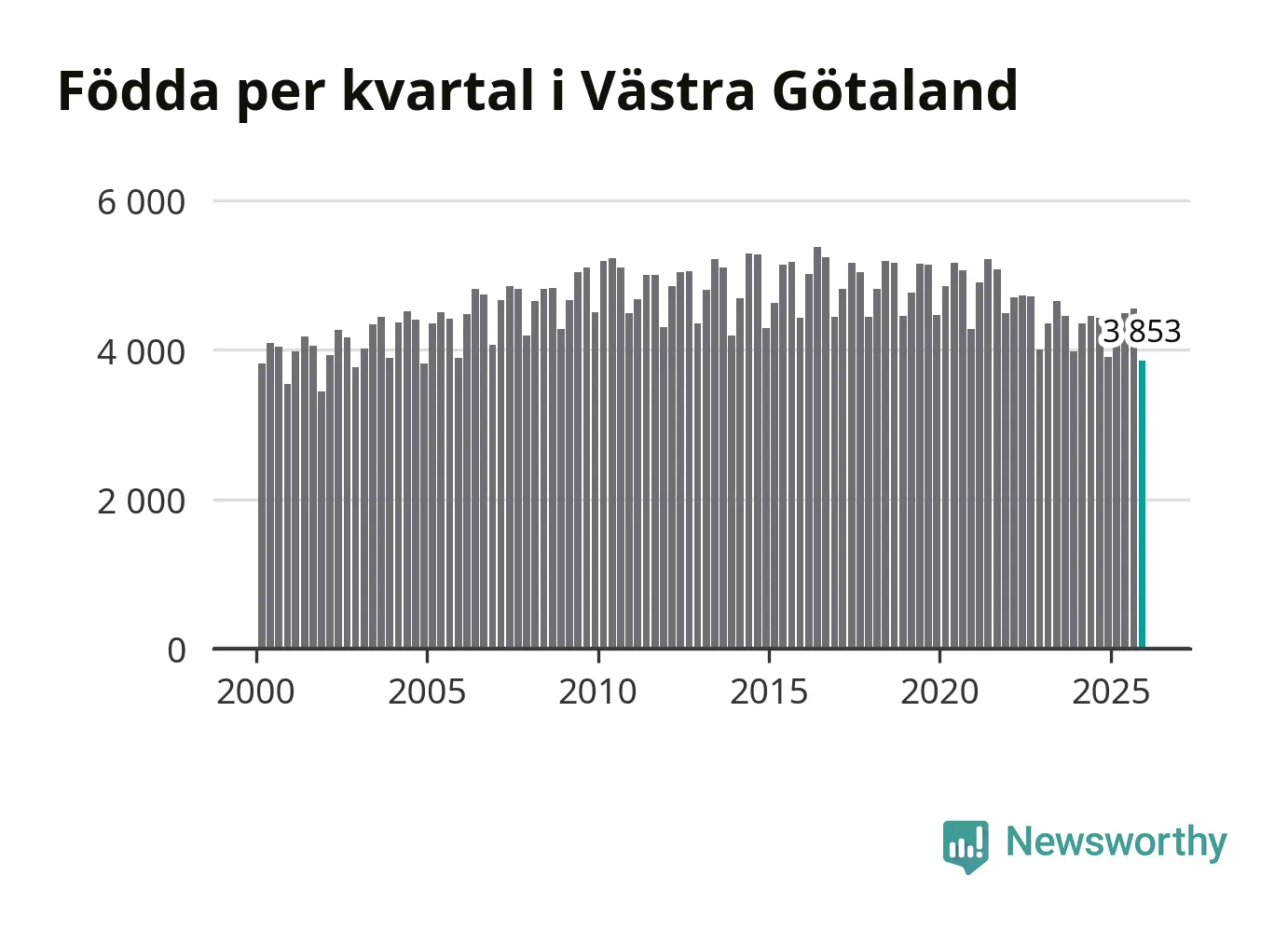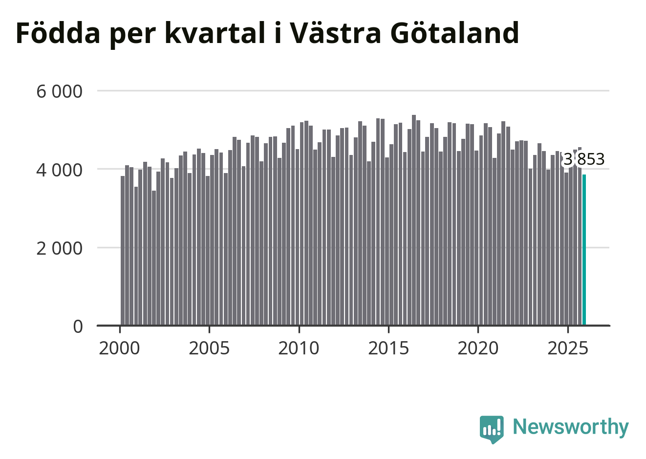 Enligt SCB:s siffror föddes 3 853 barn i Västra Götaland under det senaste kvartalet. Samtidigt avled 3 811 personer. Västra Götaland hade alltså ett positivt födelsenetto, vilket länet historiskt sett nästan alltid har haft.