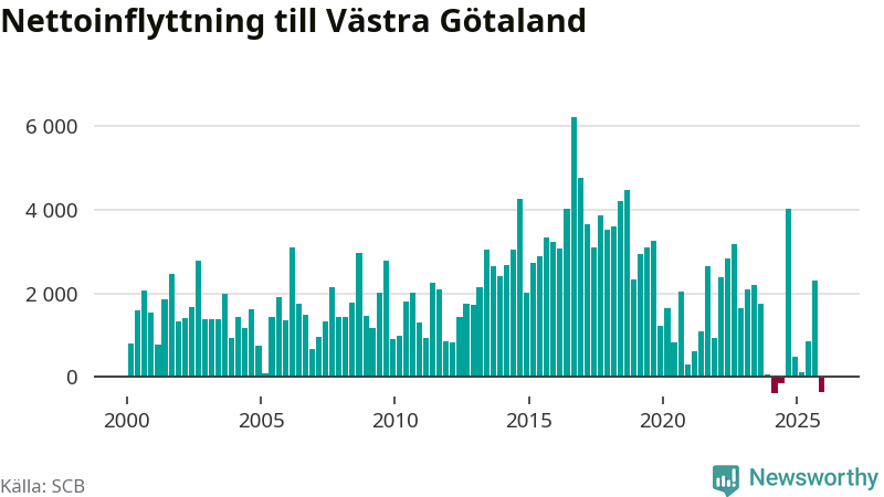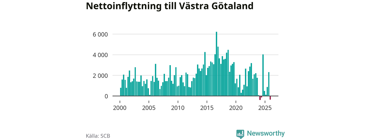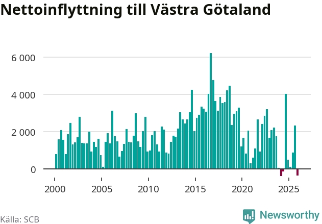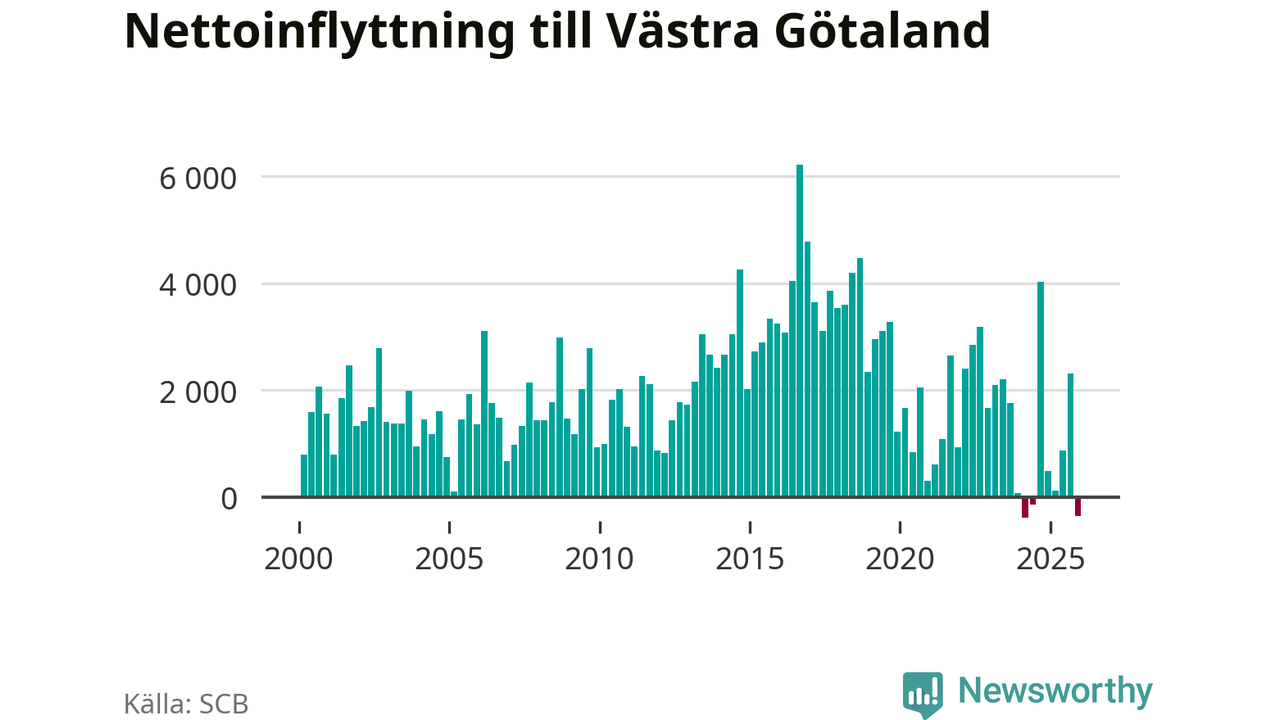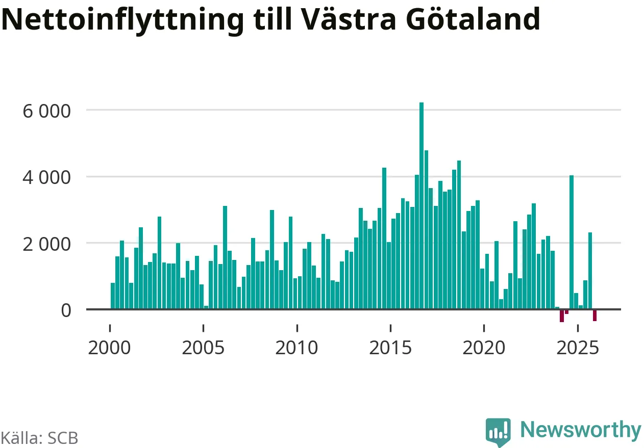 Det är första gången sedan det andra kvartalet 2024 som befolkningen minskar. Det är också den tredje största befolkningsminskningen i Västra Götaland under ett kvartal under det här millenniet.