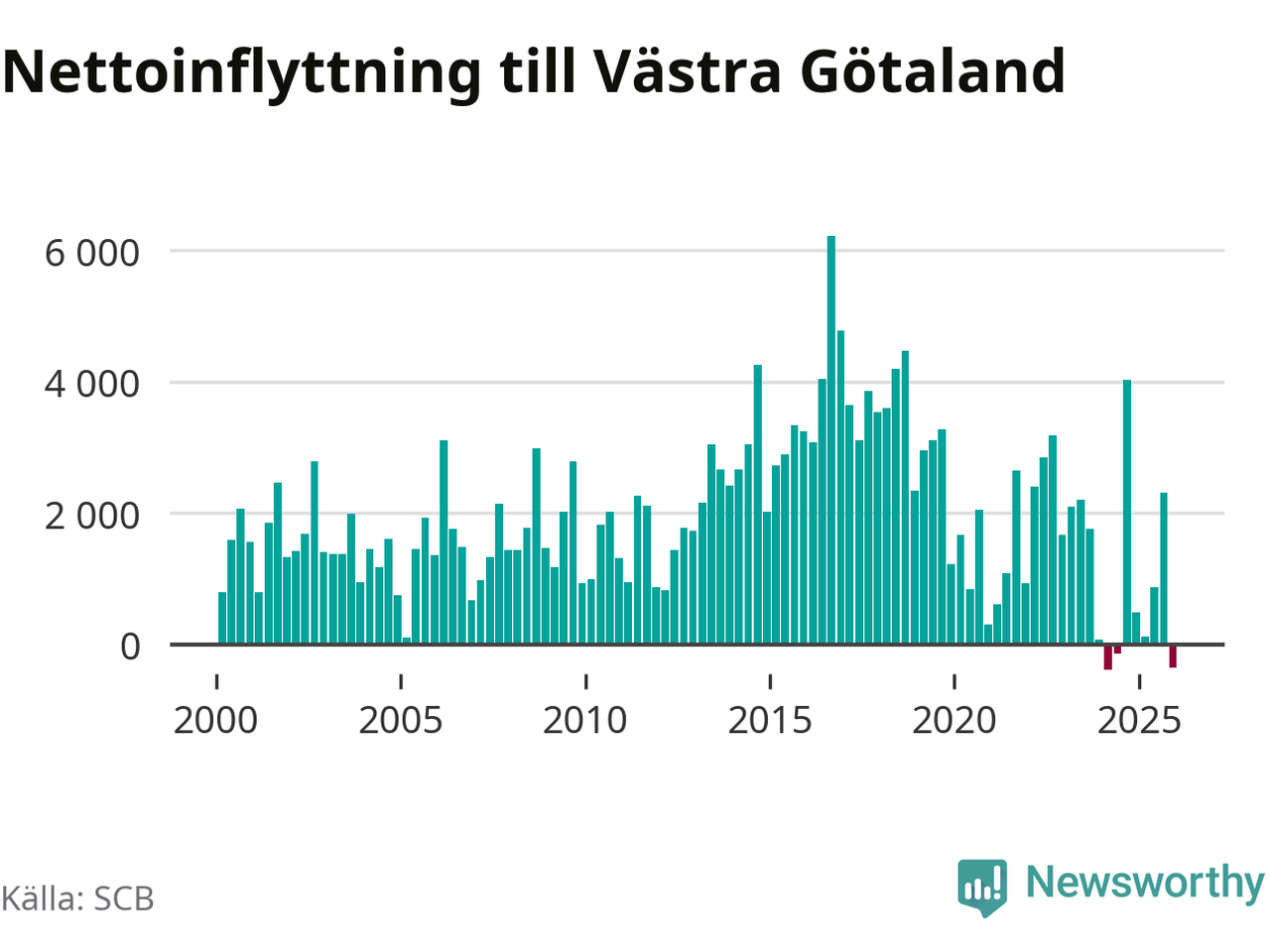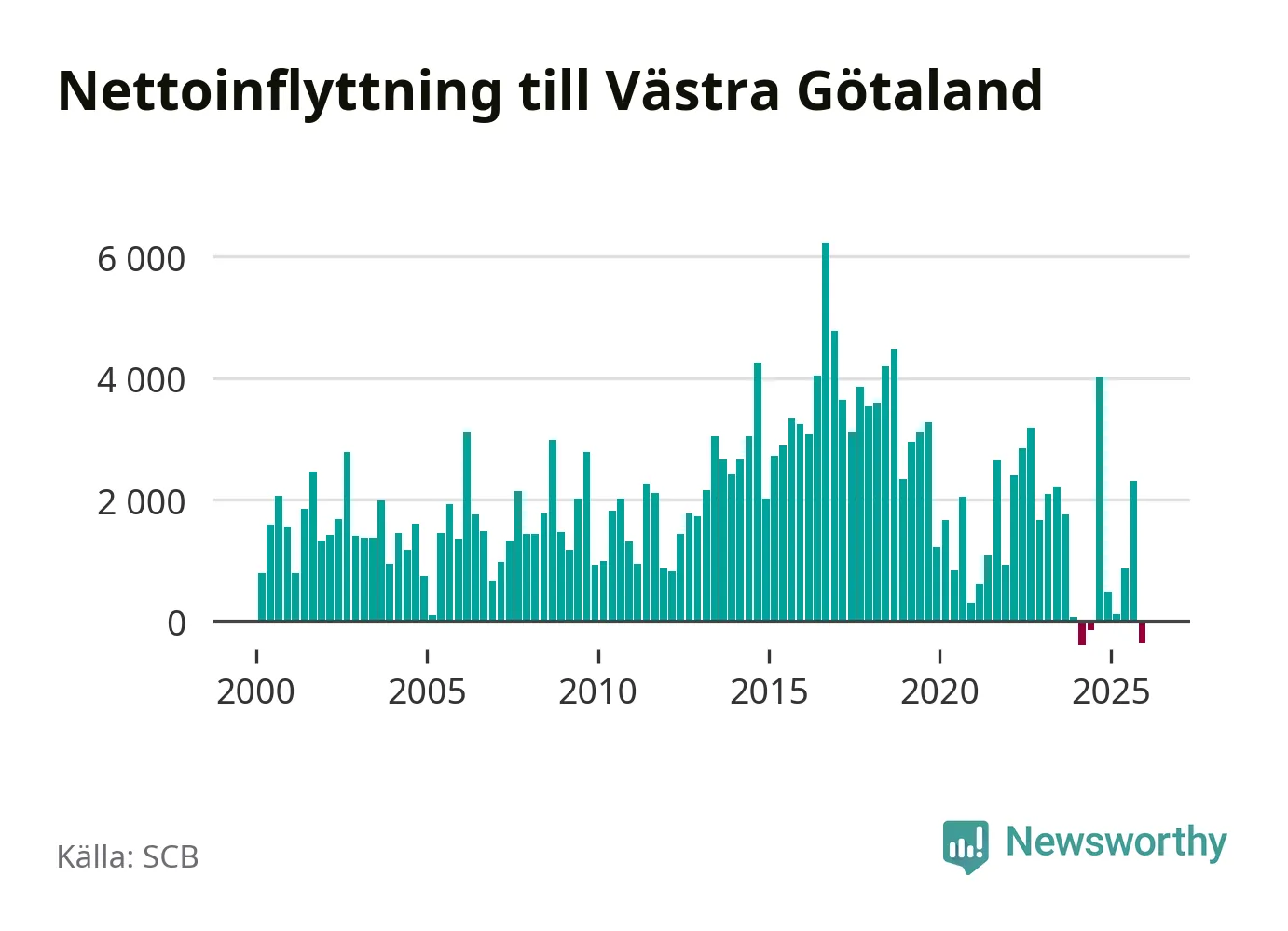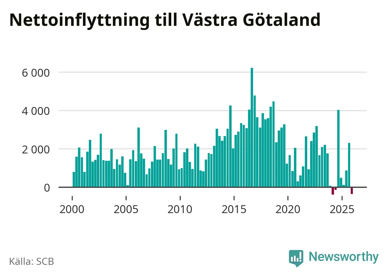 Det är första gången sedan det andra kvartalet 2024 som befolkningen minskar. Det är också den tredje största befolkningsminskningen i Västra Götaland under ett kvartal under det här millenniet.