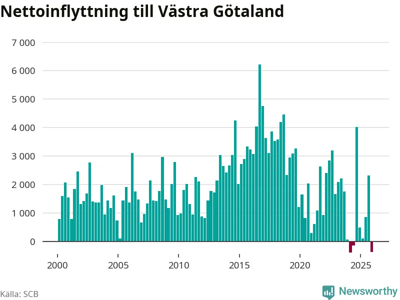 Under fjärde kvartalet 2025 flyttade 8 573 personer till länet medan 8 937 personer flyttade därifrån. Sedan seklets början har Västra Götaland haft ett positivt flyttnetto under nästan alla kvartal.