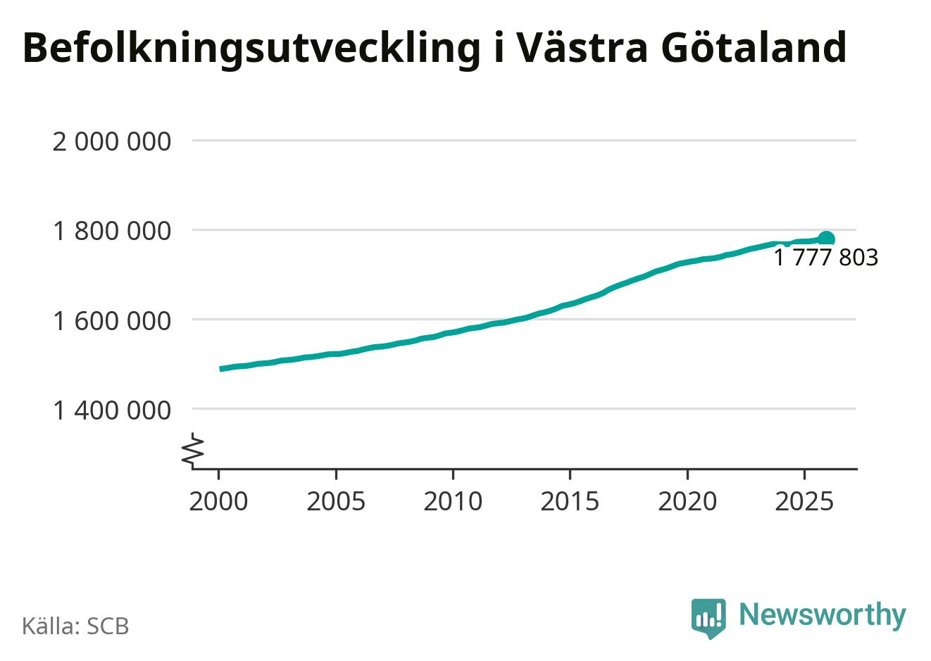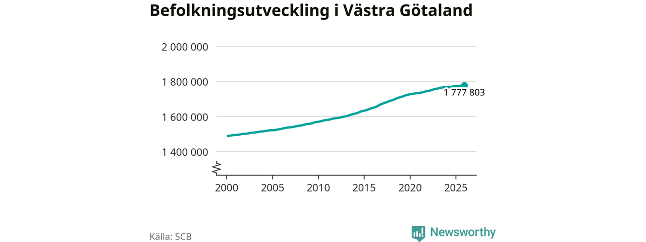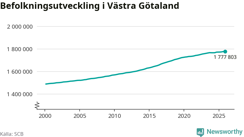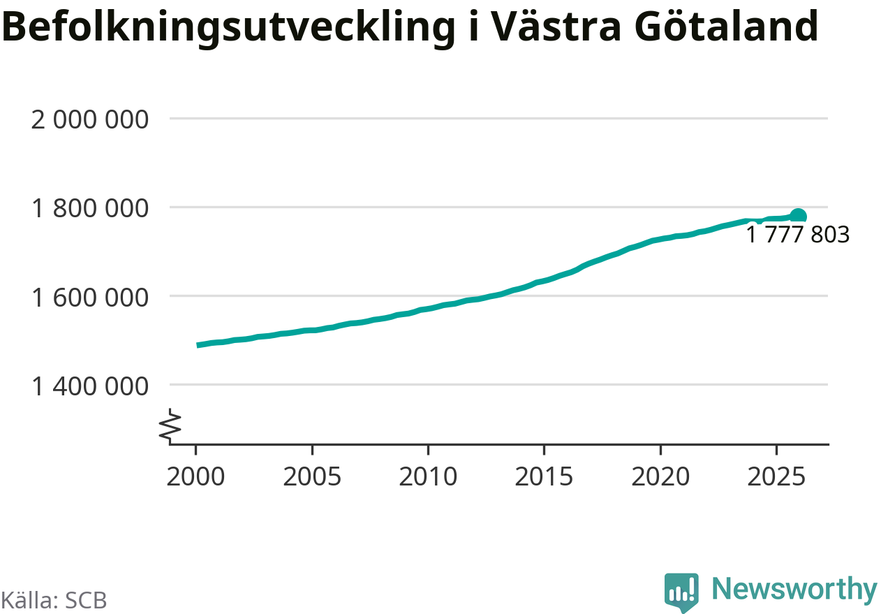 Jämfört med för ett år sedan har befolkningen i Västra Götaland ökat med ungefär 4 980 personer. Sedan millennieskiftet har folkmängden ökat med runt 288 820 personer, eller 19 procent.