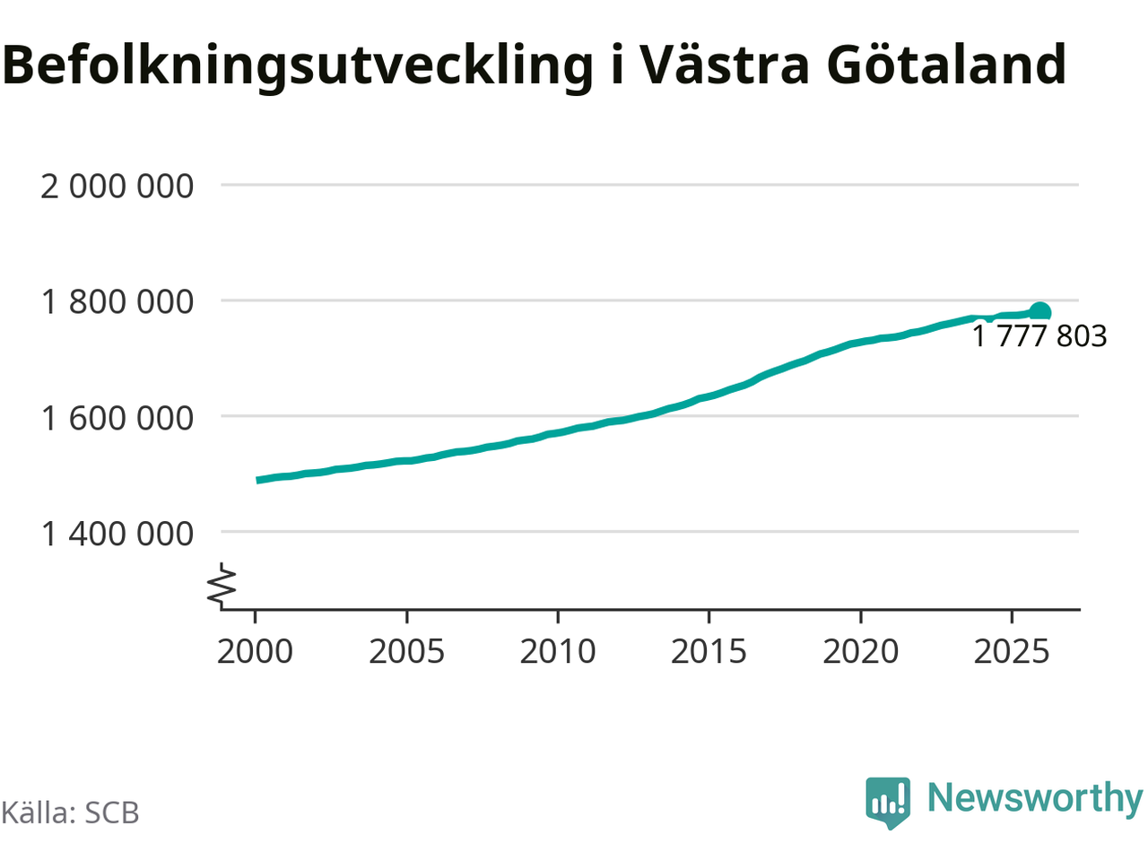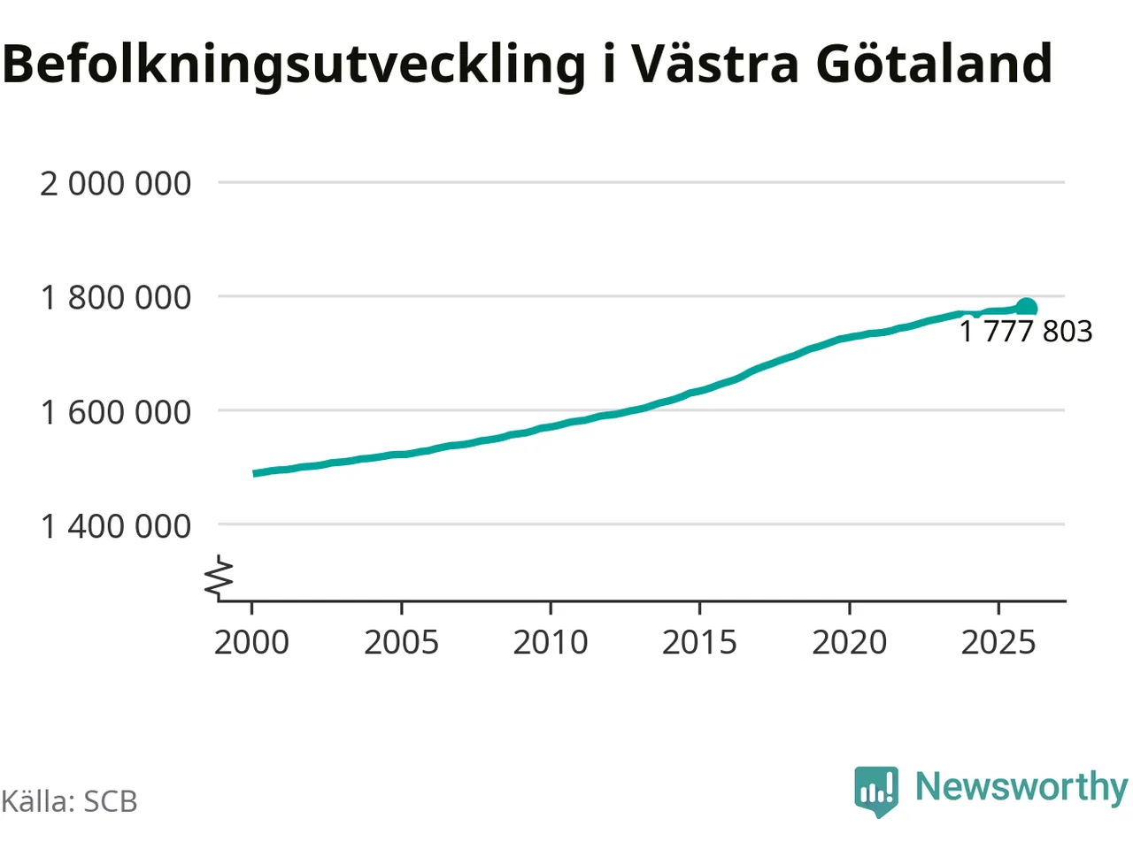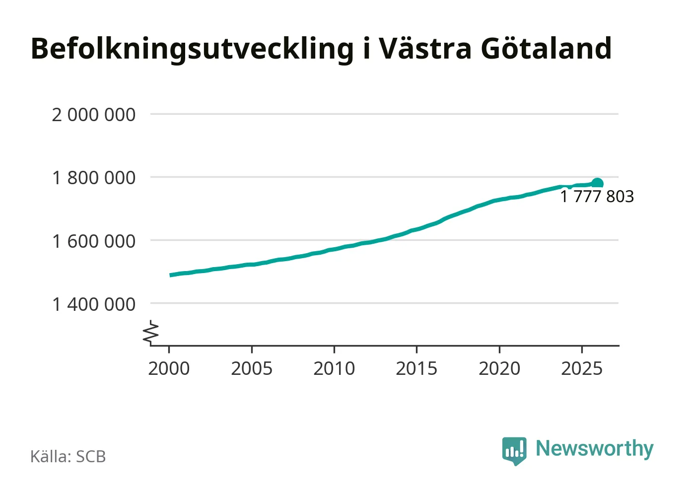 Jämfört med för ett år sedan har befolkningen i Västra Götaland ökat med ungefär 4 980 personer. Sedan millennieskiftet har folkmängden ökat med runt 288 820 personer, eller 19 procent.