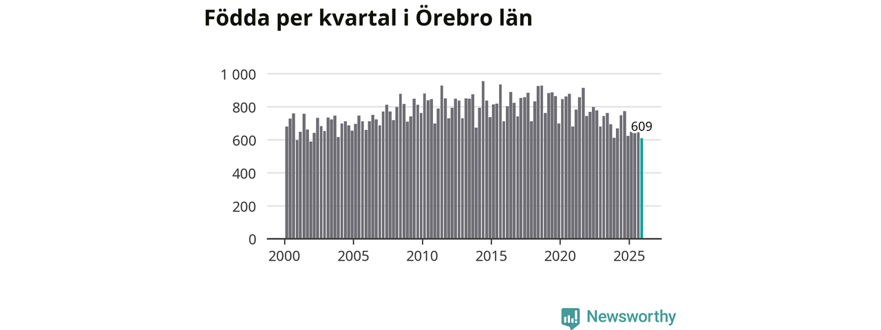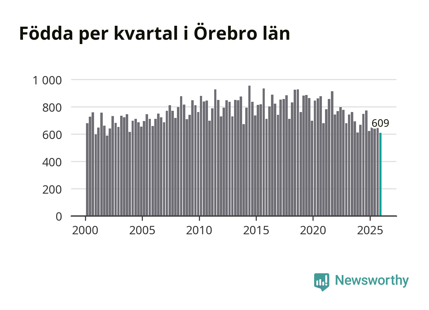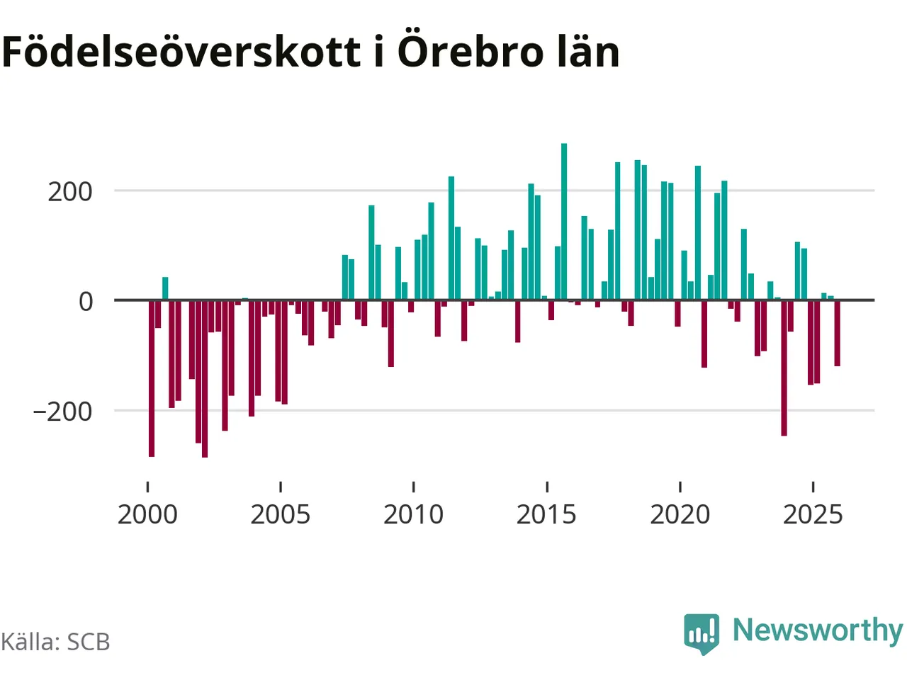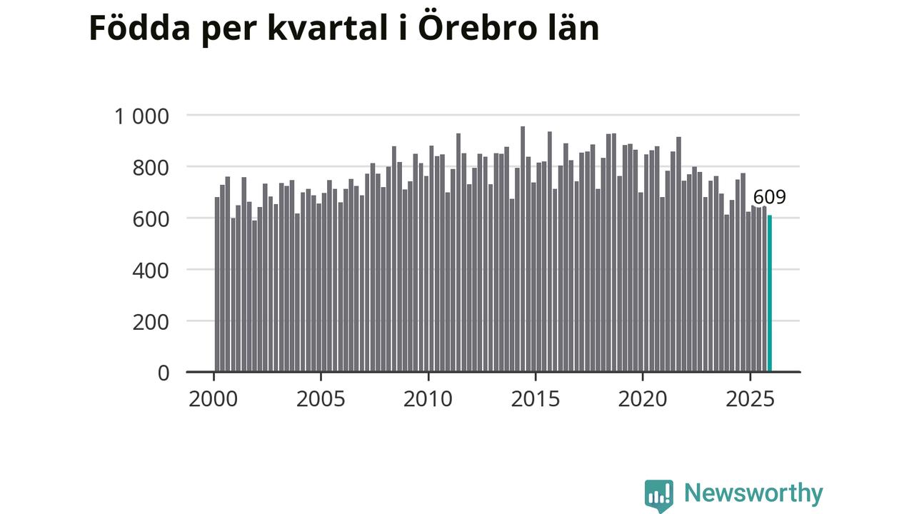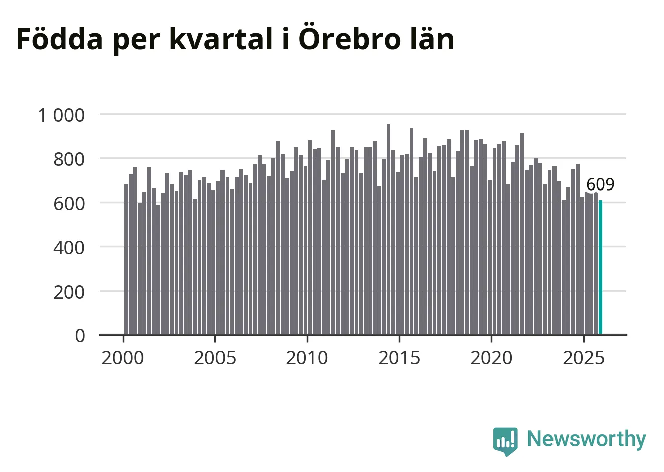 Enligt SCB:s siffror föddes 609 barn i Örebro län under det senaste kvartalet. Samtidigt avled 730 personer. Örebro hade alltså ett negativt födelsenetto under fjärde kvartalet. Historiskt har dock födelsenettot oftast varit positivt.