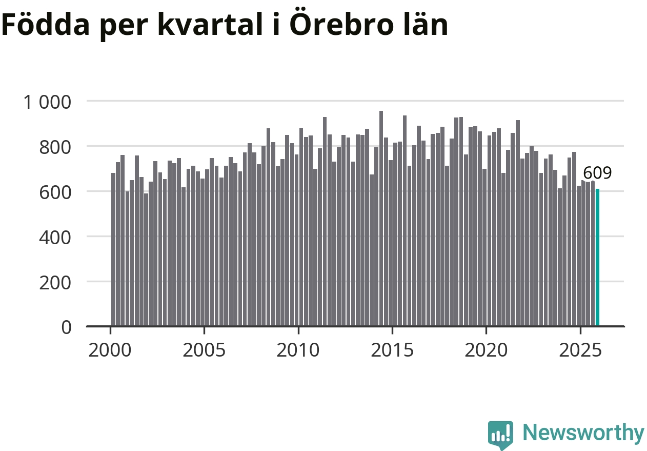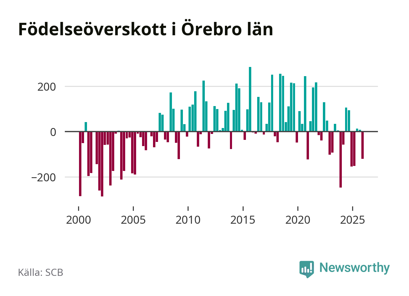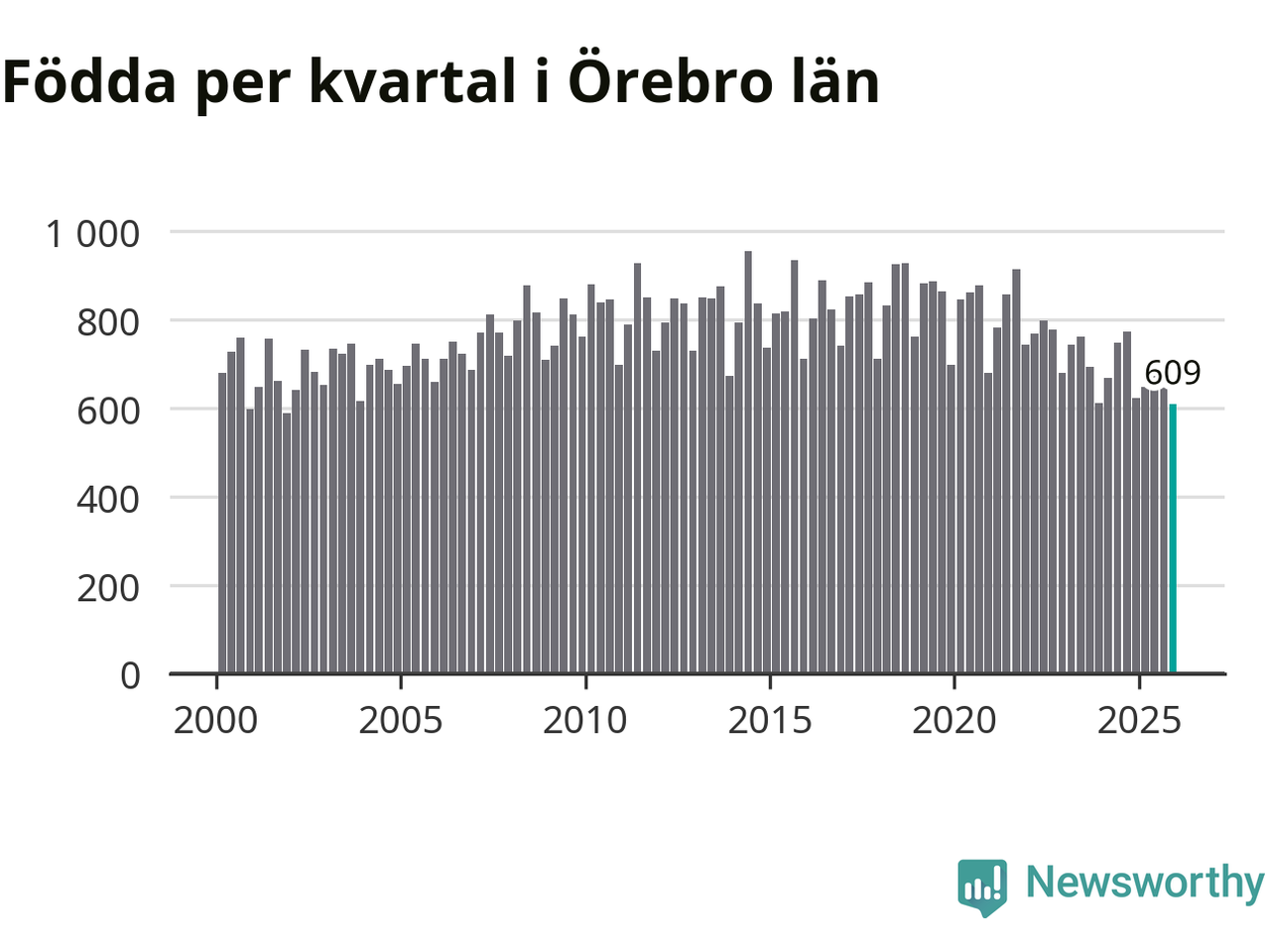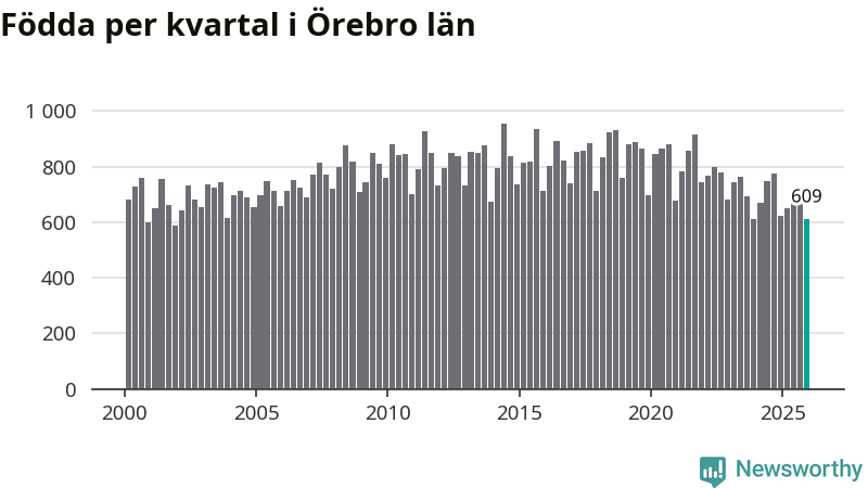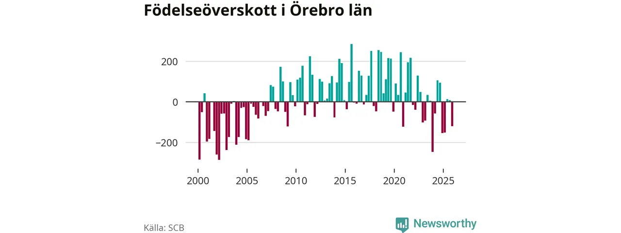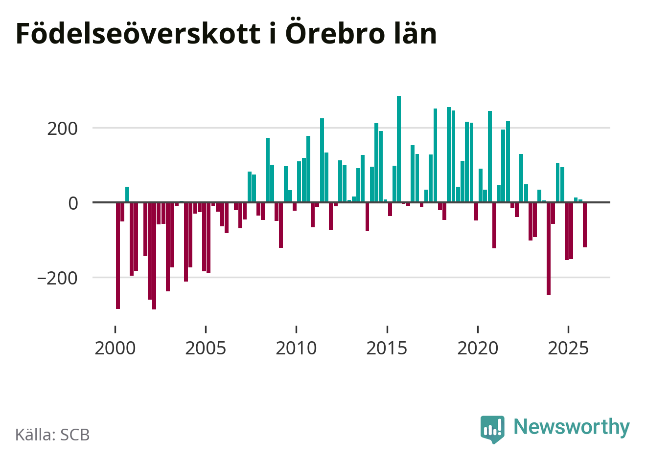 Enligt SCB:s siffror föddes 609 barn i Örebro län under det senaste kvartalet. Samtidigt avled 730 personer. Örebro hade alltså ett negativt födelsenetto under fjärde kvartalet. Historiskt har dock födelsenettot oftast varit positivt.