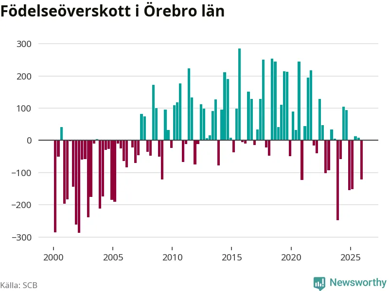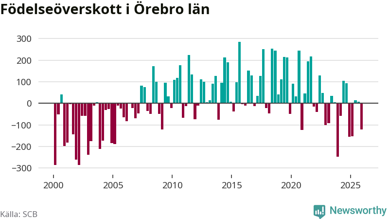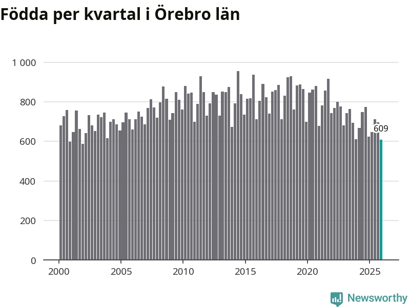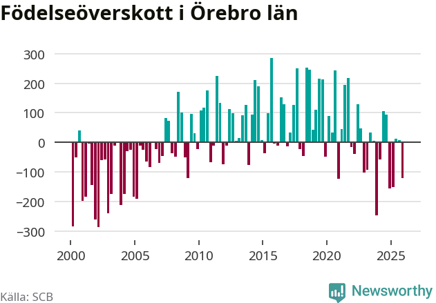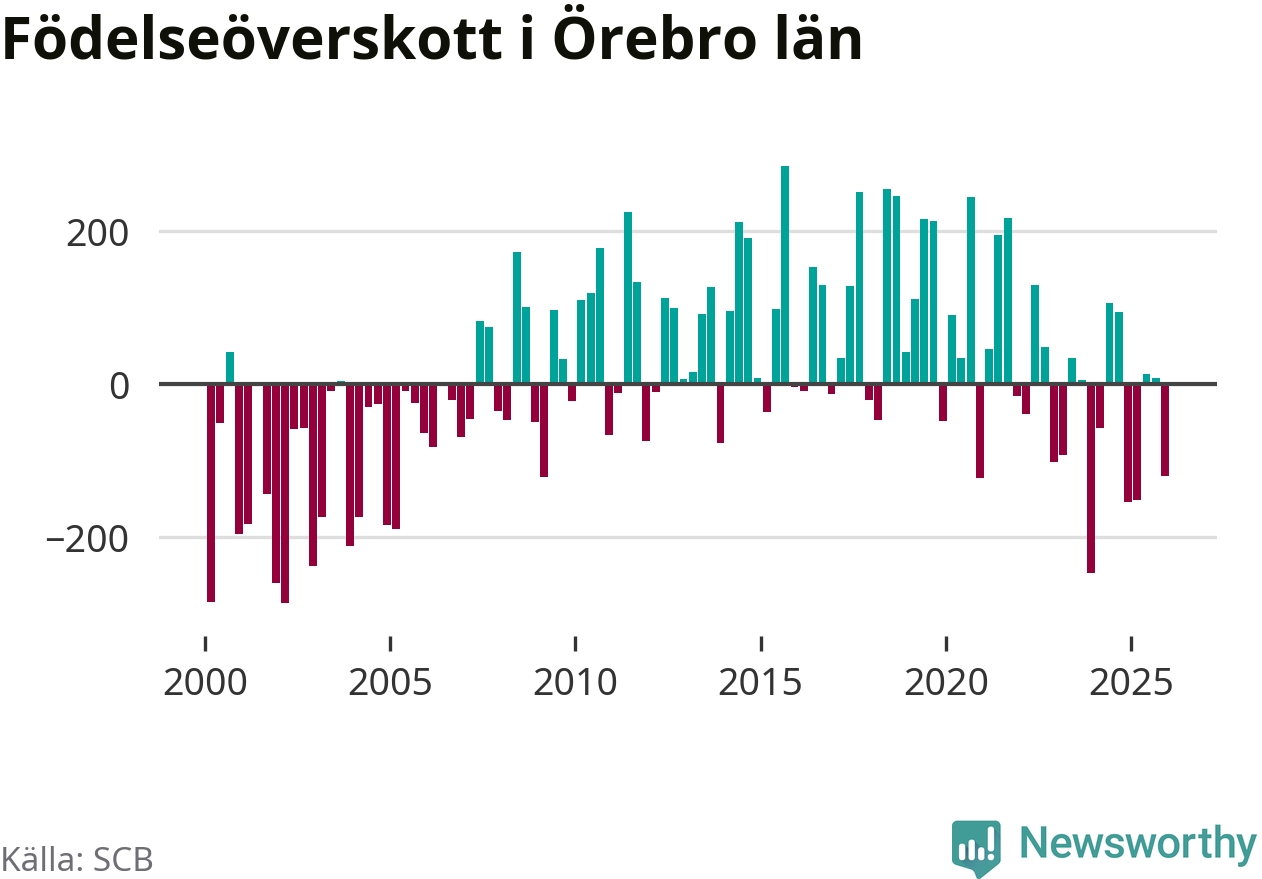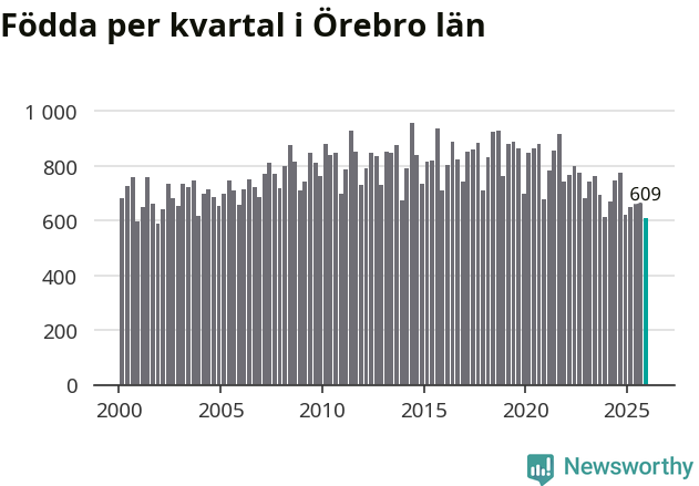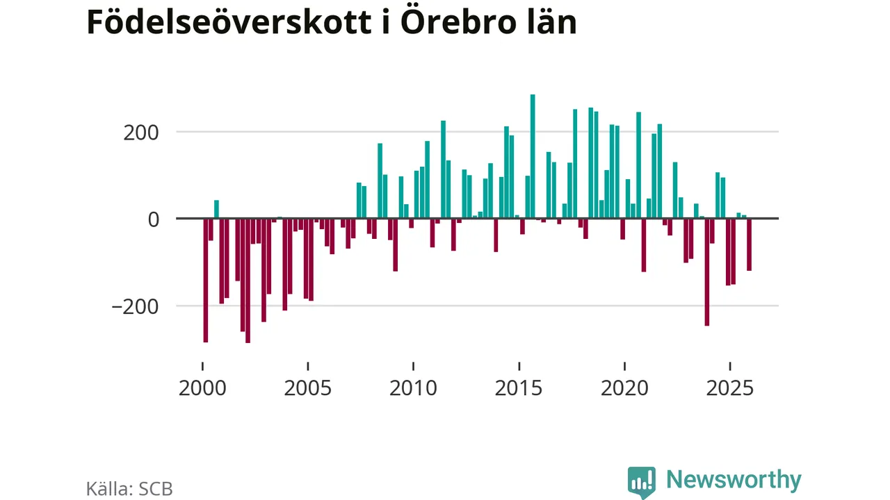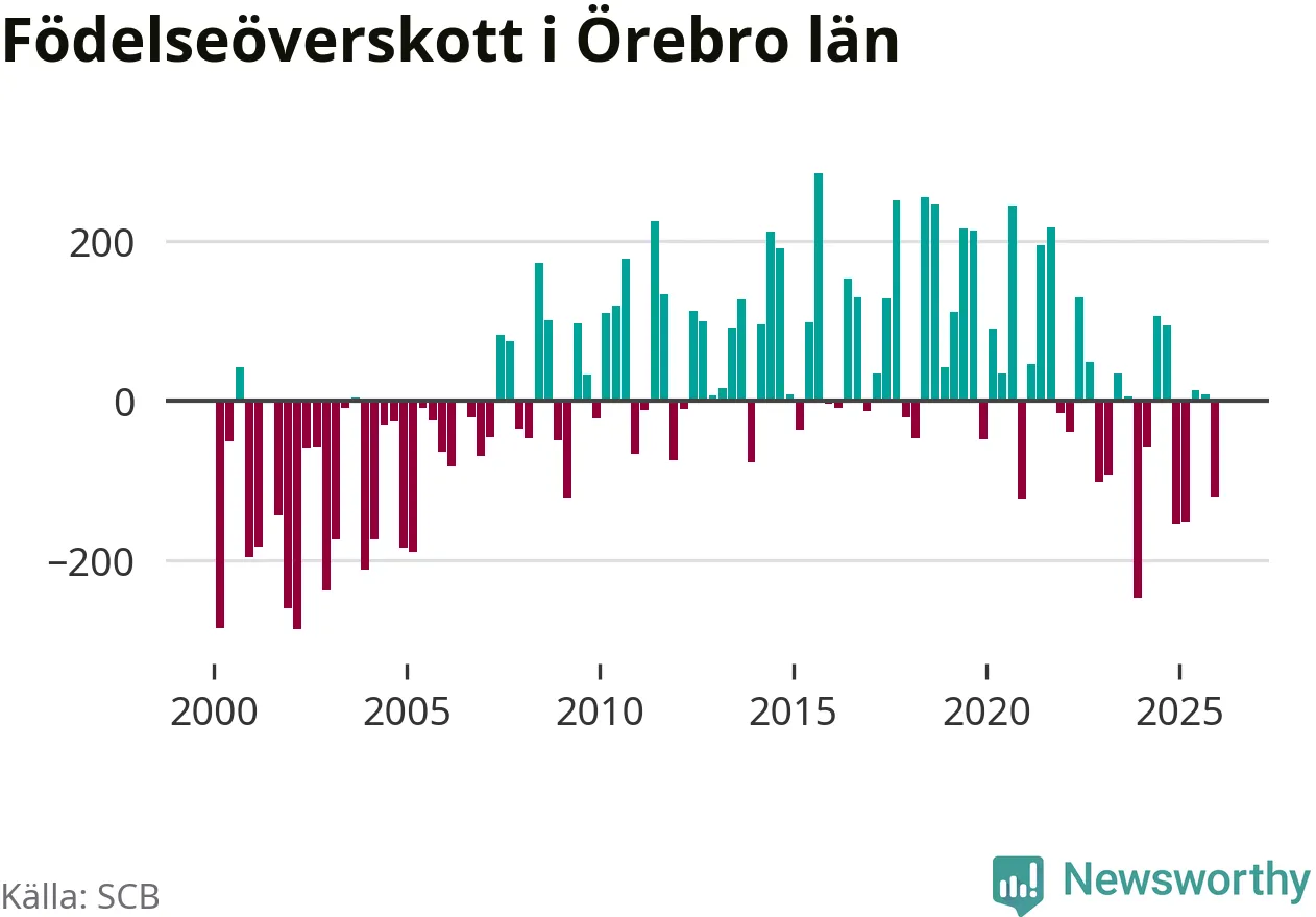 Enligt SCB:s siffror föddes 609 barn i Örebro län under det senaste kvartalet. Samtidigt avled 730 personer. Örebro hade alltså ett negativt födelsenetto under fjärde kvartalet. Historiskt har dock födelsenettot oftast varit positivt.