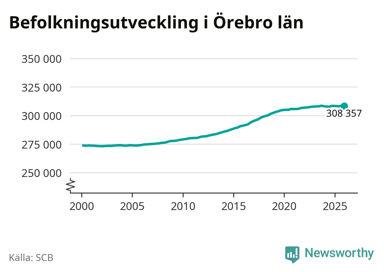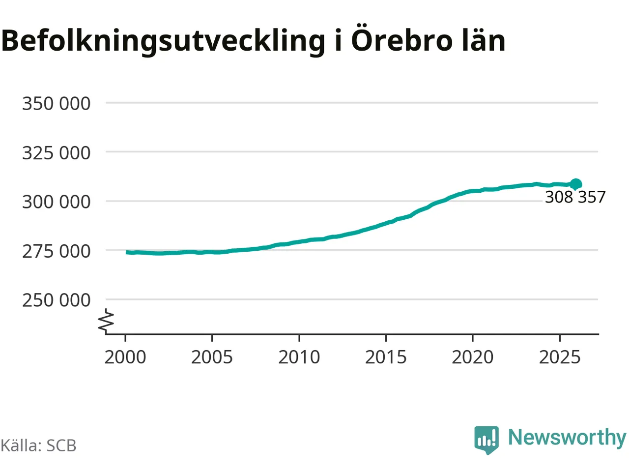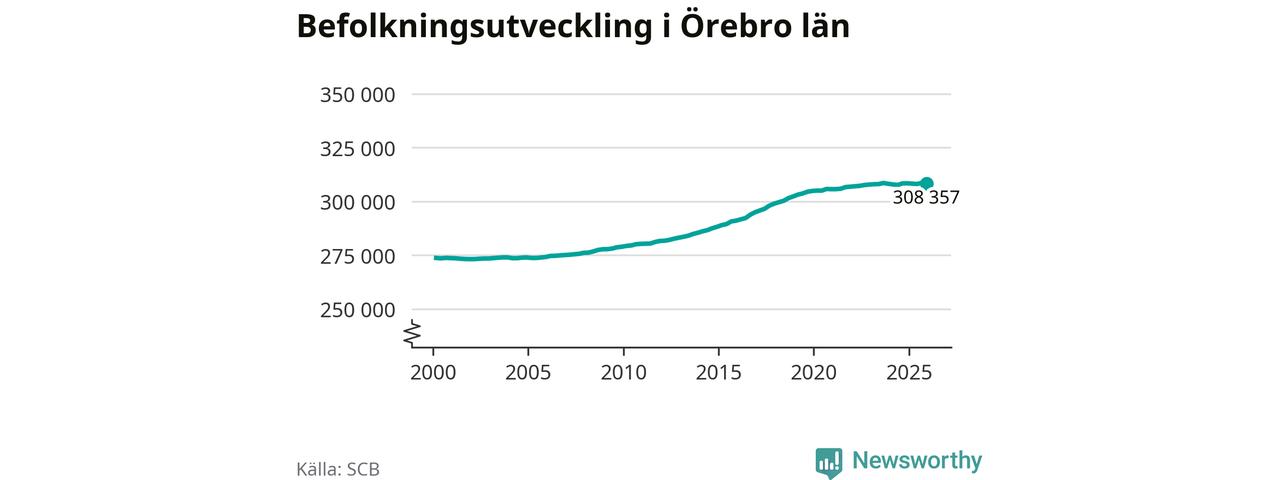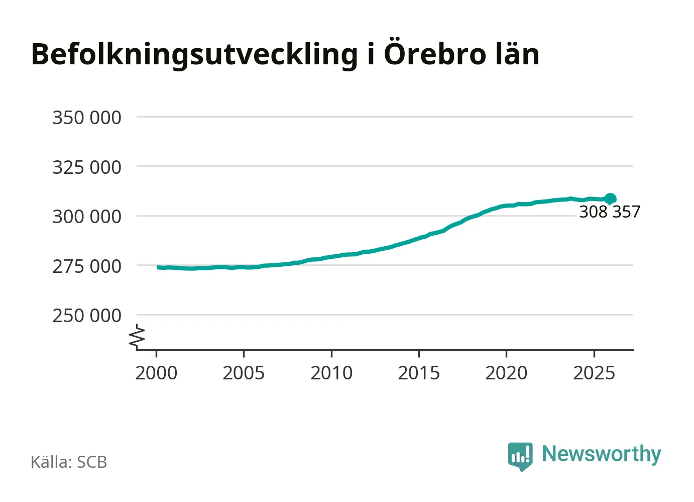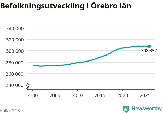 Jämfört med för ett år sedan har befolkningen i Örebro län minskat med knappt 20 personer. Sedan millennieskiftet har folkmängden ökat med runt 34 670 personer, eller 13 procent.