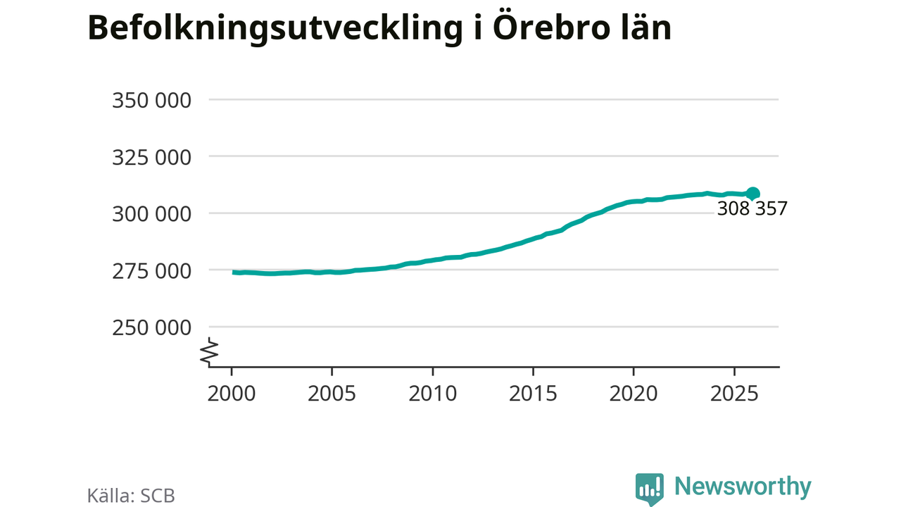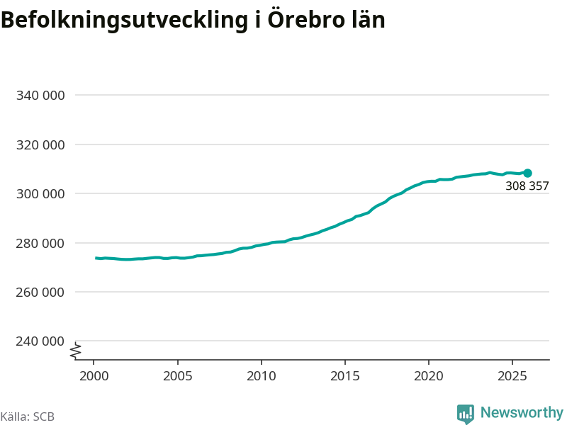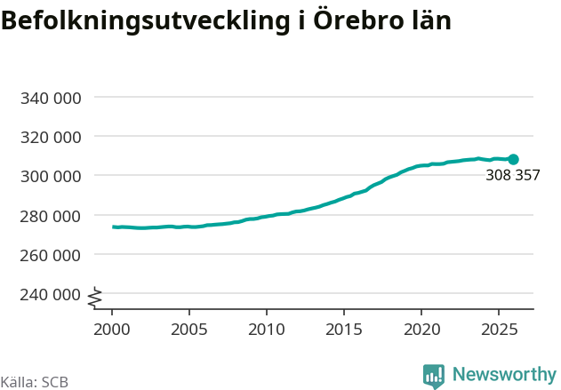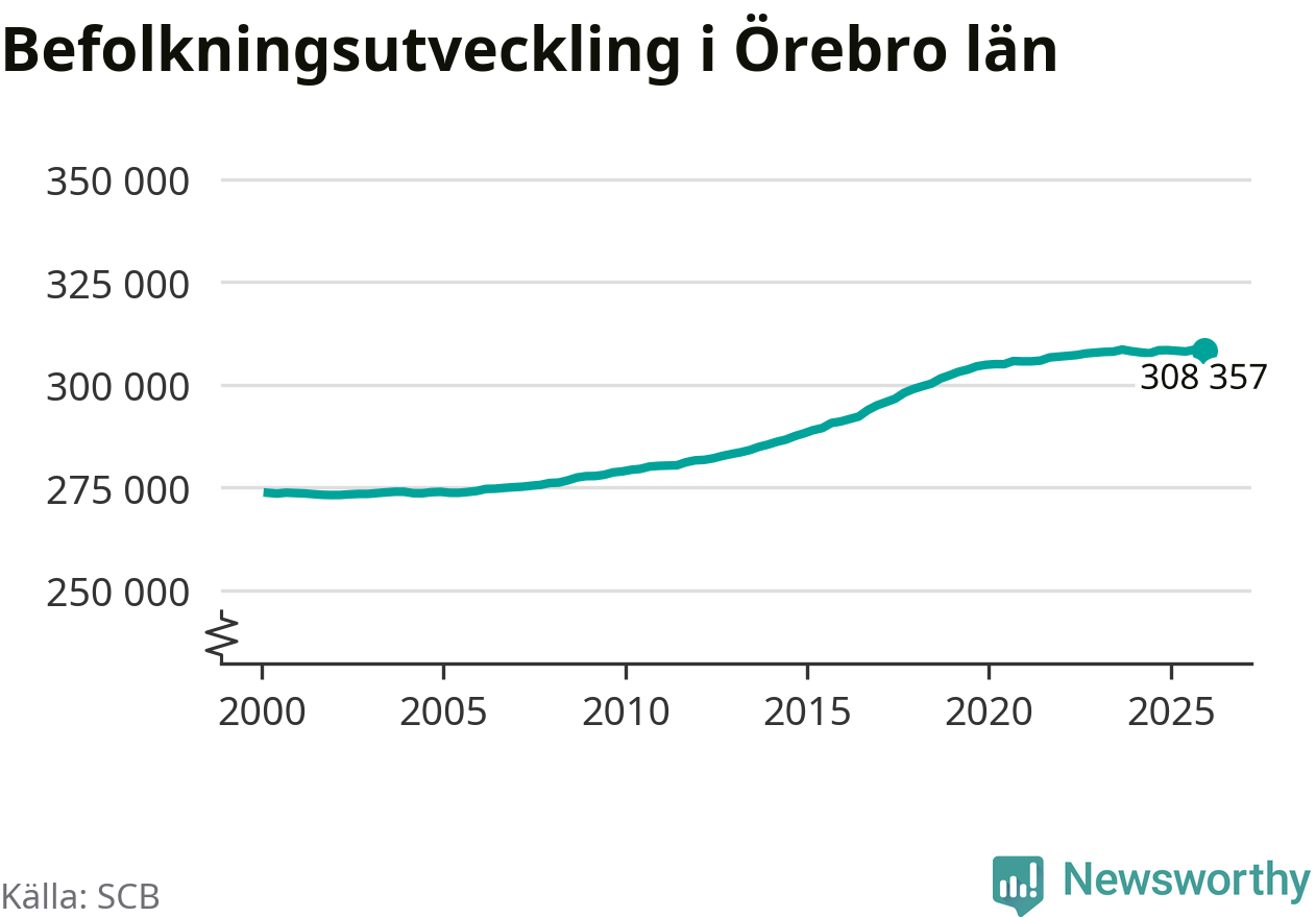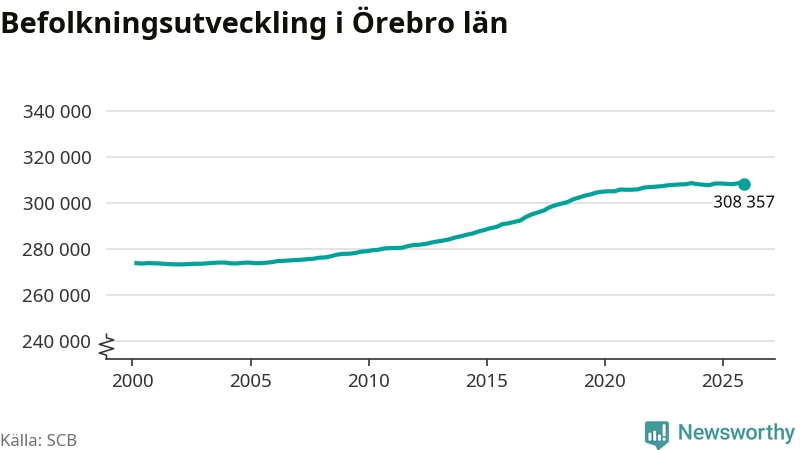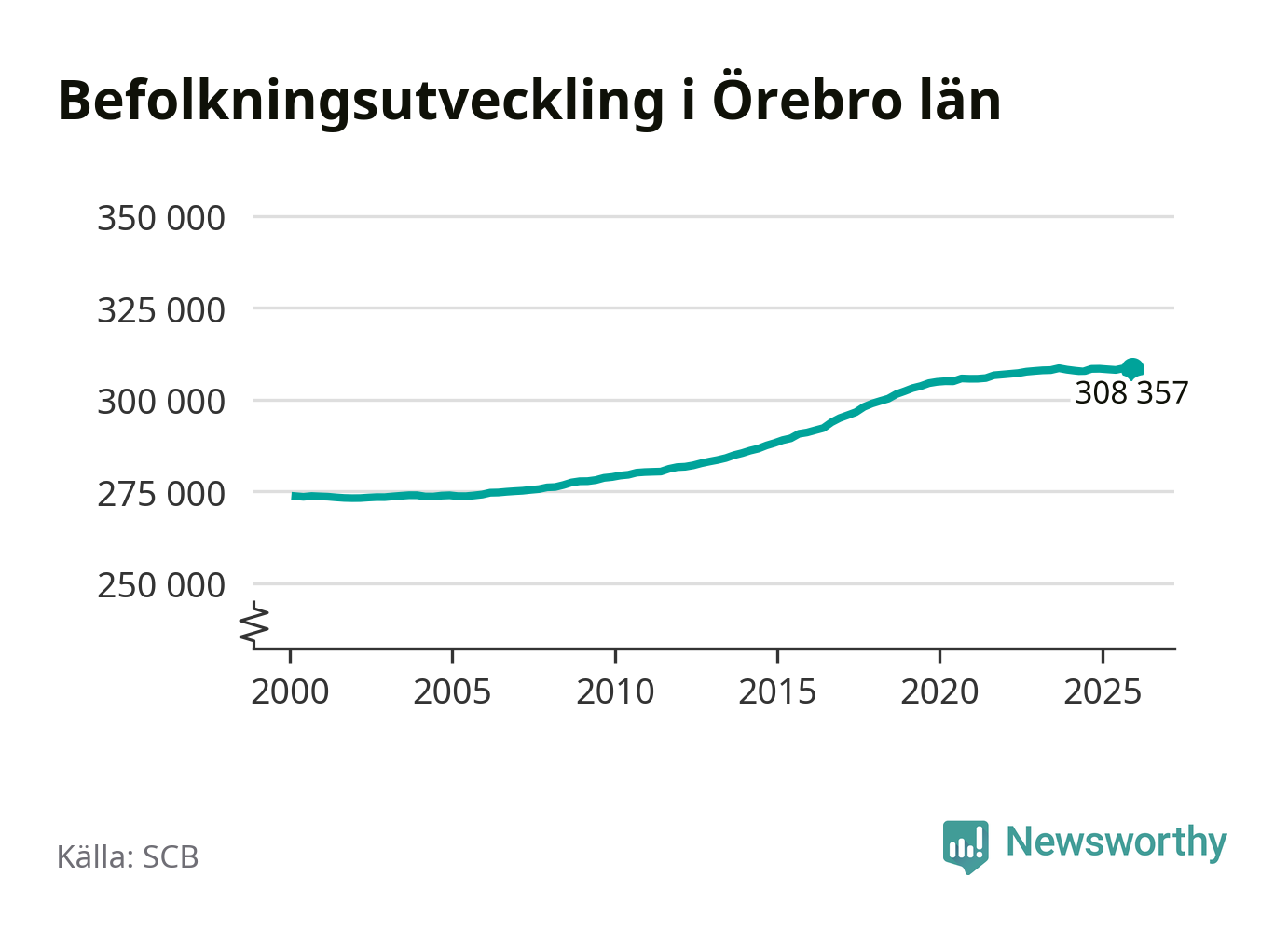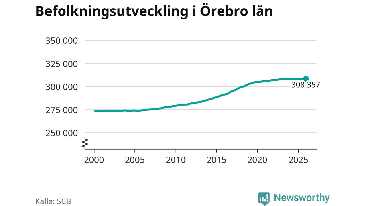 Jämfört med för ett år sedan har befolkningen i Örebro län minskat med knappt 20 personer. Sedan millennieskiftet har folkmängden ökat med runt 34 670 personer, eller 13 procent.