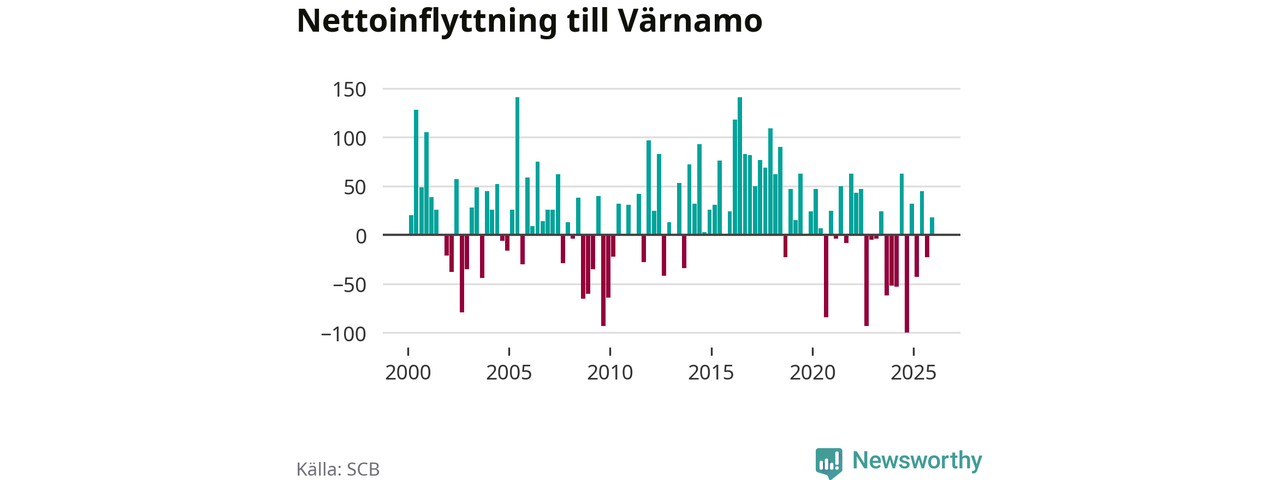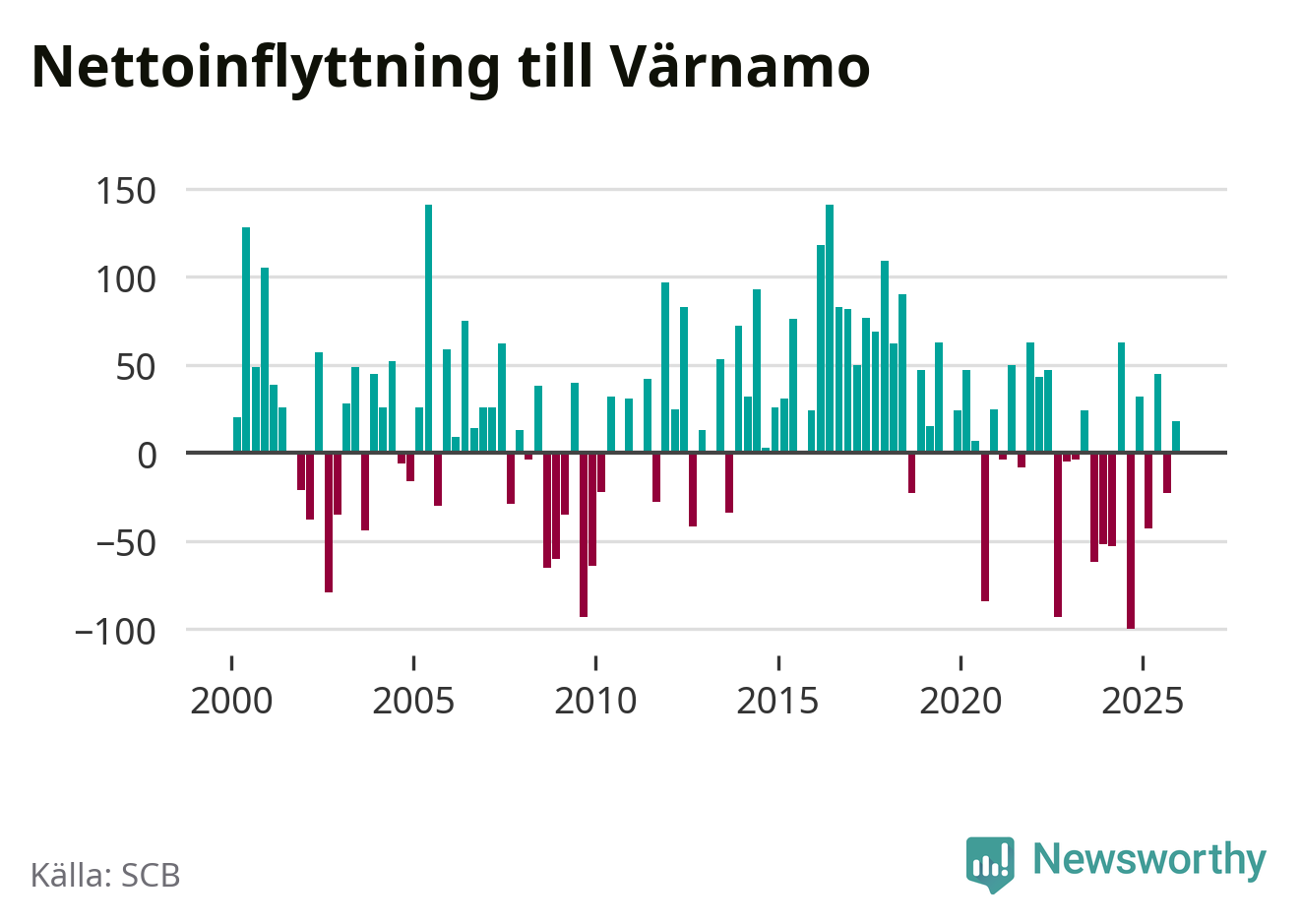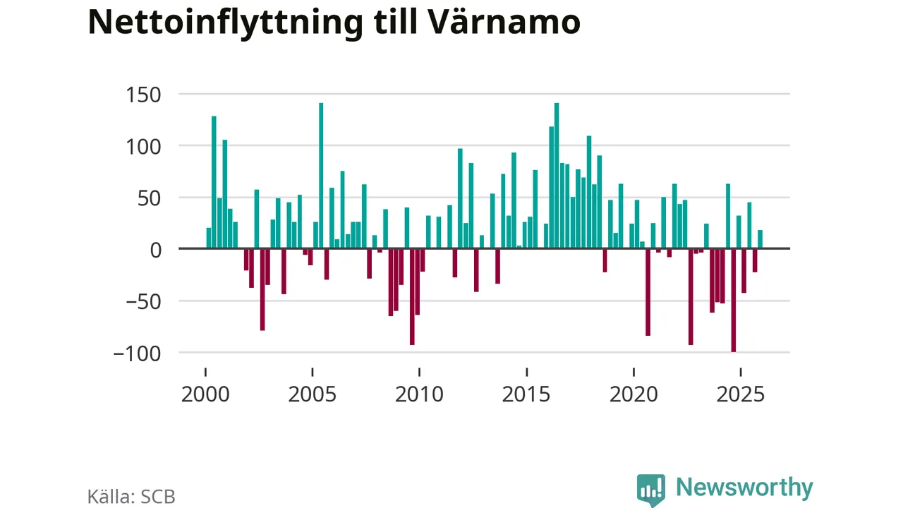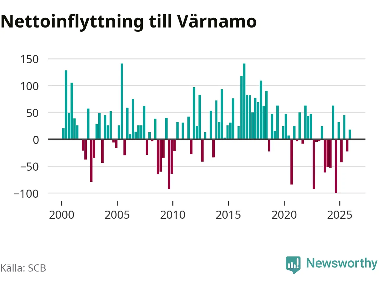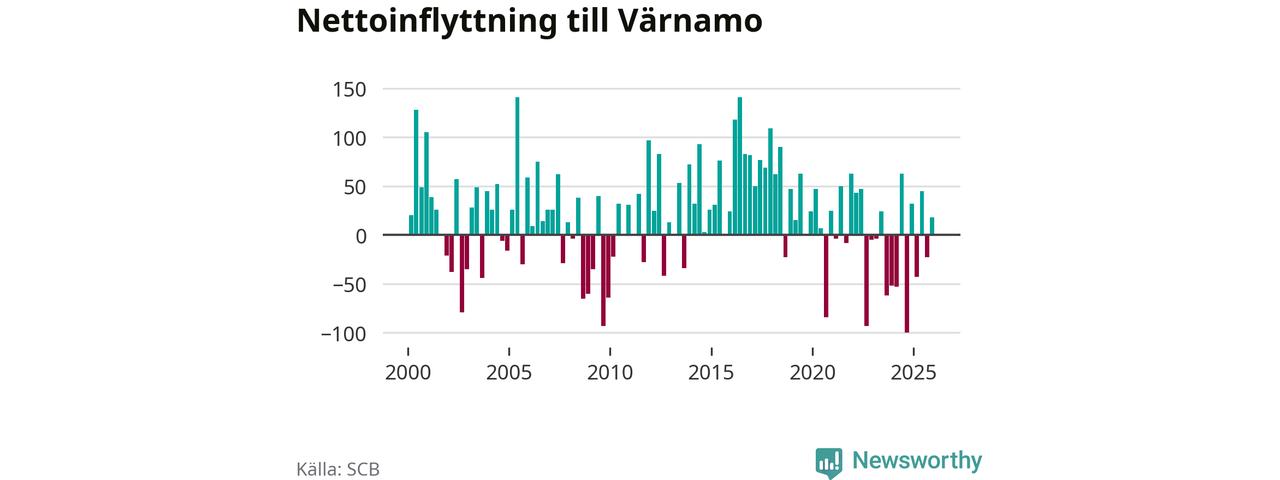 Under fjärde kvartalet 2025 flyttade 316 personer till kommunen medan 298 personer flyttade därifrån. Sedan seklets början har Värnamo oftast haft ett positivt flyttnetto, inklusive det senaste kvartalet.