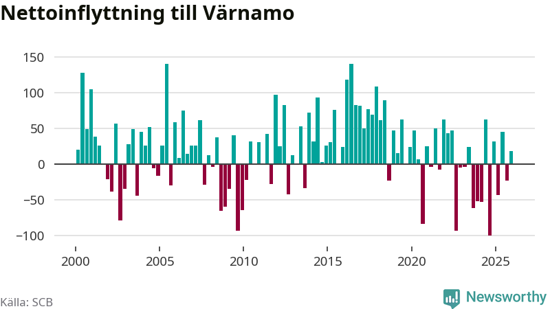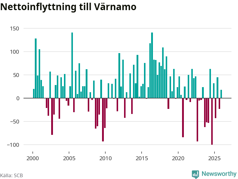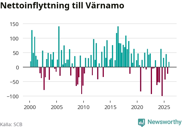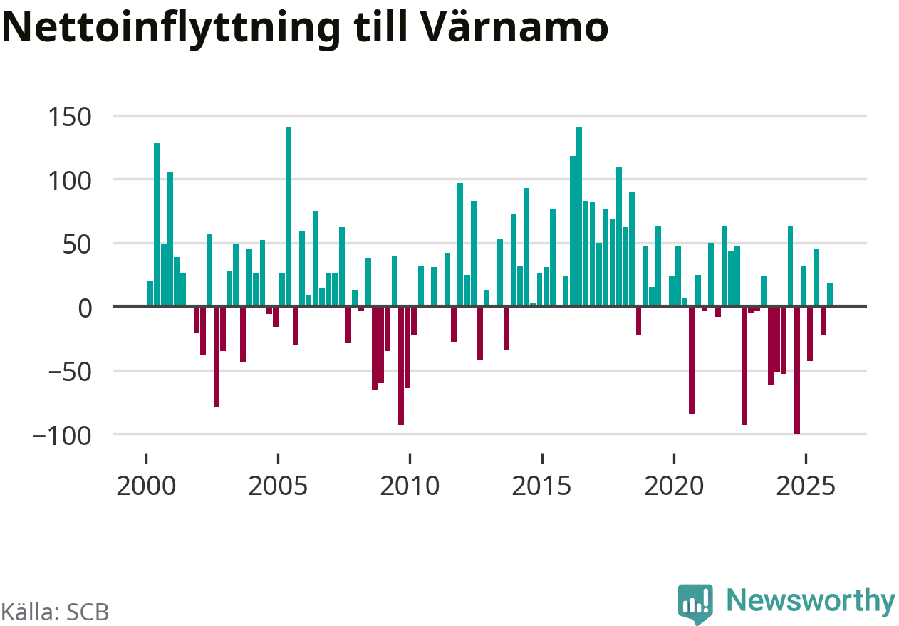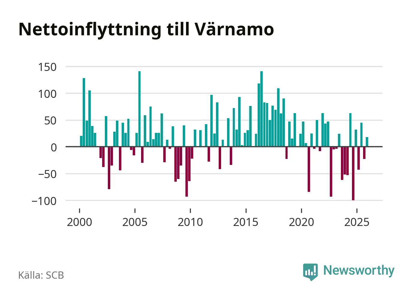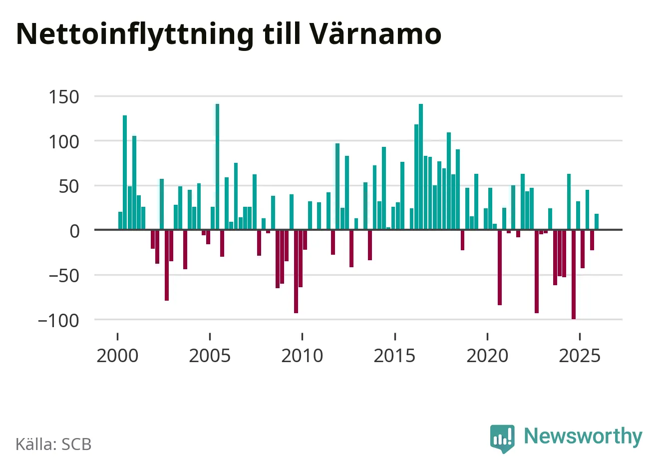 Under fjärde kvartalet 2025 flyttade 316 personer till kommunen medan 298 personer flyttade därifrån. Sedan seklets början har Värnamo oftast haft ett positivt flyttnetto, inklusive det senaste kvartalet.