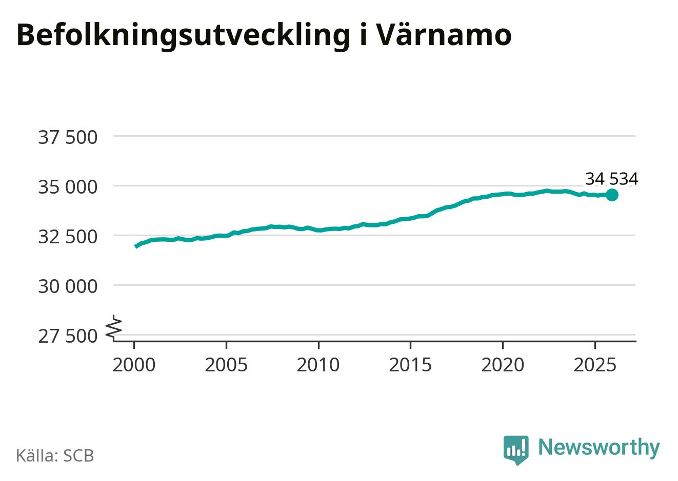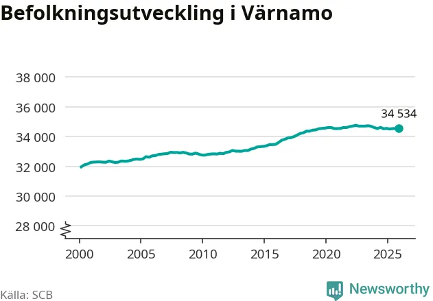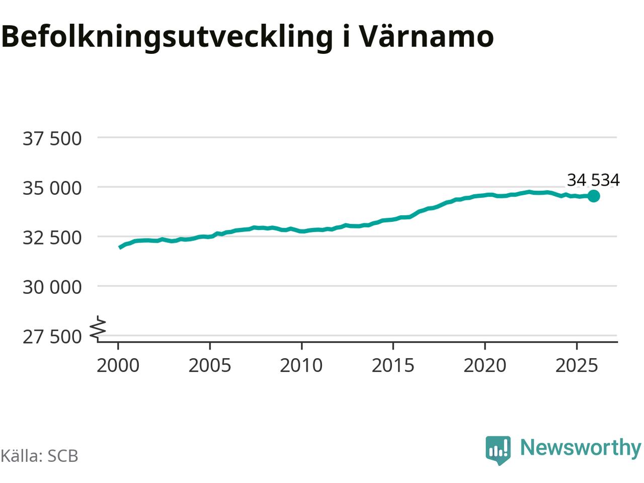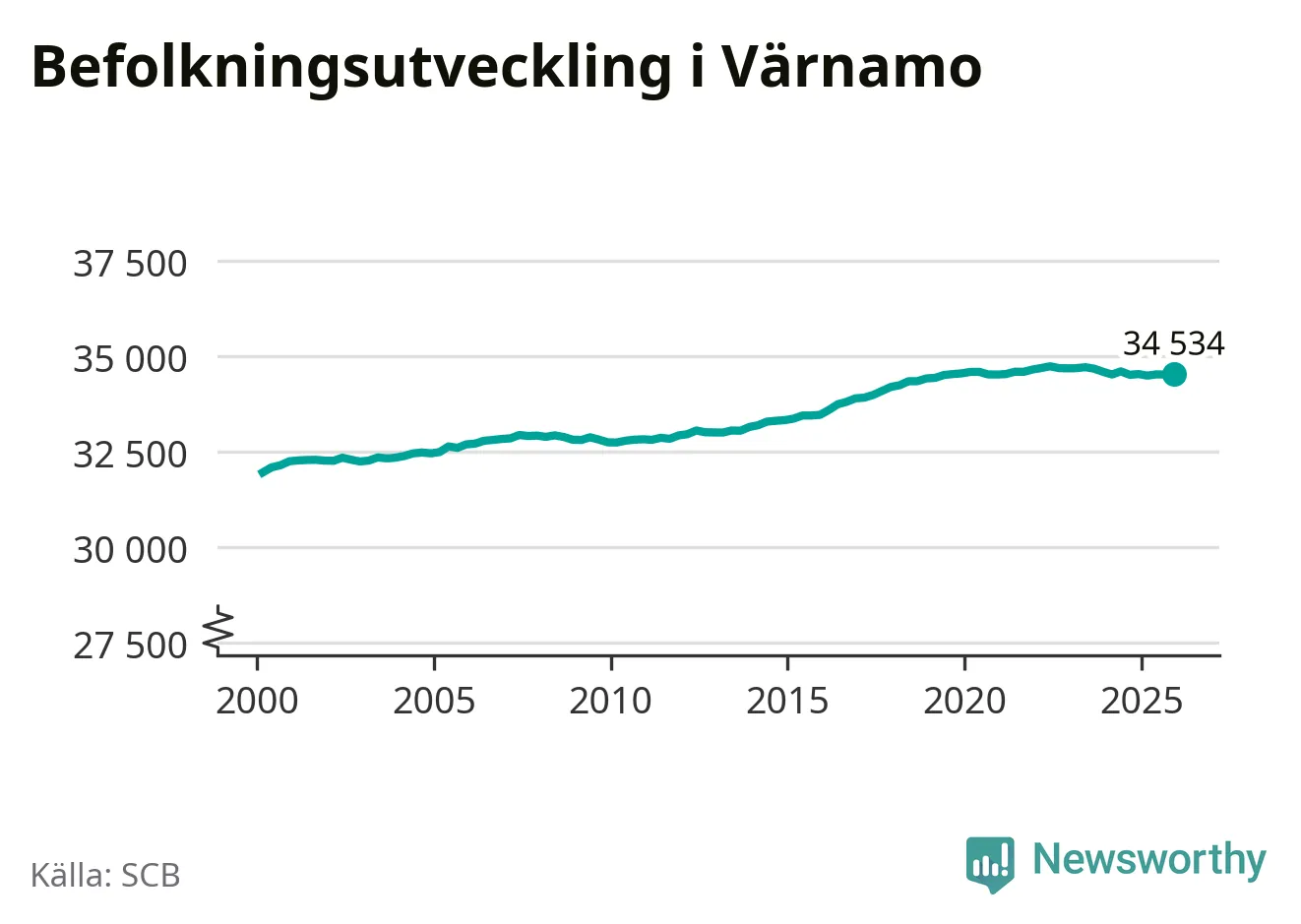 Den 31 december bodde 34 534 personer i Värnamo kommun, enligt SCB:s senaste siffror. Det är något fler än i slutet av tredje kvartalet, men skillnaden är så liten att den lika gärna kan bero på den lilla justering som SCB gör av siffrorna för att skydda enskilda individers identitet.