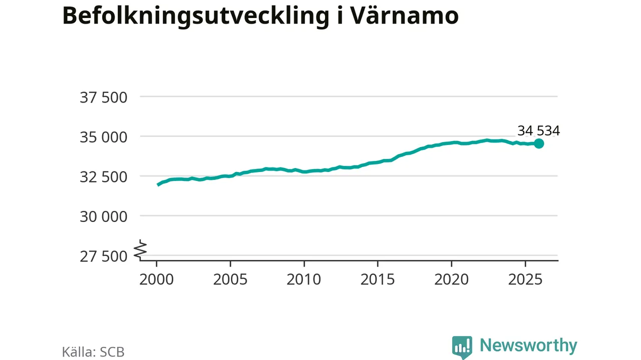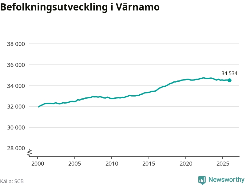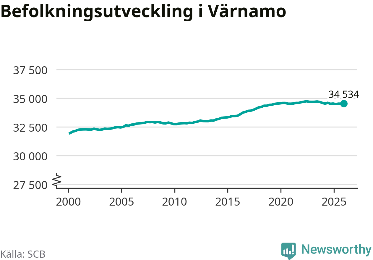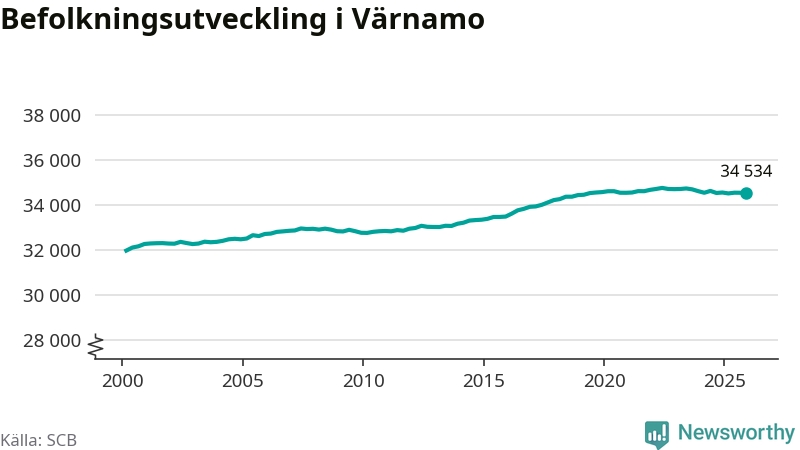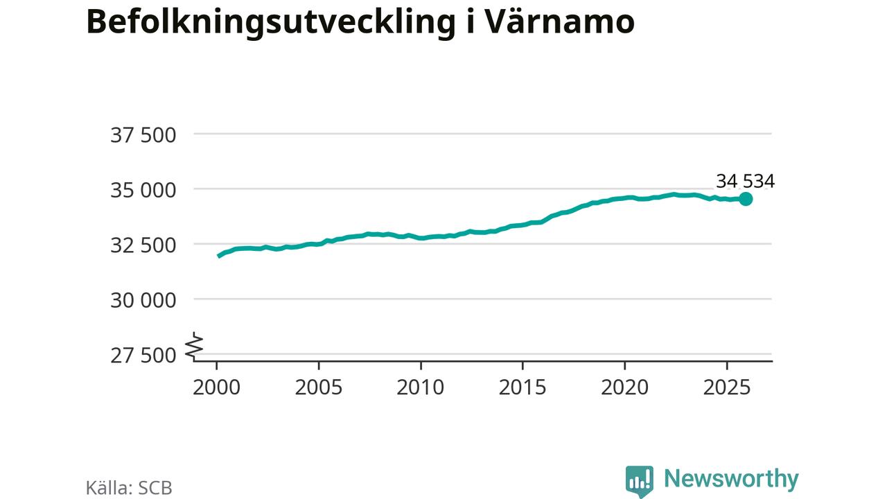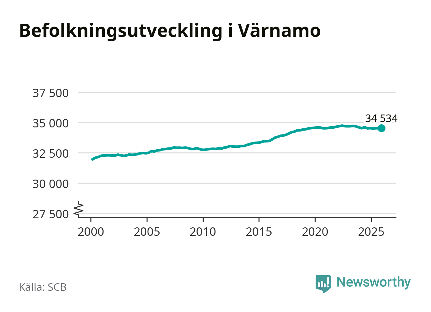 Den 31 december bodde 34 534 personer i Värnamo kommun, enligt SCB:s senaste siffror. Det är något fler än i slutet av tredje kvartalet, men skillnaden är så liten att den lika gärna kan bero på den lilla justering som SCB gör av siffrorna för att skydda enskilda individers identitet.