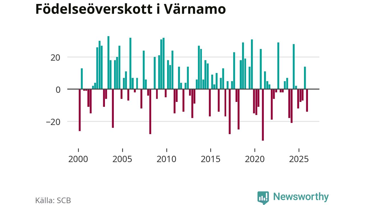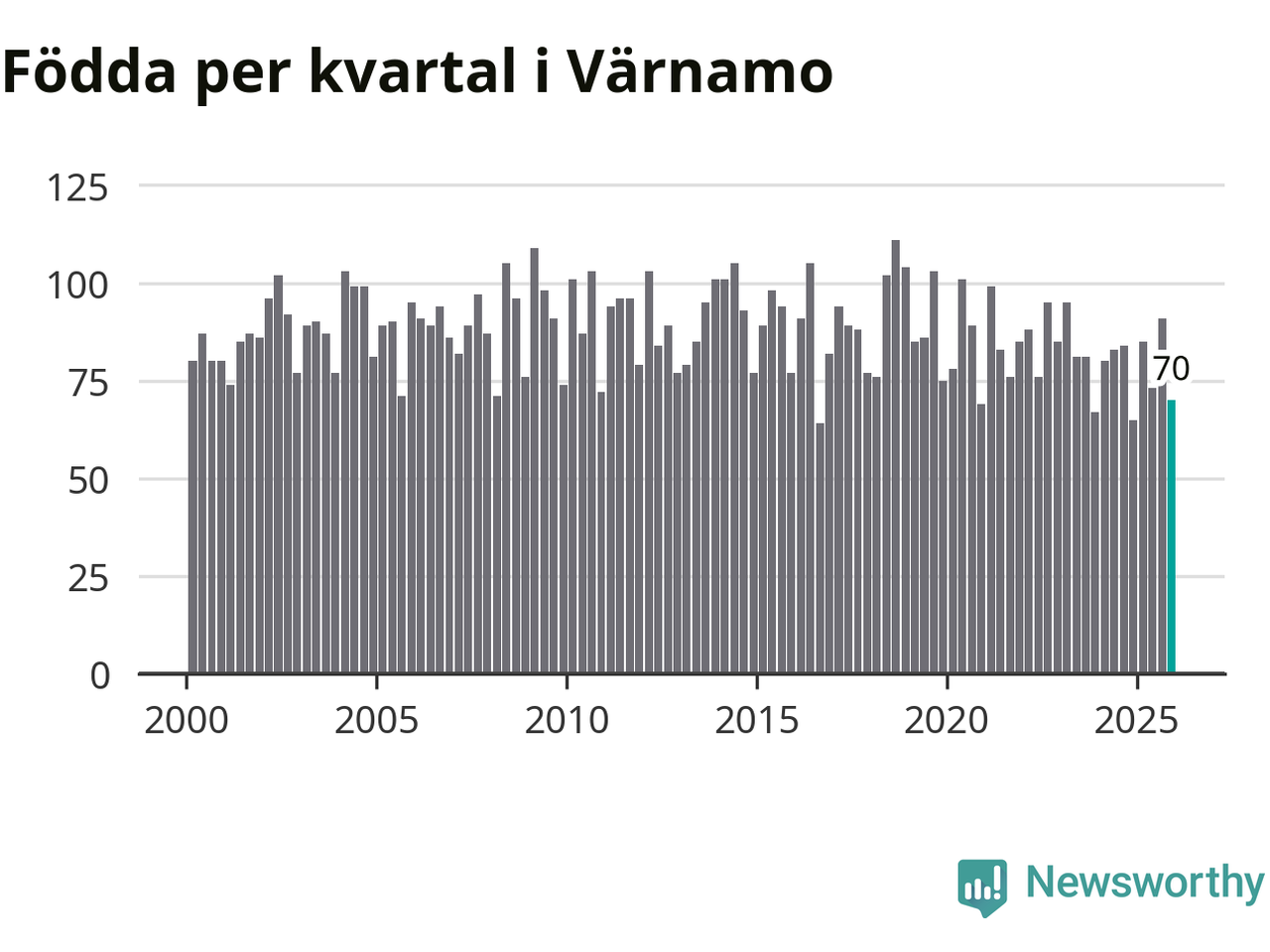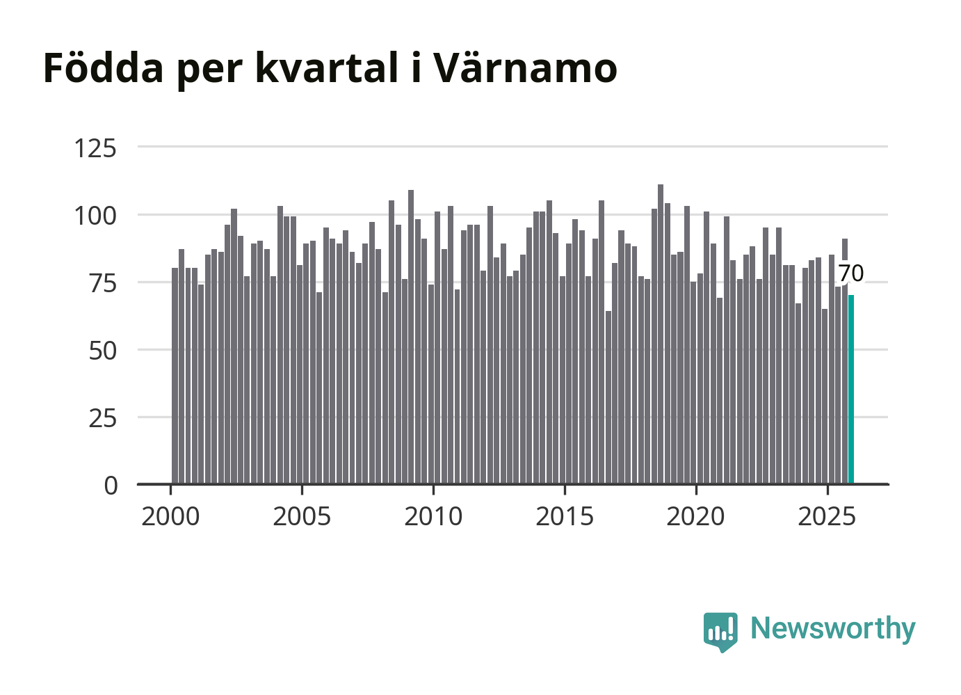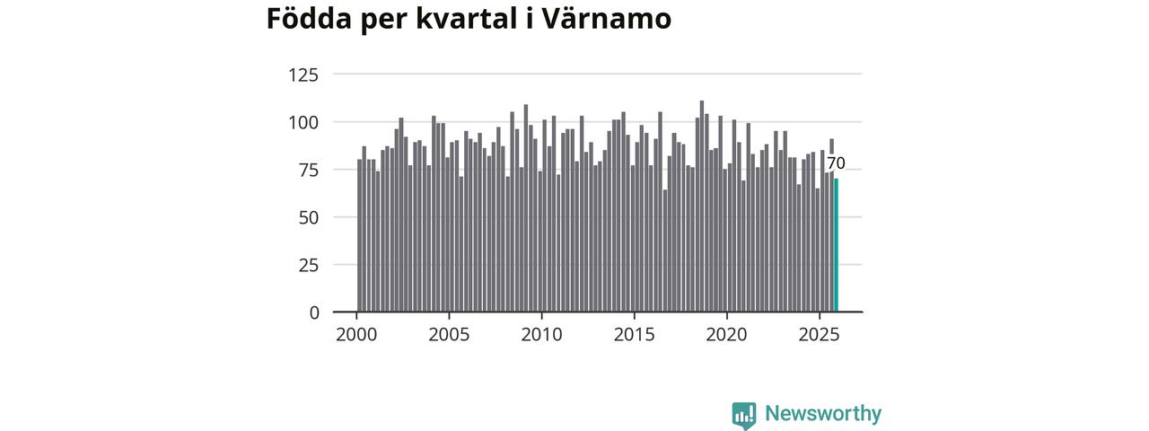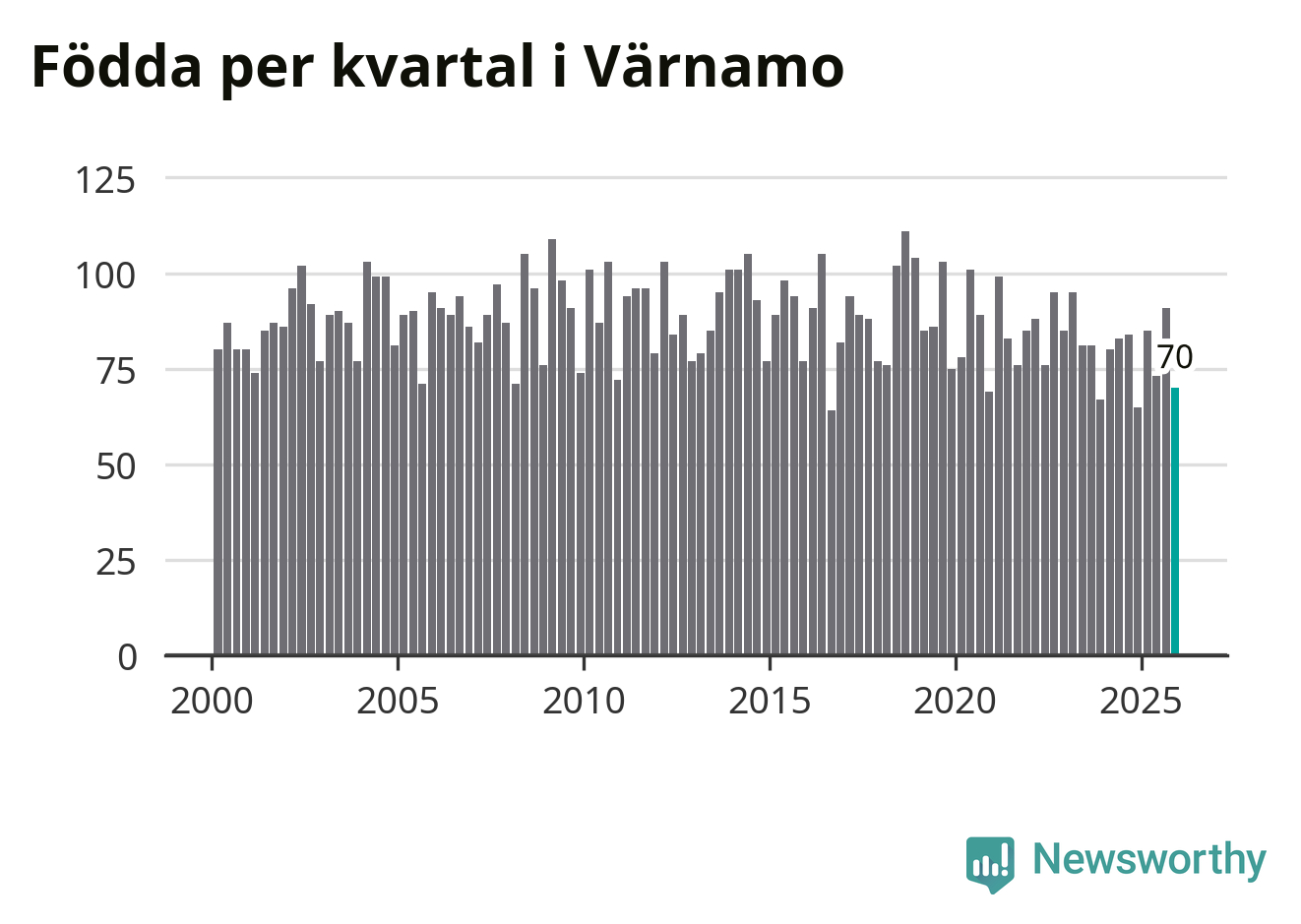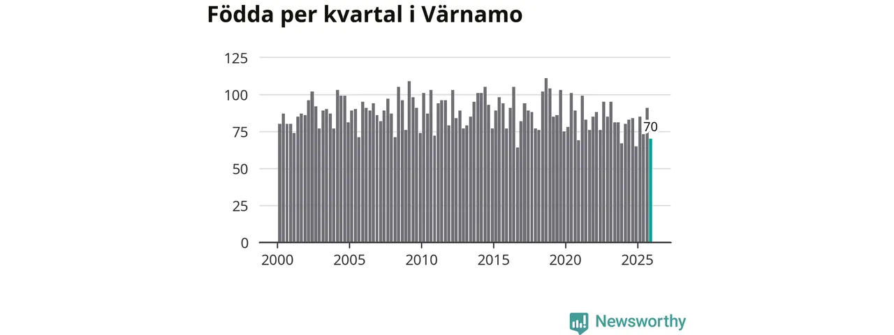 Enligt SCB:s siffror föddes 70 barn i Värnamo under det senaste kvartalet. Samtidigt avled 84 personer. Värnamo hade alltså ett negativt födelsenetto