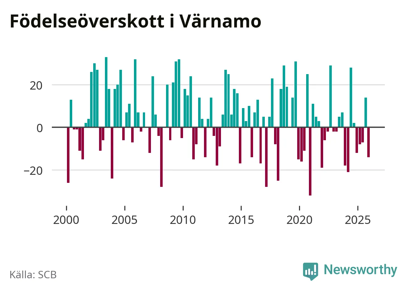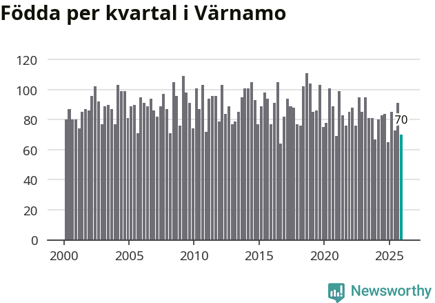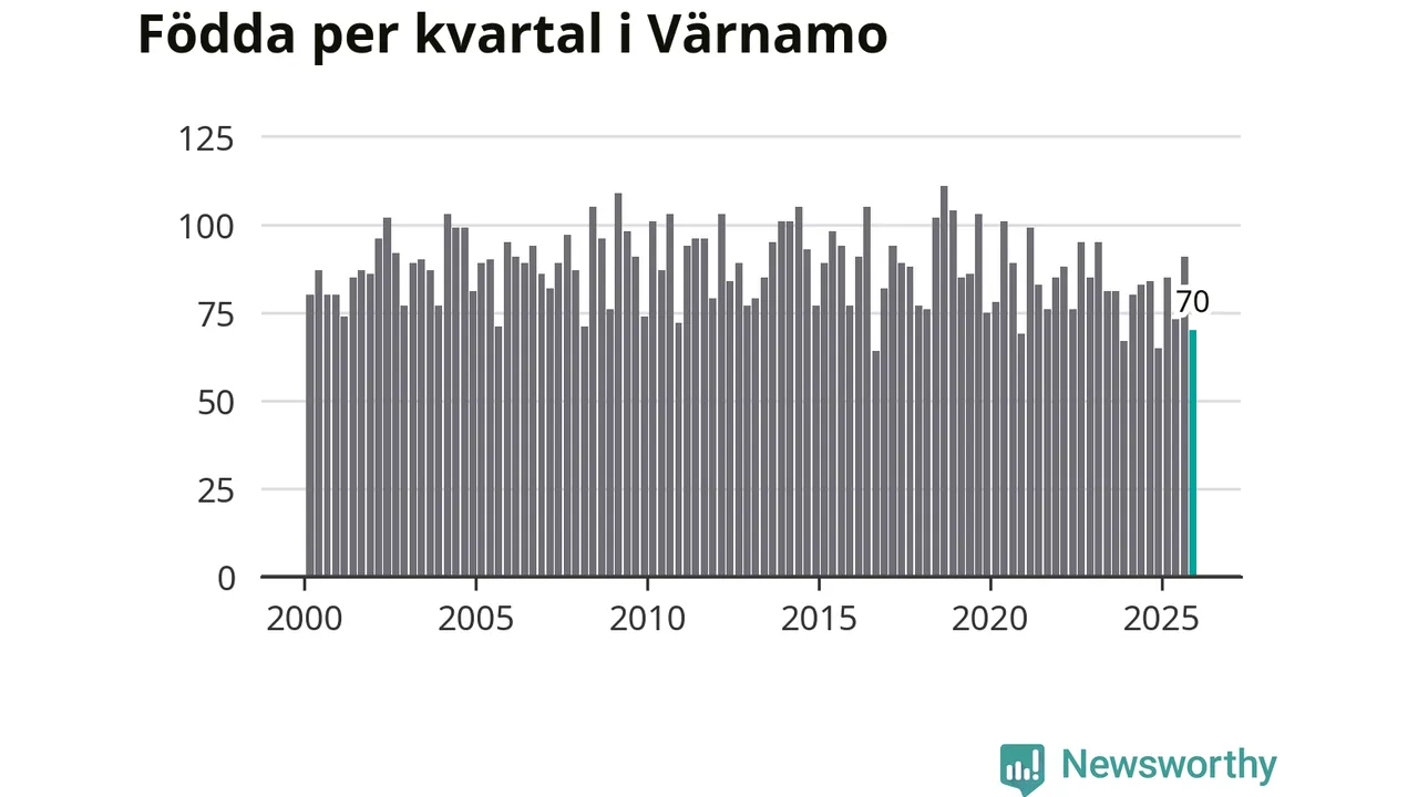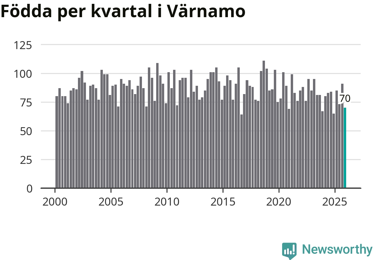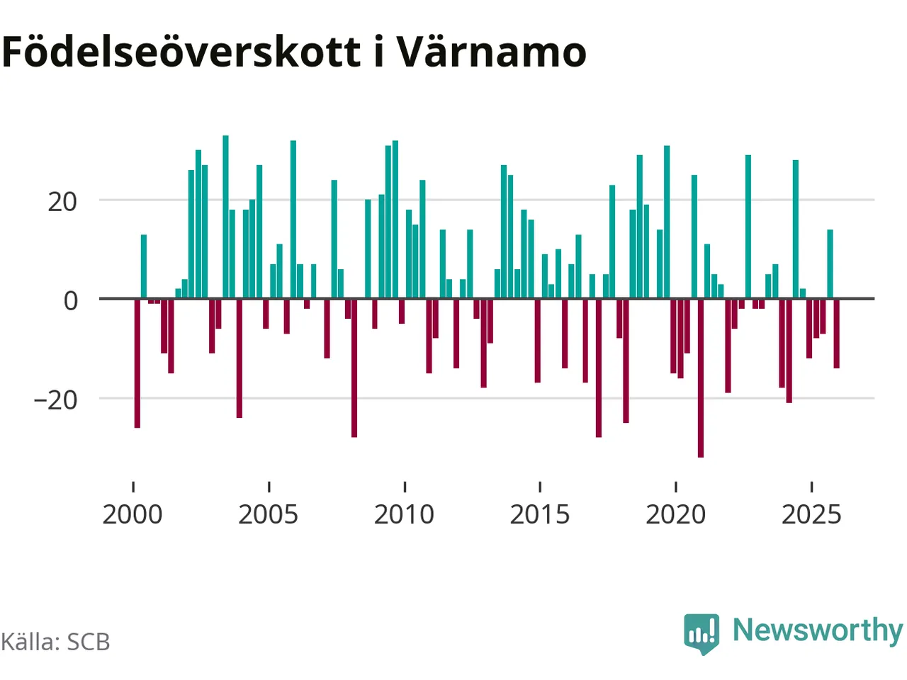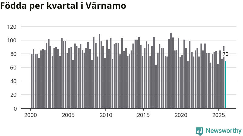 Enligt SCB:s siffror föddes 70 barn i Värnamo under det senaste kvartalet. Samtidigt avled 84 personer. Värnamo hade alltså ett negativt födelsenetto
