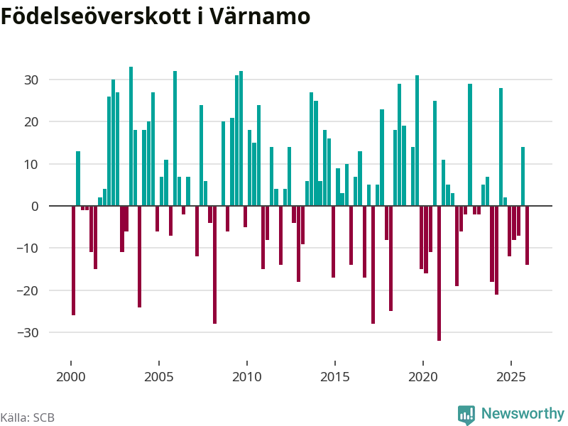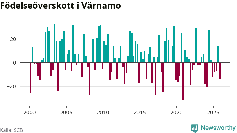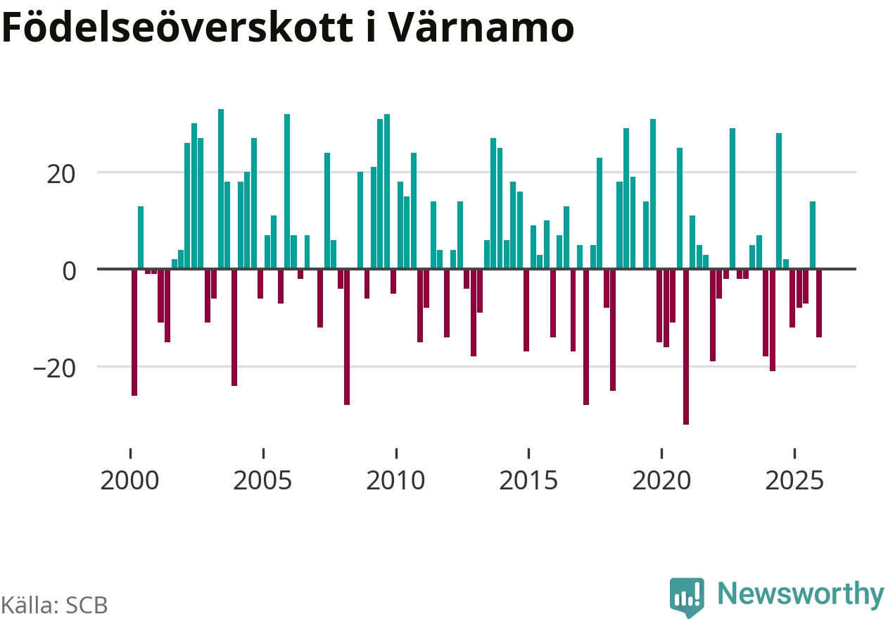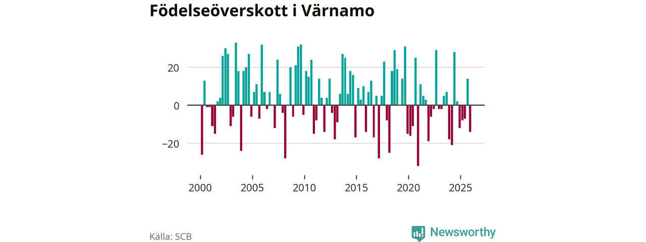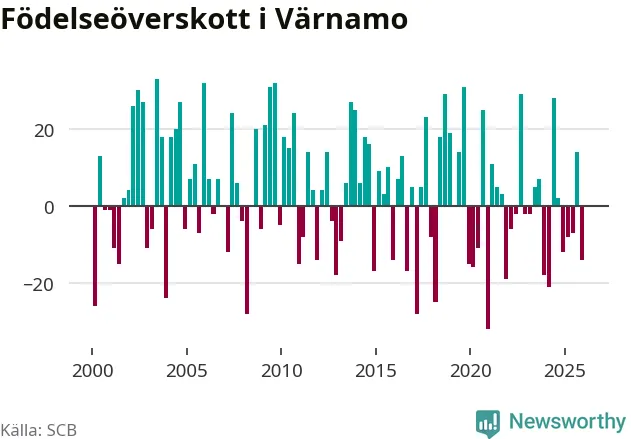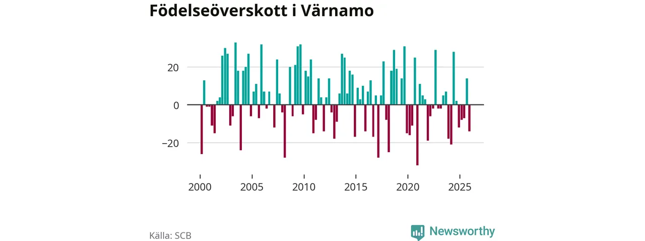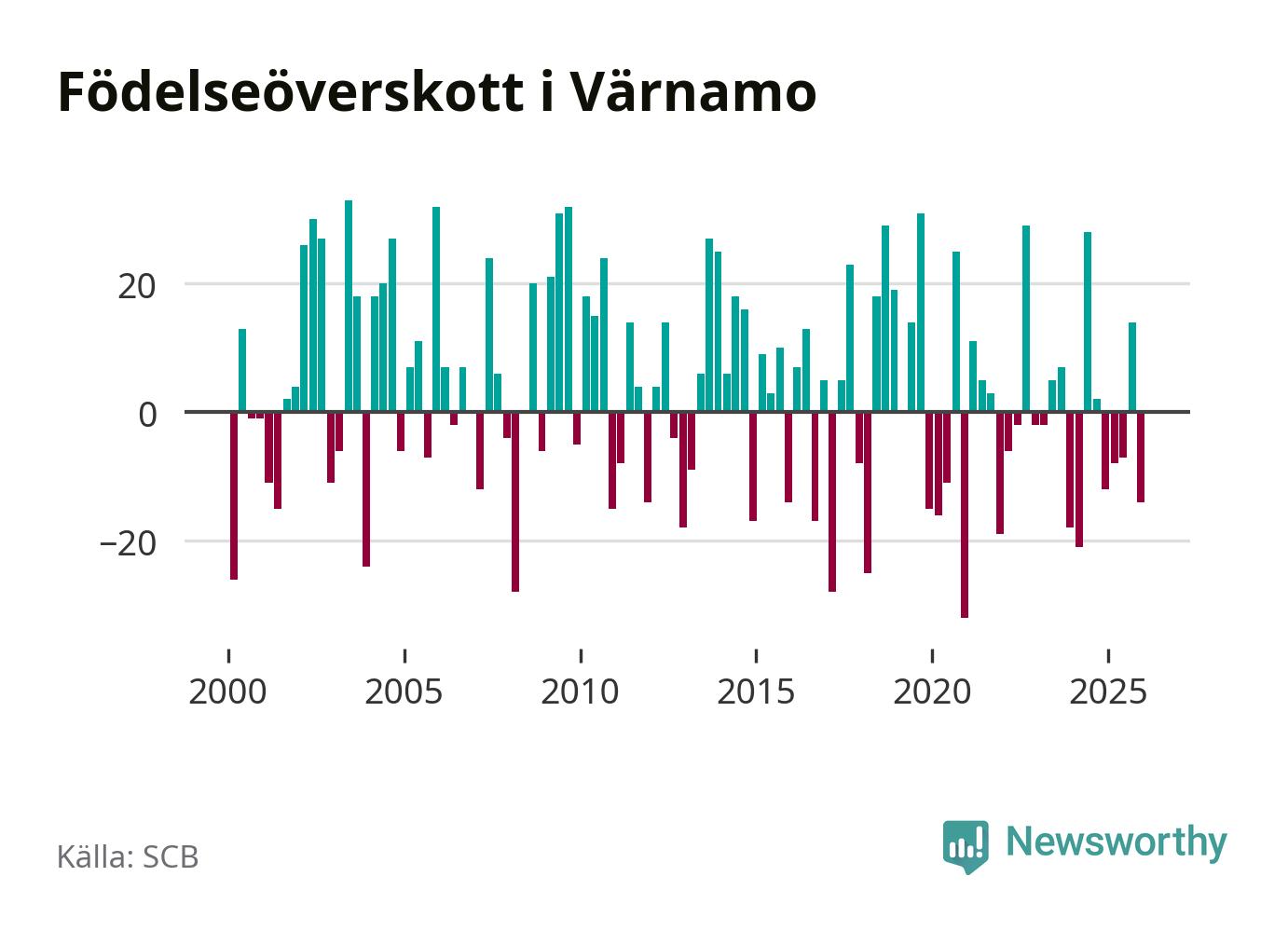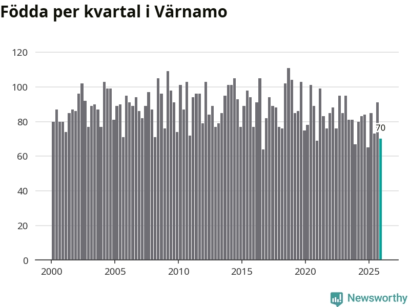Enligt SCB:s siffror föddes 70 barn i Värnamo under det senaste kvartalet. Samtidigt avled 84 personer. Värnamo hade alltså ett negativt födelsenetto
