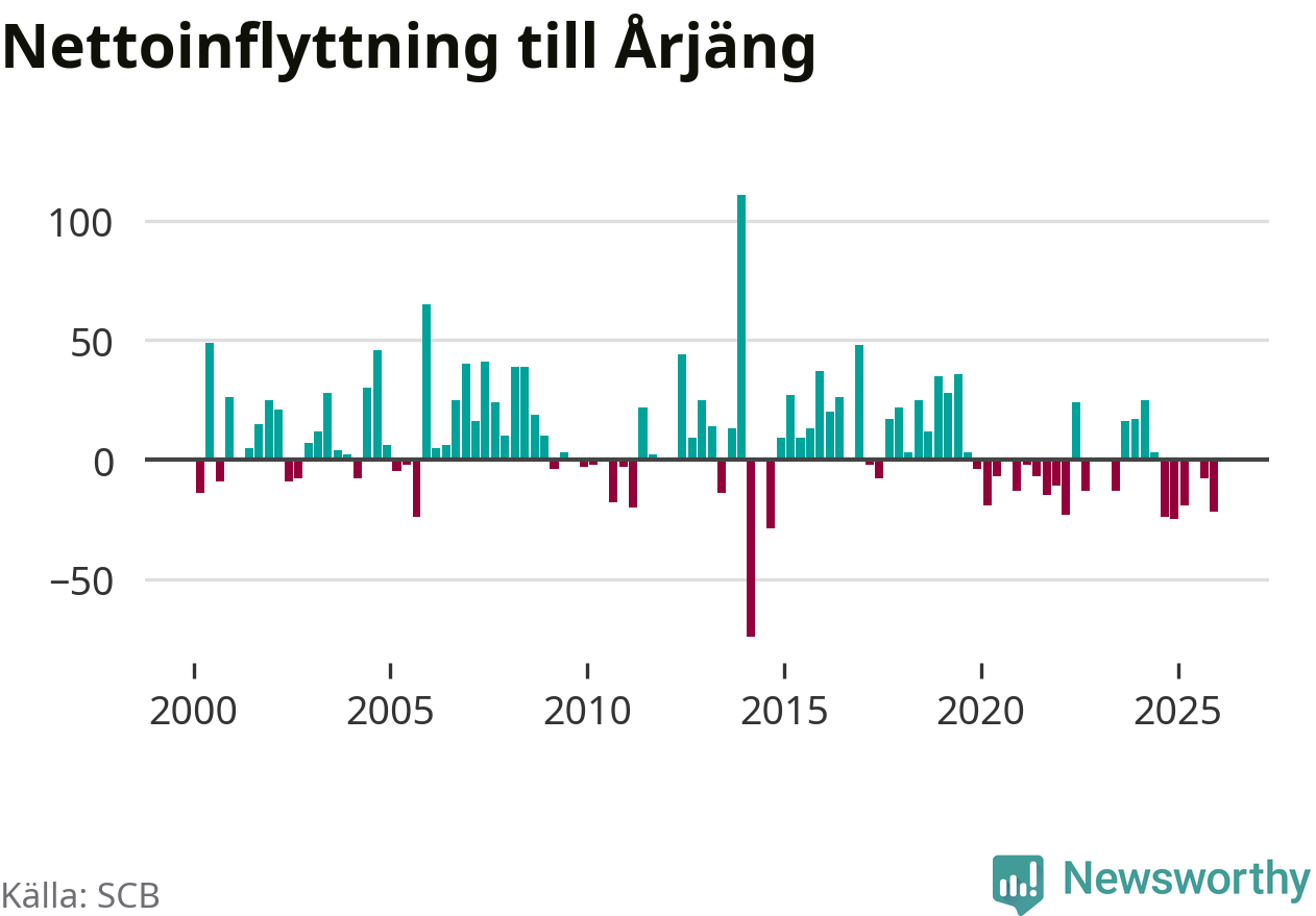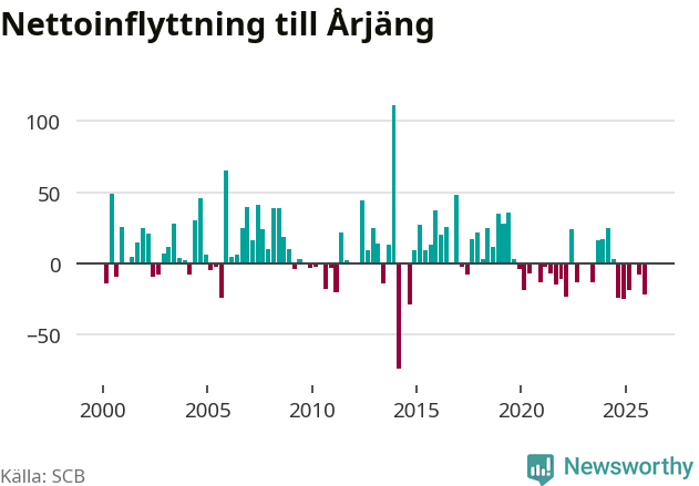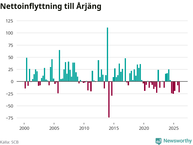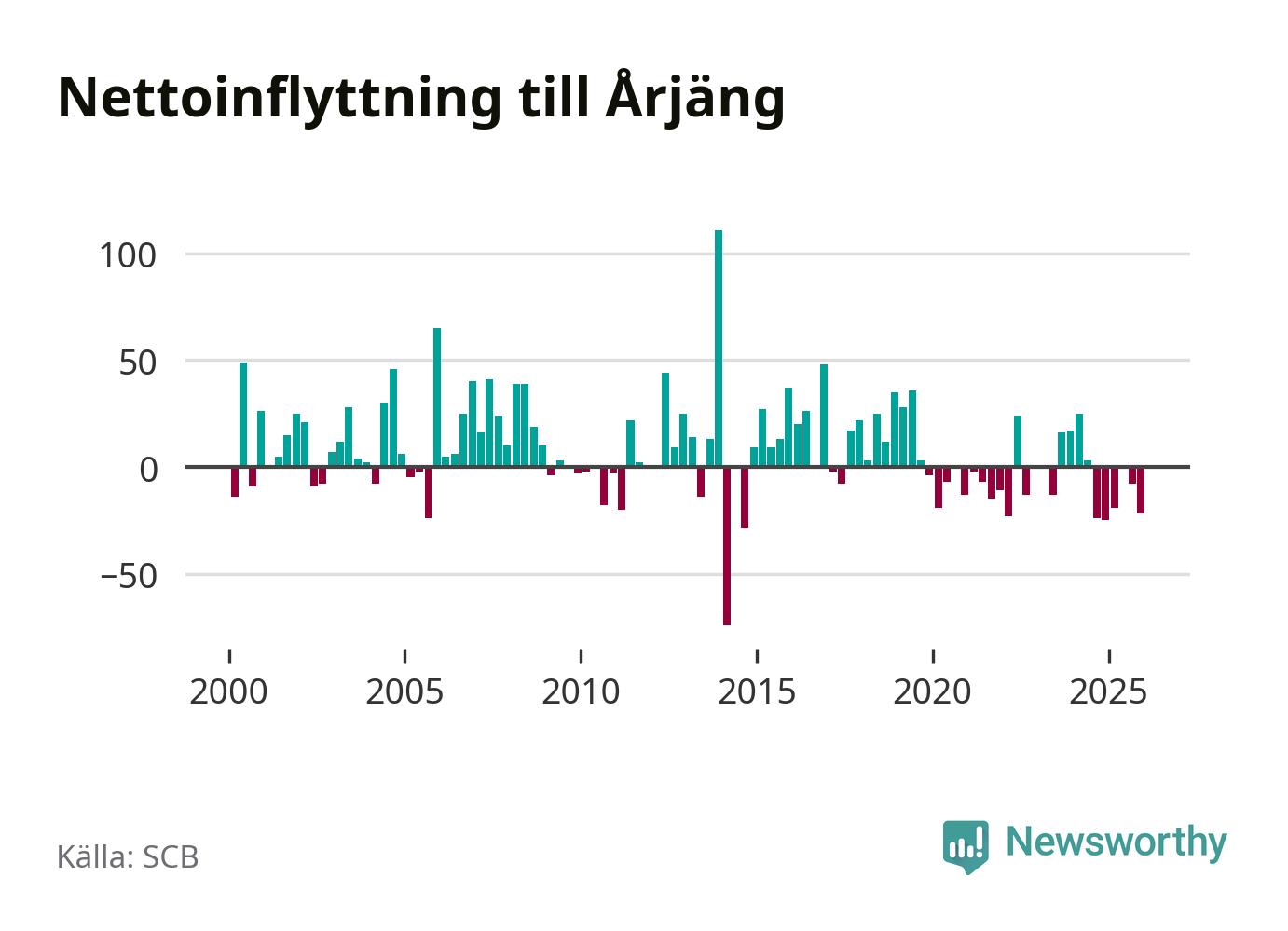 Under fjärde kvartalet 2025 flyttade 62 personer till kommunen medan 84 personer flyttade därifrån. Det är historiskt sett en liten inflyttning under ett kvartal. Sedan seklets början har Årjäng haft ungefär lika många kvartal med positivt flyttnetto som negativt.